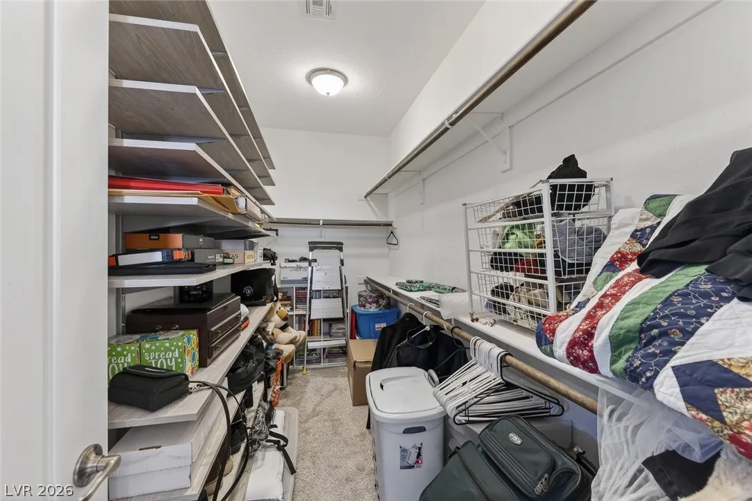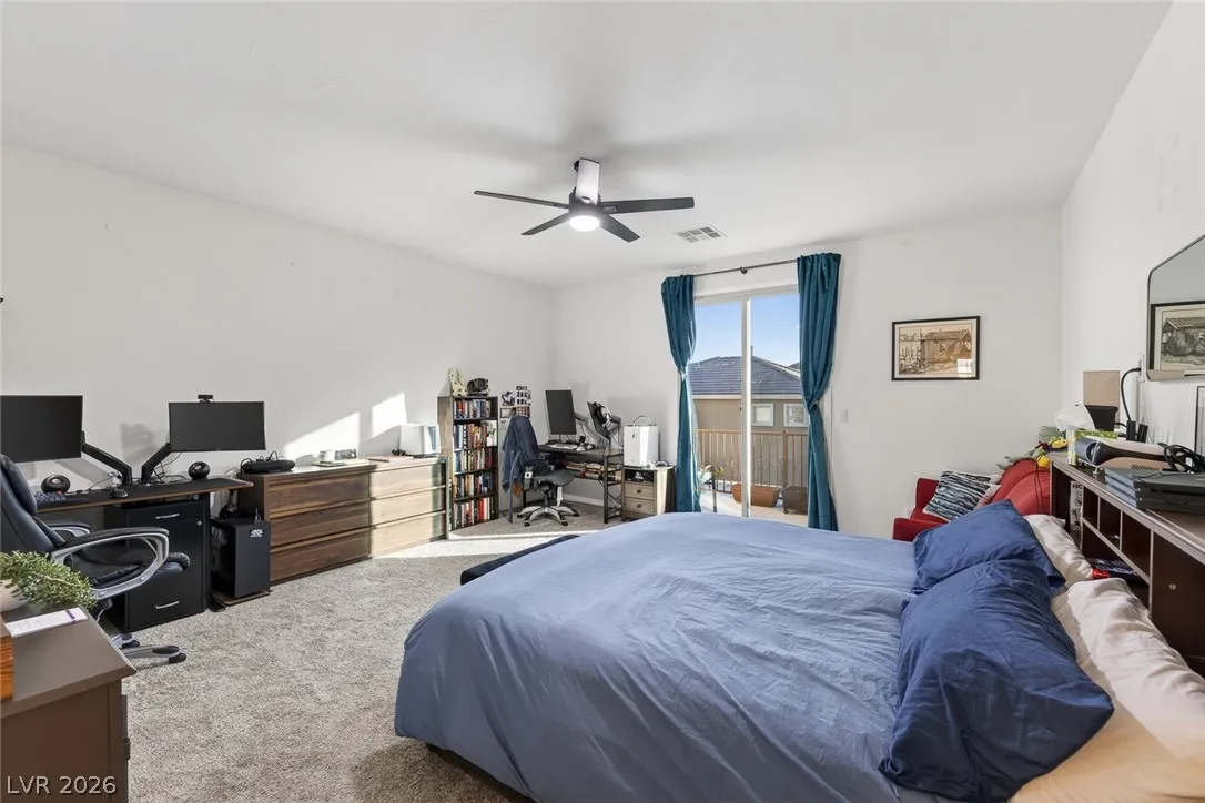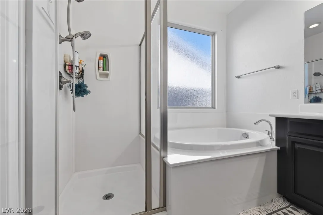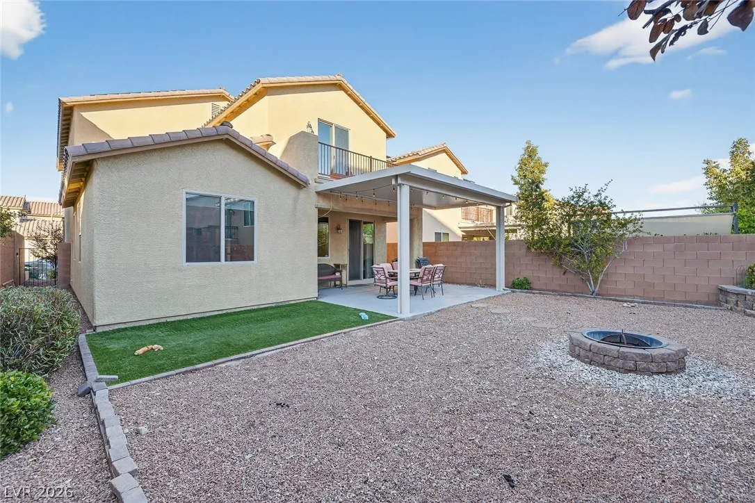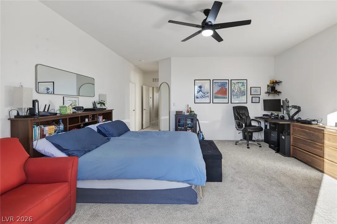Paid-off solar and rare dual primary suites—one on each level—make this upgraded 2,500+ SF NW Las Vegas home stand out. Ideal for multigenerational living, the downstairs suite offers a private en-suite bath, dual closets, and its own laundry hookups. Upstairs, unwind in a spacious primary retreat featuring a spa-inspired bath, two walk-in closets, and a private balcony with stunning mountain views. The open-concept layout is perfect for everyday living and entertaining, showcasing an island kitchen with granite countertops, stainless steel appliances, and abundant natural light throughout. Step outside to a generously sized backyard with a covered patio, ideal for relaxing or hosting gatherings. Located in the sought-after Providence master-planned community, you’ll enjoy easy access to parks, scenic trails, and nearby Mount Charleston. Experience comfort, style, and energy efficiency all in one exceptional home.