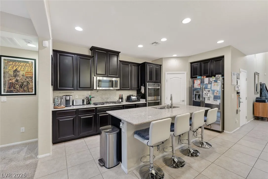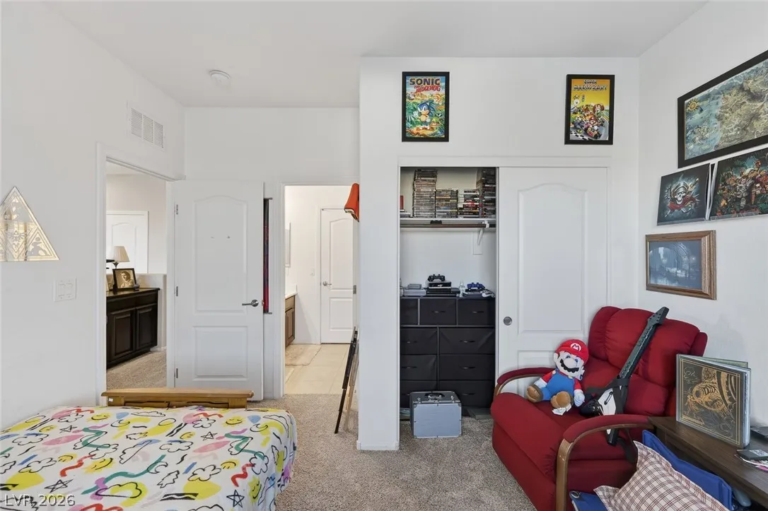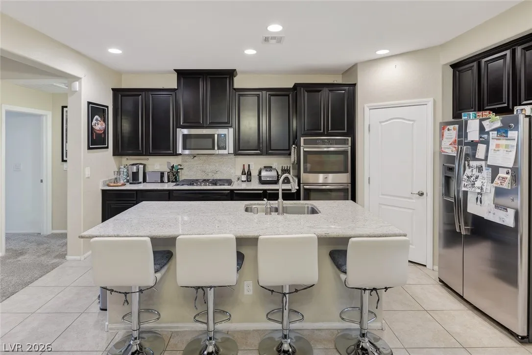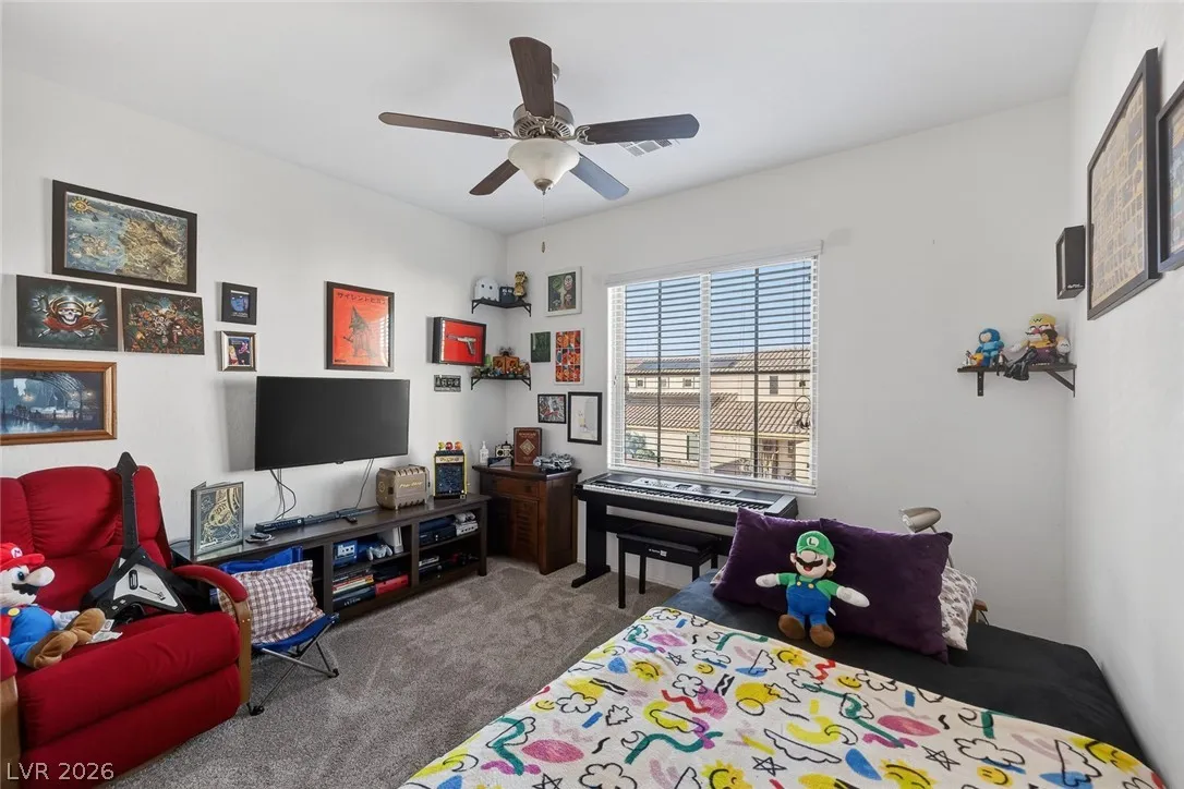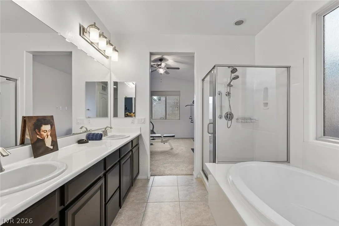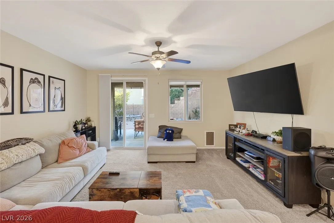 Paid-off solar and rare dual primary suites—one on each level—make this upgraded 2,500+ SF NW Las Vegas home stand out. Ideal for multigenerational living, the downstairs suite offers a private en-suite bath, dual closets, and its own laundry hookups. Upstairs, unwind in a spacious primary retreat featuring a spa-inspired bath, two walk-in closets, and a private balcony with stunning mountain views. The open-concept layout is perfect for everyday living and entertaining, showcasing an island kitchen with granite countertops, stainless steel appliances, and abundant natural light throughout. Step outside to a generously sized backyard with a covered patio, ideal for relaxing or hosting gatherings. Located in the sought-after Providence master-planned community, you’ll enjoy easy access to parks, scenic trails, and nearby Mount Charleston. Experience comfort, style, and energy efficiency all in one exceptional home.