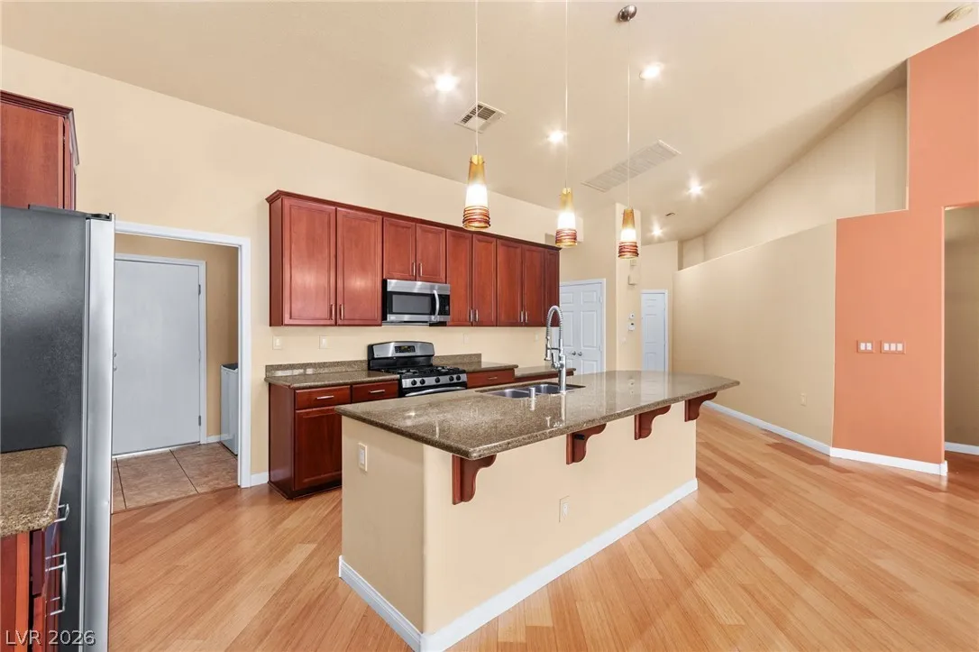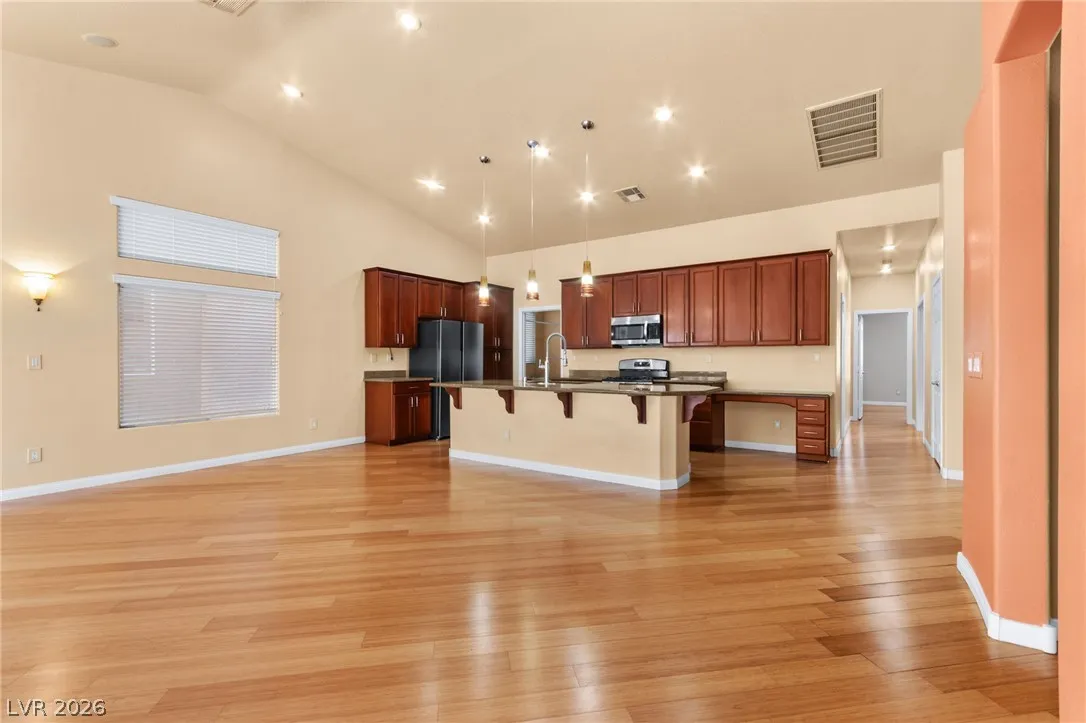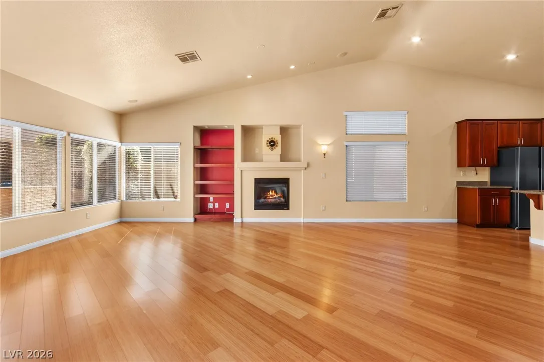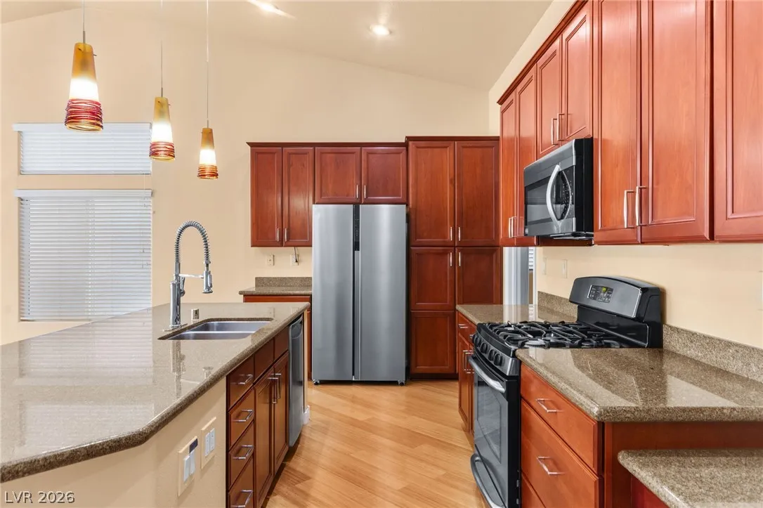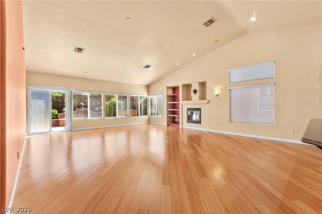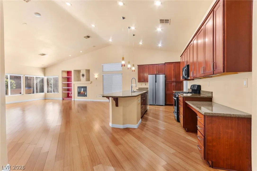 Single-story home with an attached two-car garage, offering 3 bedrooms and an open-concept layout with vaulted ceilings. The spacious living room features a fireplace and flows seamlessly into the kitchen, which includes a center island and granite countertops. The primary suite provides direct access to the backyard, creating a comfortable indoor-outdoor living experience. Ideal layout with open common areas and functional design throughout.