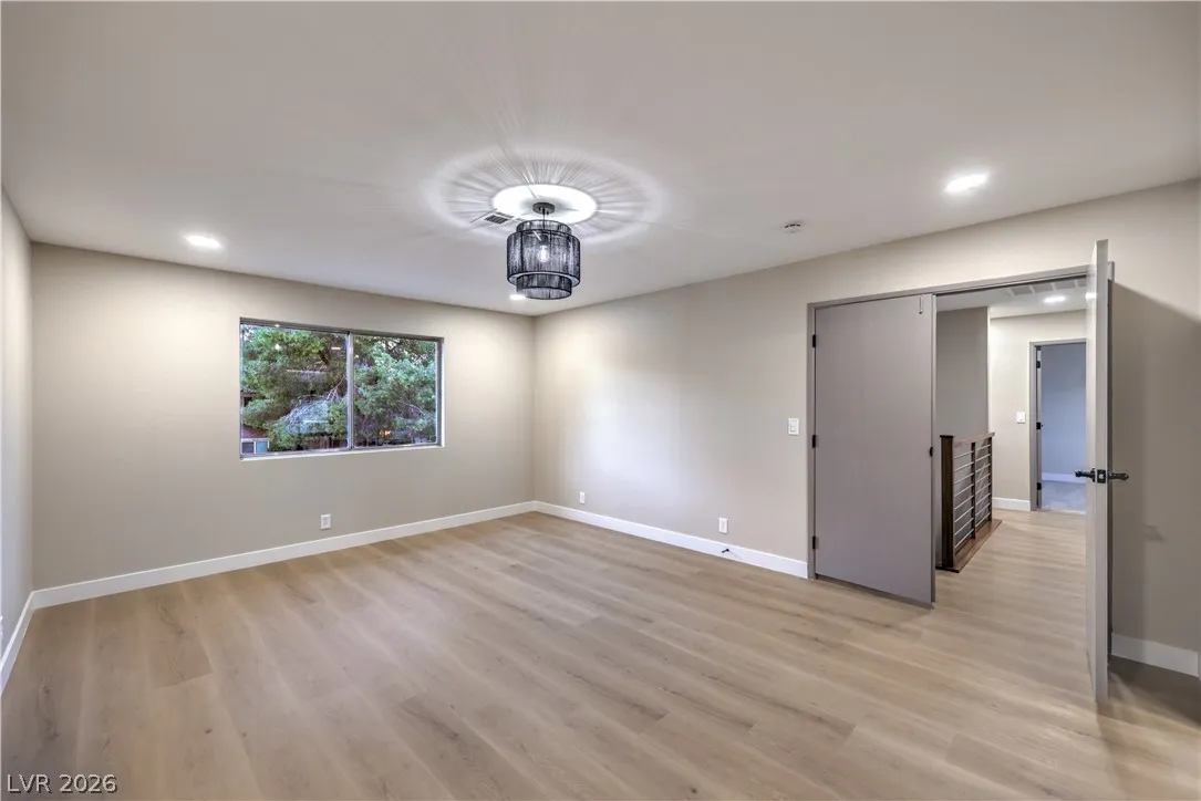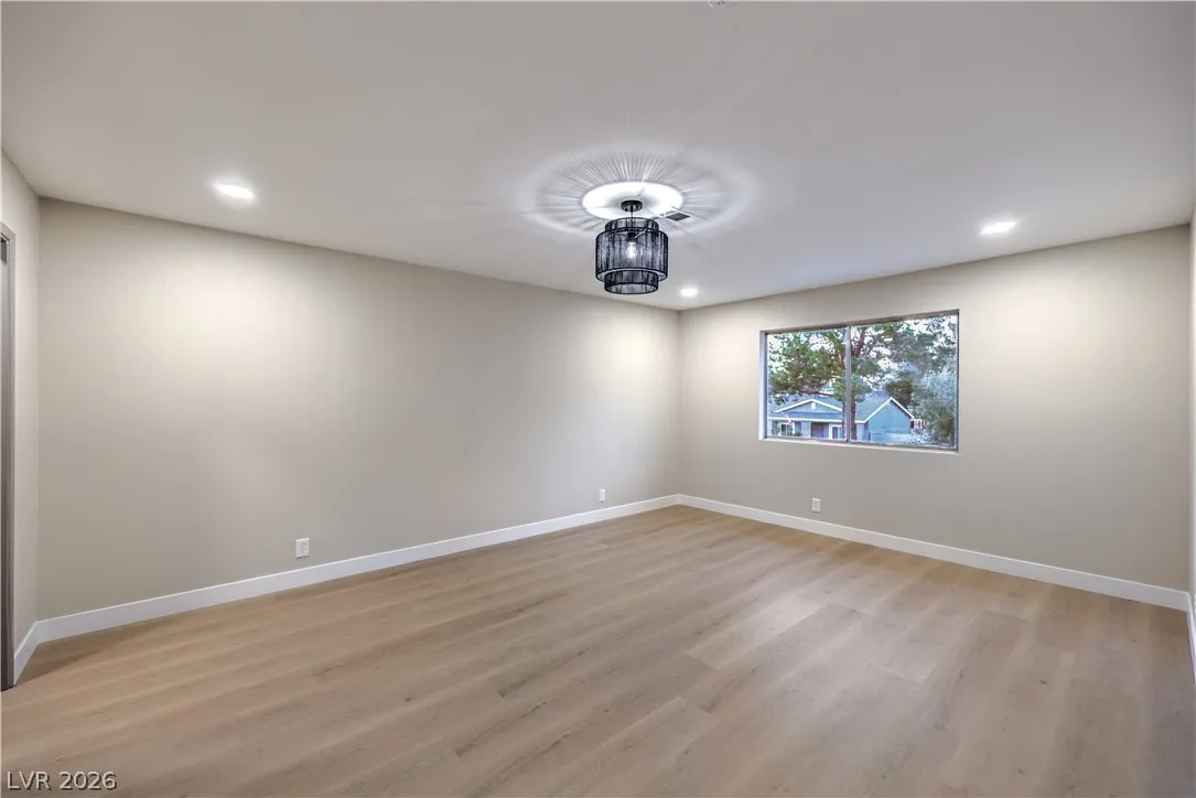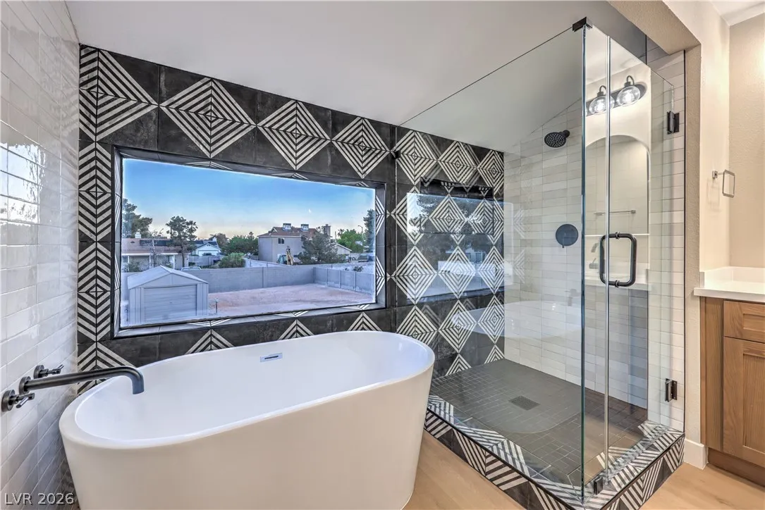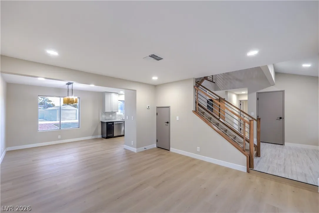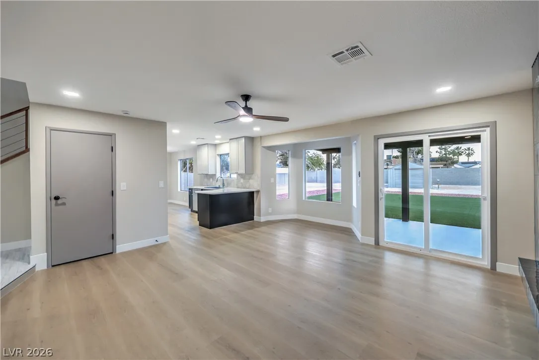 Enjoy this beautifully remodeled 4-bed home featuring a first-floor ensuite with a full bathroom and kitchenette—ideal for guests or multi-generational living. Conveniently located less than 10 minutes from the N.Las Vegas Airport, this property sits on over a 1/4-acre lot w/gated RV parking, a spacious backyard, an attached covered patio, & a storage shed. Inside, you’ll find an abundance of natural light, an open-concept floor plan, modern light fixtures, an accent living room wall with a custom floor-to-ceiling tiled fireplace, ceiling fans, plush carpeting, & laminate wood flooring throughout. The upgraded kitchen offers a garden view, recessed lighting, shaker-style cabinetry, custom countertops with sleek silver hardware, stainless steel appliances, & a breakfast bar w/seating. Bathrooms have been thoughtfully updated with new vanities, framed mirrors, contemporary lighting, modern tiled showers w/built-in niches, a separate soaking tub, and rainfall shower heads. Move-in ready!