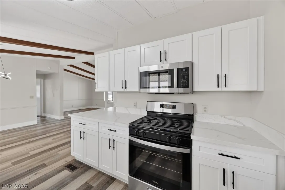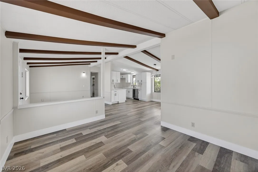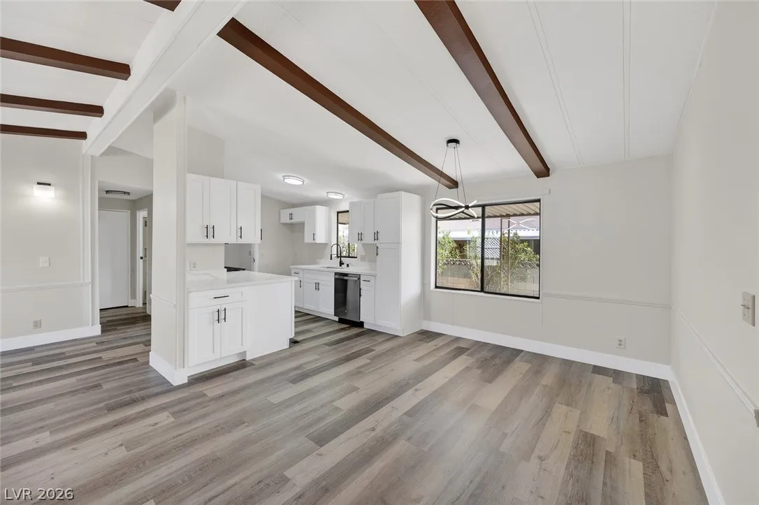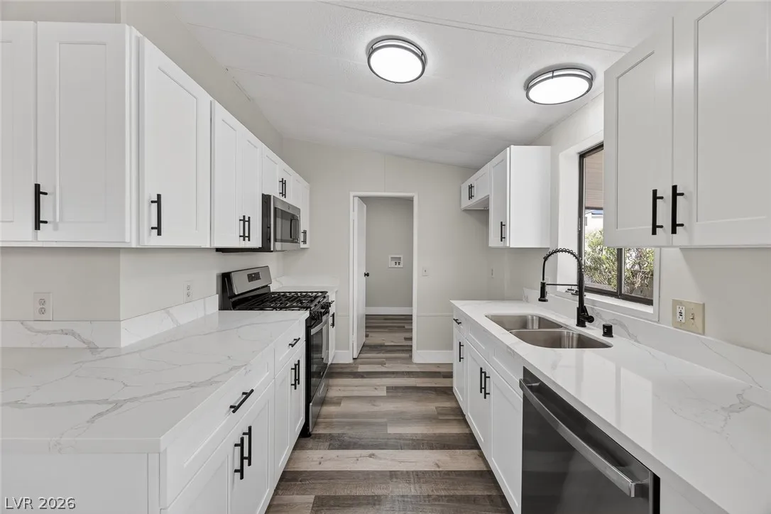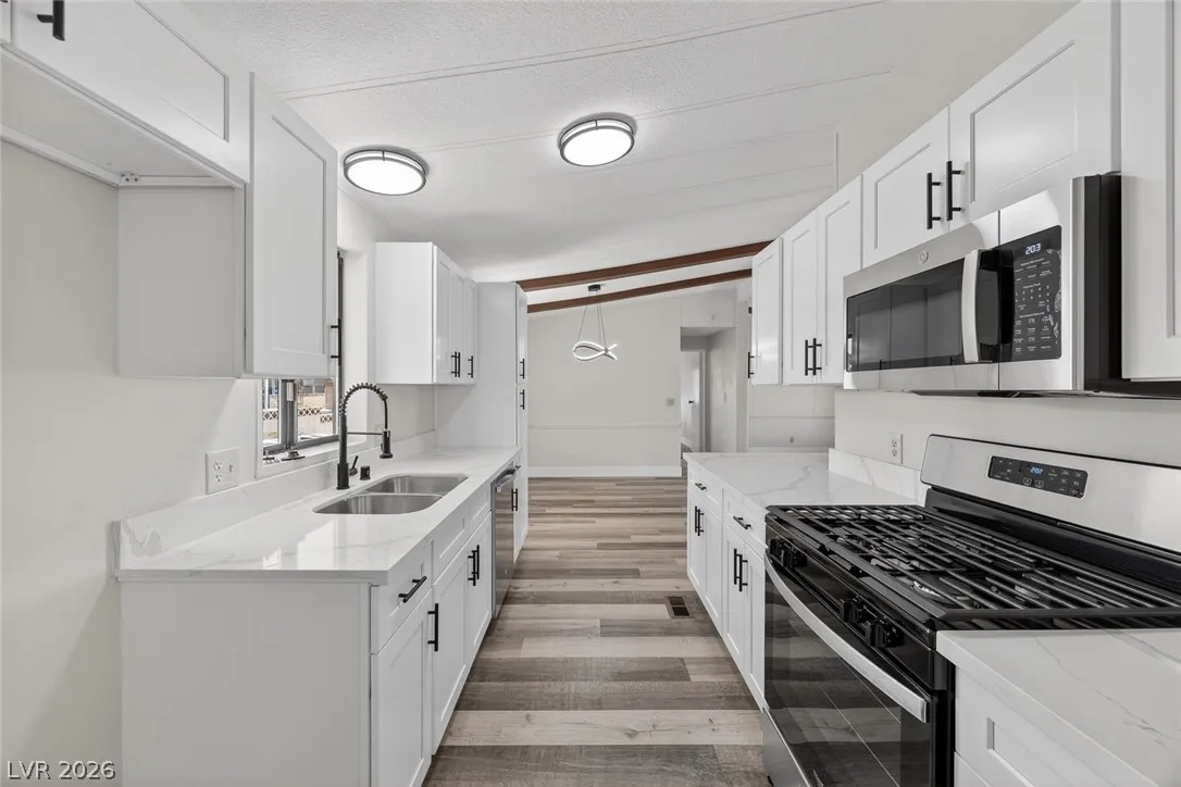 Welcome to this stunningly remodeled manufactured home, converted to real property. This home features NEW luxury vinyl flooring throughout the spacious living areas & all wet zones, combining style and functionality. Step into the HIGHLY upgraded kitchen, where you’ll find NEW Shaker cabinets, NEW stainless steel appliances, & beautiful quartz counter-tops that make cooking a delight! The stylish faux wood ceiling accents add a touch of elegance, complemented by designer fixtures throughout the home. Both the primary and secondary bedrooms are generously sized and boast NEW upgraded carpet, ensuring comfort and warmth. The bathrooms are a true highlight, featuring brand NEW vanities, NEW quartz counters, & custom tile work that adds a spa-like feel. Freshly painted inside & out, this home is move-in ready. The new low-maintenance desert landscaping enhances curb appeal while providing easy upkeep. Don’t miss the opportunity to make this beautifully transformed space your own!