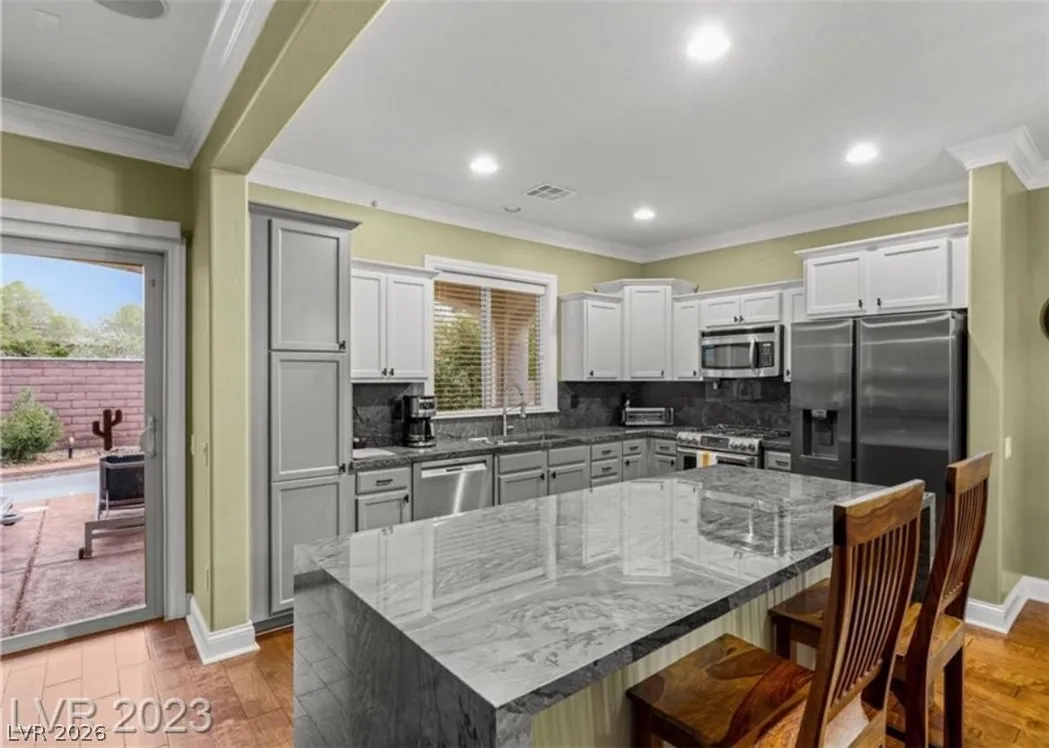 ***FULLY FURNISHED and INCLUDES ALL UTILITES!!!***Welcome to this beautiful 3-bedroom, 3-bath, two-story home with your own private pool and spa—perfect for relaxing or entertaining. The downstairs features a stunning kitchen with a large double waterfall island, sleek slab backsplash, double oven, stainless steel appliances, and elegant wood flooring with crown molding throughout.