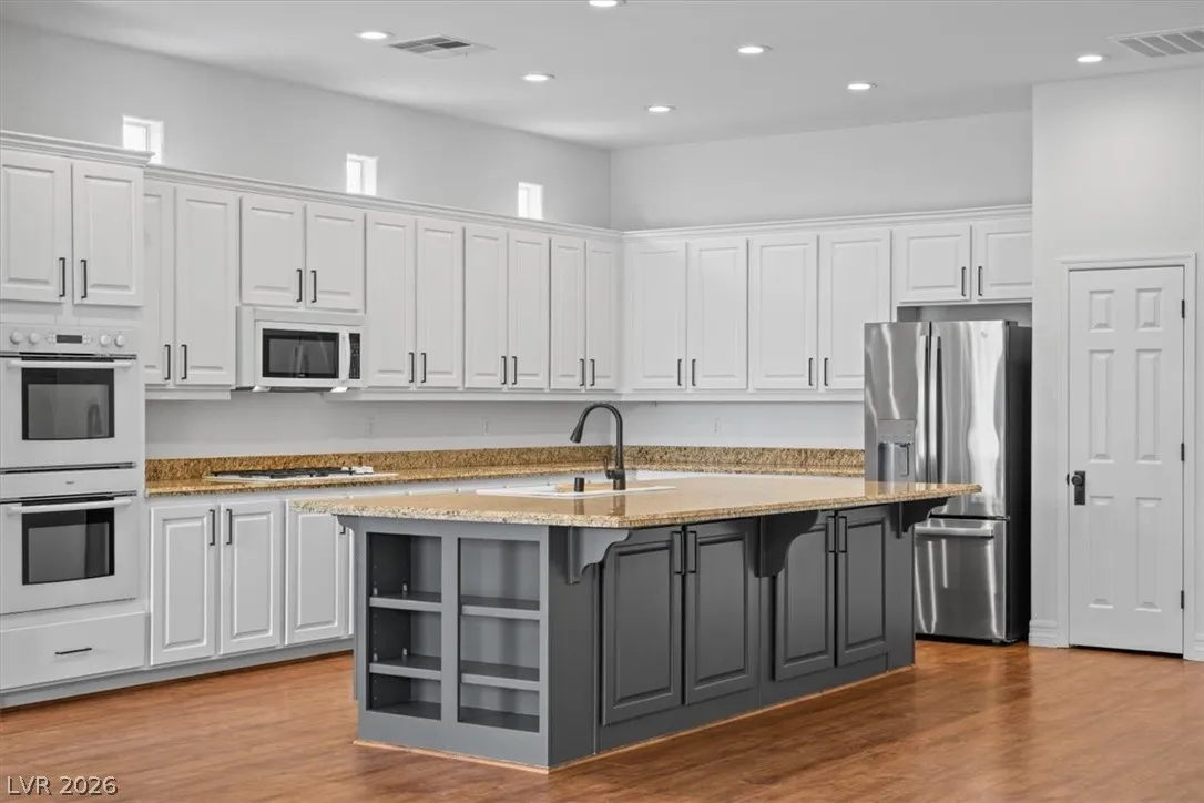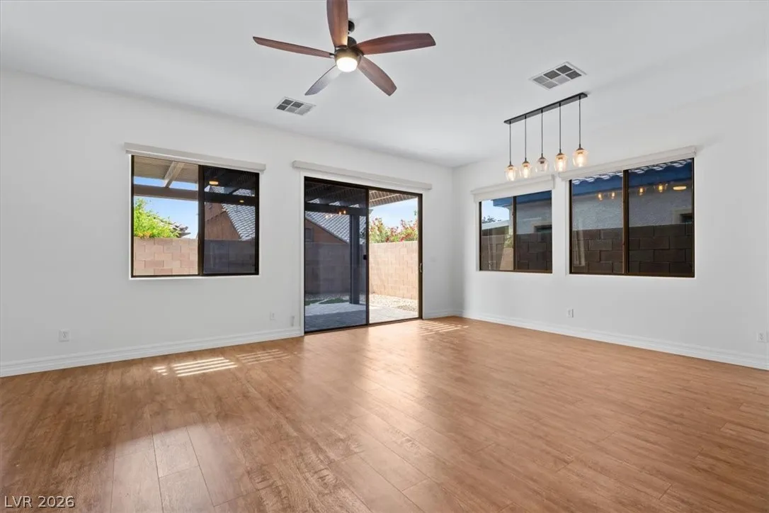 Open flr plan creates seamless flow for daily living & entertaining. Island kitchen w/ granite counters + Bosch appliances opens to main living area. Wood-look laminate flooring in main areas + tall ceilings enhance the open feel.