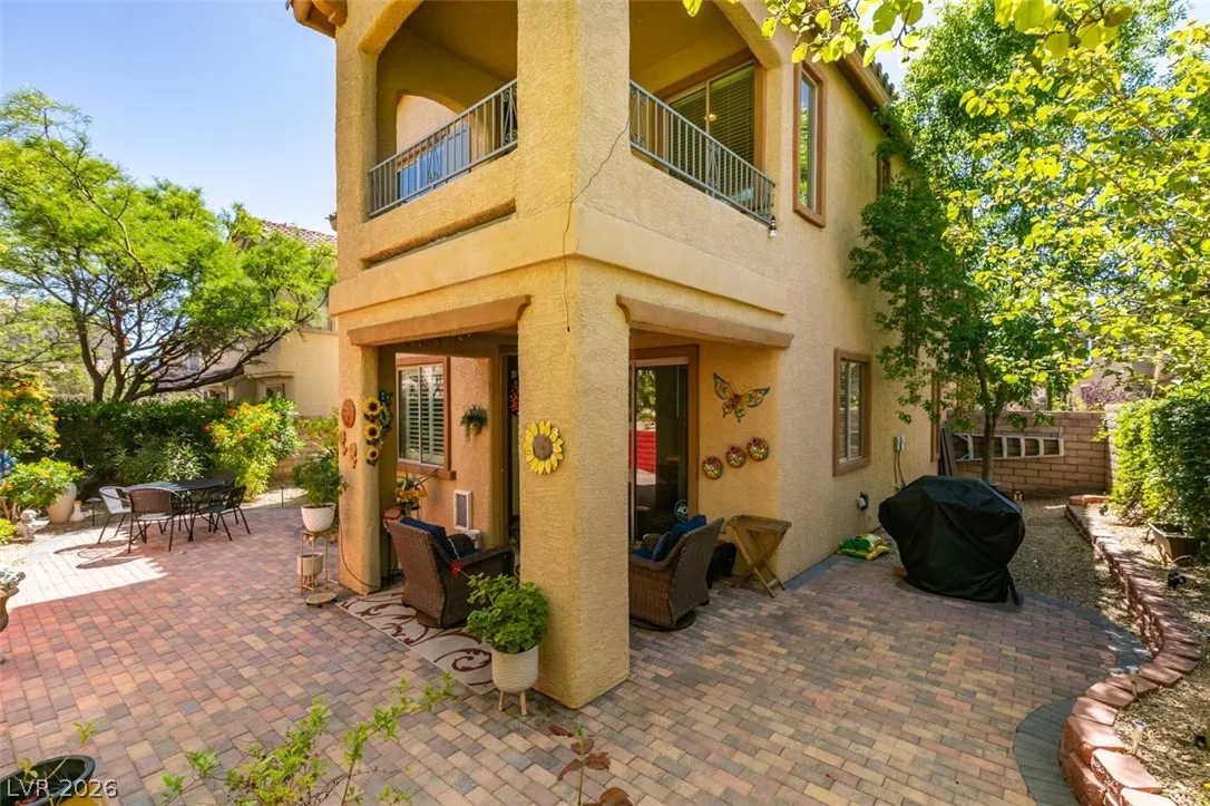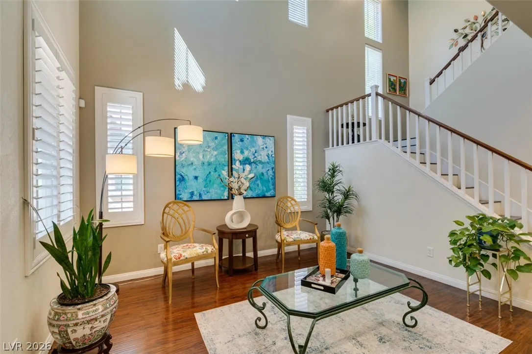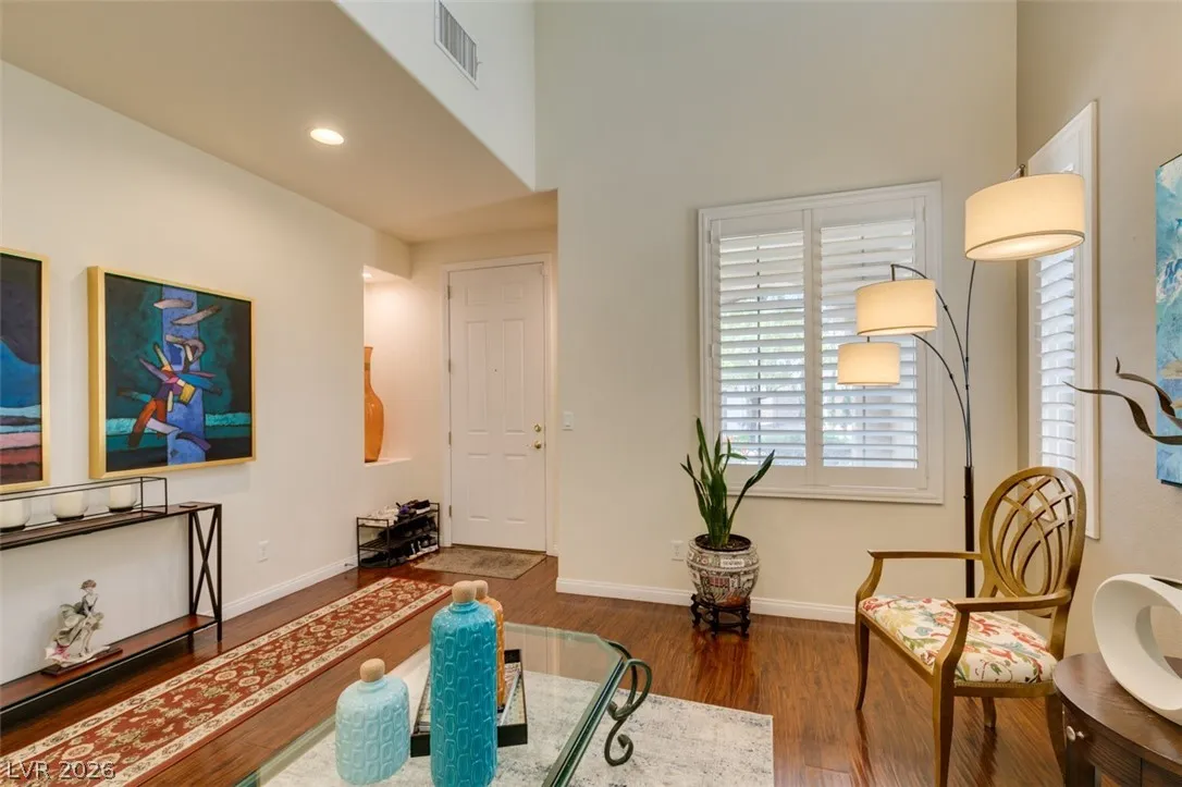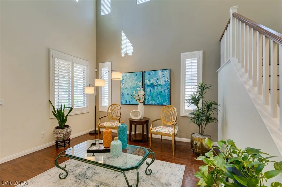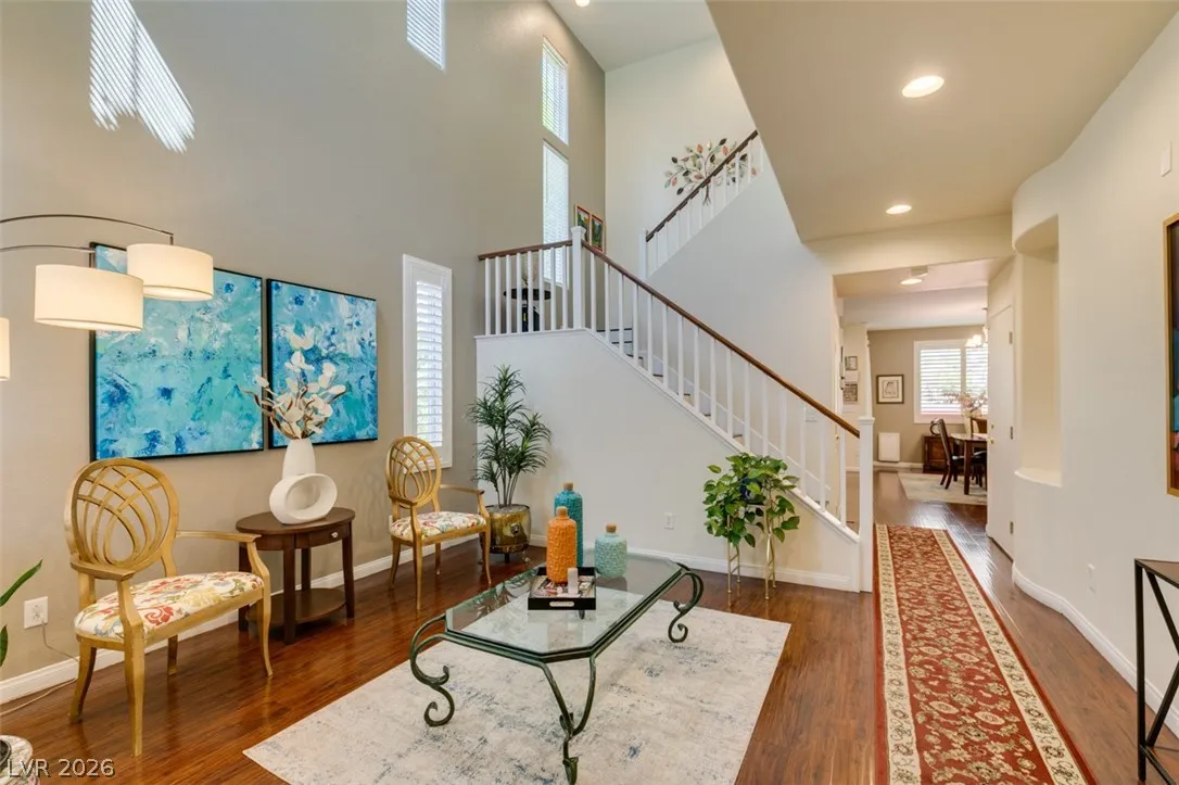 Welcome to your next home, 11832 Arenoso Drive in the highly coveted and sought after Master Plan Community of Summerlin. Step inside to a home with rich hardwood floors (no LVP or laminate), high entry ceilings, formal living room (can serve as a flex space/office), beautiful Switchback Stairs with landing, and a welcoming family room area. The family room is inclusive of the kitchen making evenings cozy and inclusive so you are part of the discussion while preparing meals; excellent for entertaining. The family room is bathed with indirect, natural light since the home is oriented North to South and the gorgeous backyard is visible from the family room, dining room, and kitchen. Upstairs features a flexible loft space, large bedrooms with a shared full bathroom and a very large primary bedroom with a wonderful separate shower and soaking tub. The backyard is a paradise of mature flowers, bushes, and trees attracting beautiful desert hummingbirds. Enjoy the nearby Downtown Summerlin!
