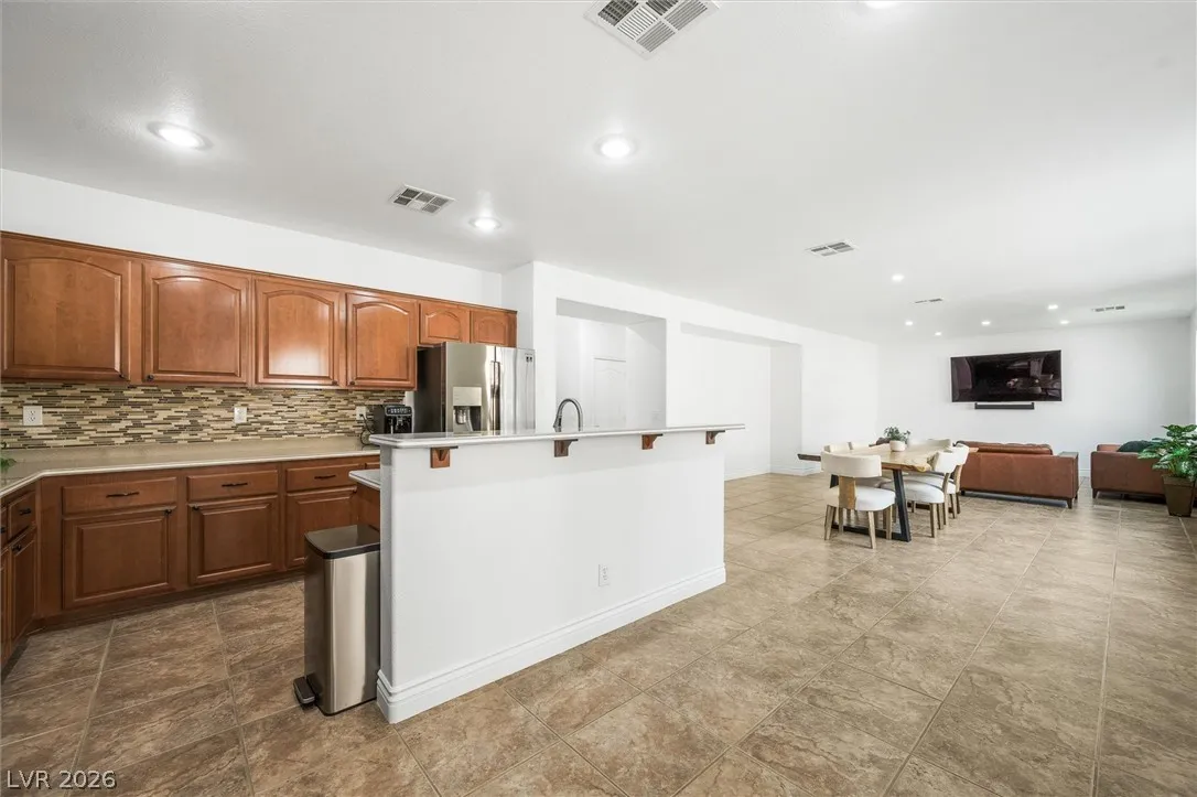 Open-concept layout with tile flooring, custom finishes, and a full bed and bath downstairs. Kitchen features a large island with breakfast bar, stainless steel appliances, tile backsplash, solid surface countertops, and custom cabinetry.