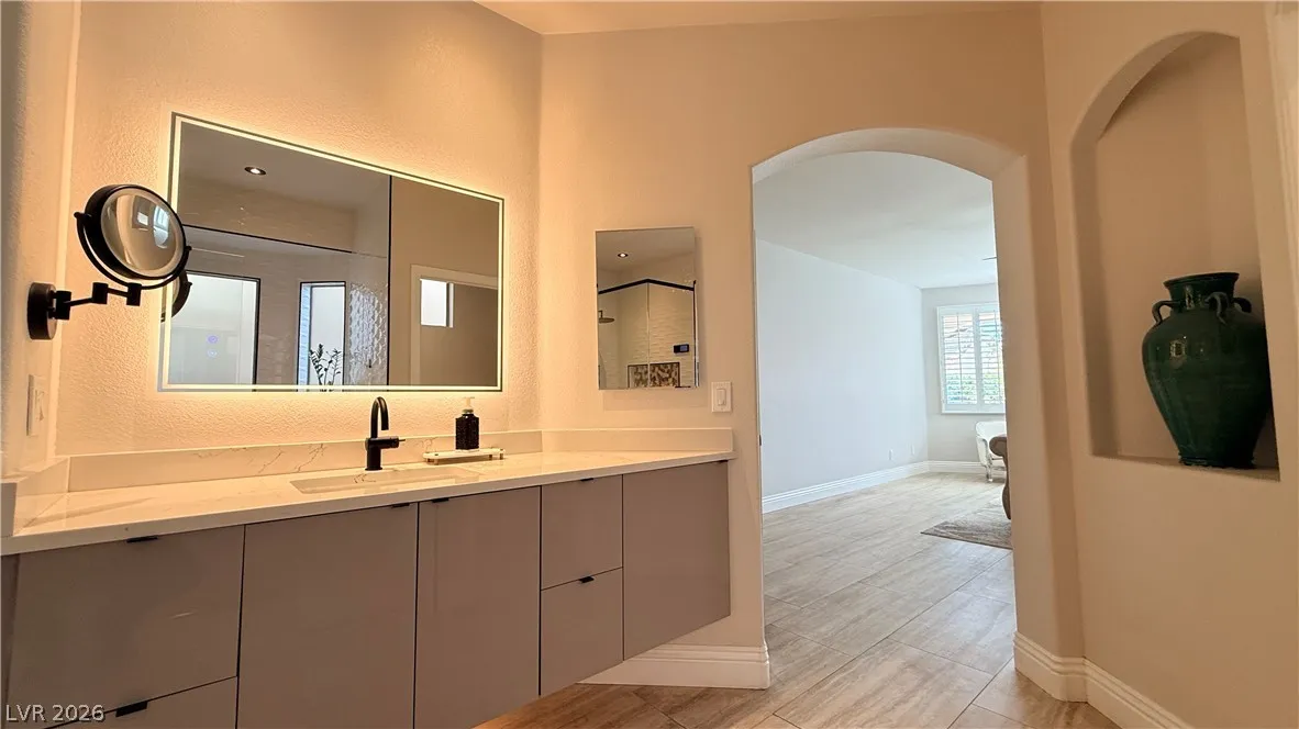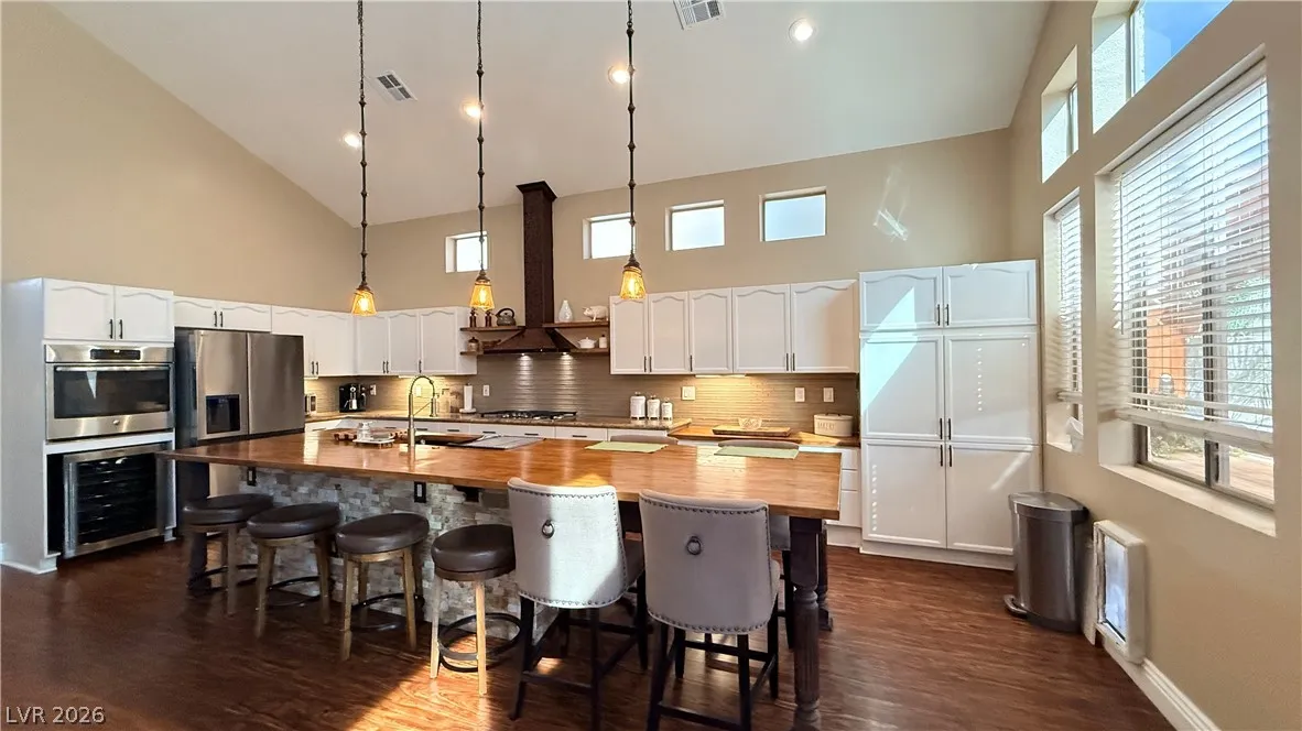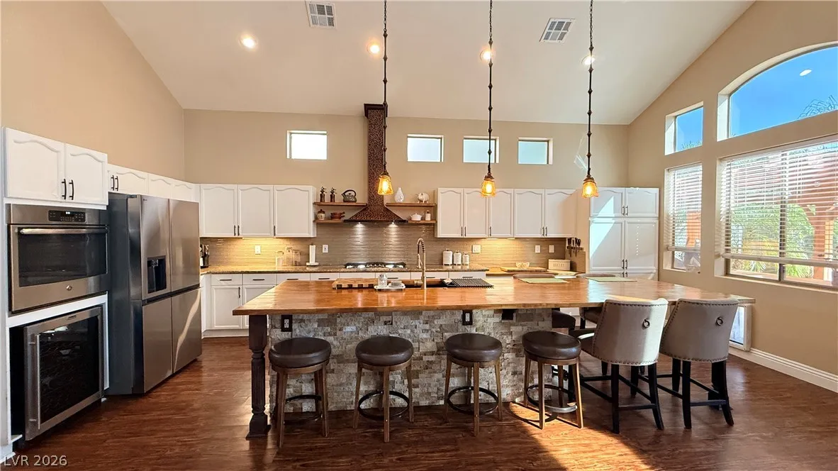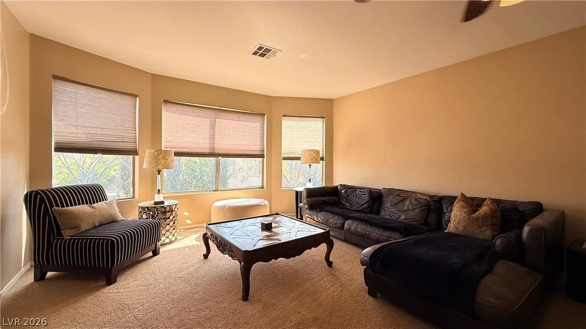 Amazing Fully Furnished Home in Summerlin Center area just down the Street from Downtown Summerlin / Primary Bedroom Downstairs with additional Den room / Giant GREAT ROOM with Fireplace and HUGE vaulted ceilings rising up from the Gourmet Kitchen area with Stainless Steel Cooktop and Oven / Refrigerator / HUGE Breakfast Bar Island kitchen Counter / Covered Patio and park like back yard with Firepit and nice real grass area / 3 car garage / 3 bedrooms and spacious Loft area / Make sure to check out the Matterport Virtual Walking tour on the Virtual Tour link