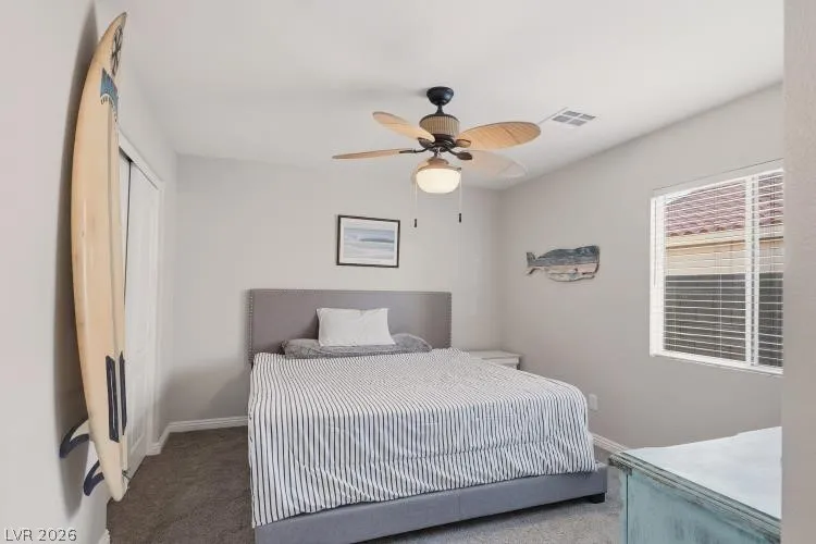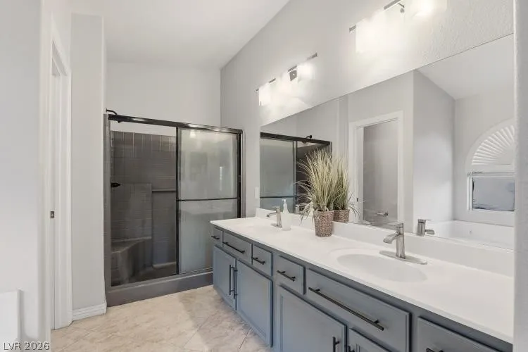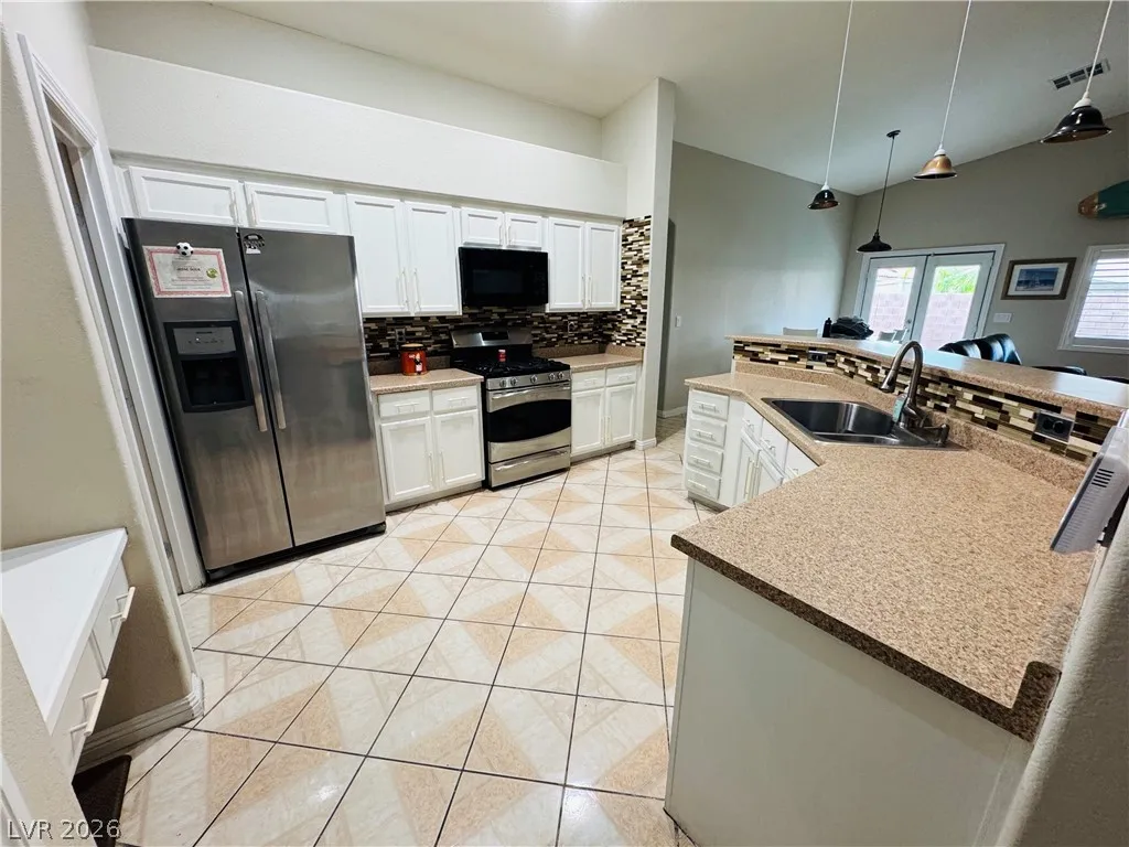 Beautiful single story with a 3 car garage . This home features a spacious open floor plan and vaulted ceilings throughout most of the home. 2 primary bedrooms. Located at opposite ends of the home, each with a full bathroom, and walk in closets, open kitchen has a walk-in pantry. Next to the kitchen, you’ll find the formal dining room. Large open great room with a gas fireplace, French doors leads you to a private backyard with a large covered patio with ceiling fans and a fully landscaped yard with artificial grass in the front yard. You will enjoy a year-around maintenance-free lawn as well. Built in a single story gated community at Aliante that offers easy access to parks, walking trails, shopping, resorts, tennis courts, schools, library, and much more. This home is located in a cul-de-sac. Seller to help with closing costs. Buyers to assume the Solar Panels’s lease. Furniture inside of the home is negotiable!!!
