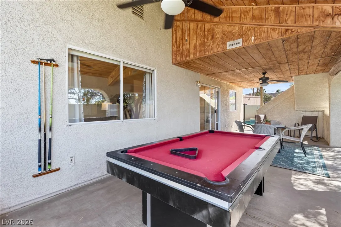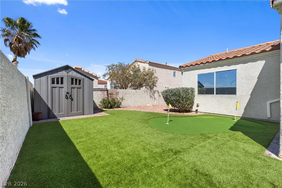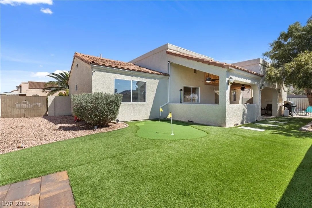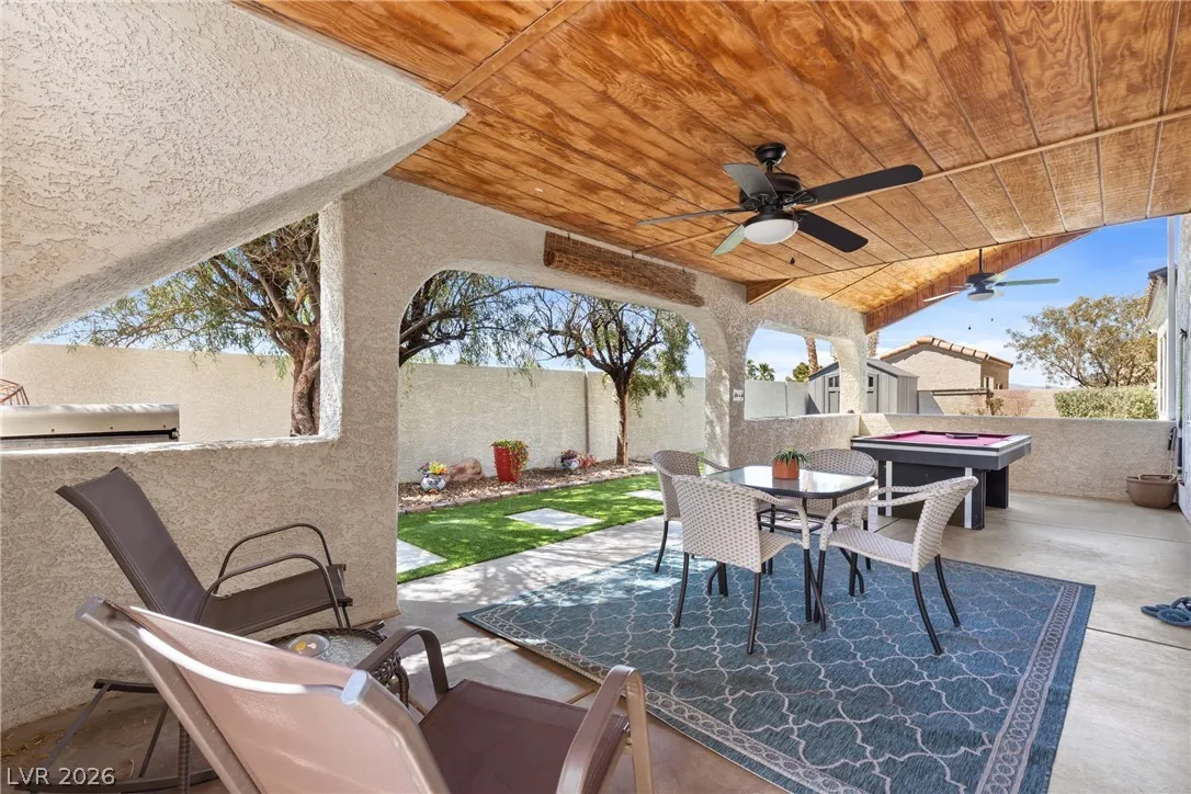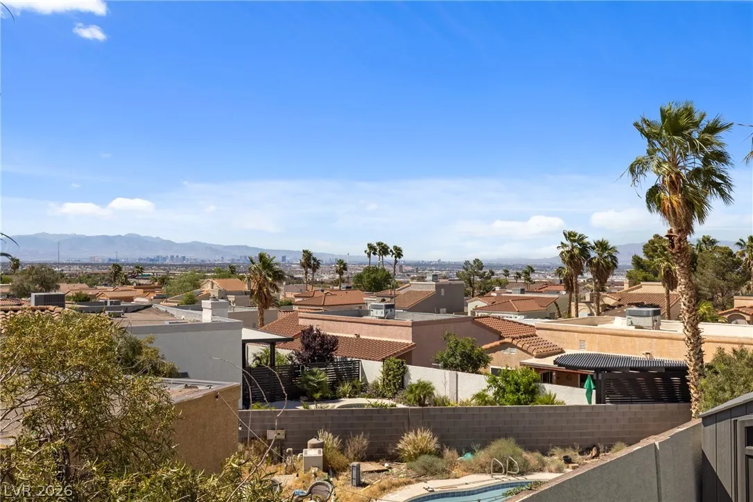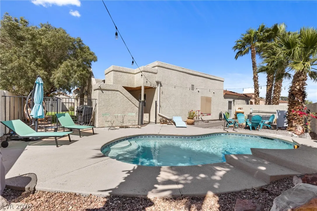 Beautiful and fully remodeled one story home with a pool, possible RV parking and no HOA! This is a 3 bedroom, 2 bath home with Porcelain wood-like tile throughout and a great open floor plan! Backyard has newly installed artificial turf with a putting green and a new shed that stays. The pool area is gated and set off to the side of the home with a separate gate for access for pet and child safety. The covered patio is great for BBQ’ing and entertaining with a game area and a pool table that stays with the home. There is also an upstairs deck with gorgeous views of the strip! This home is gorgeous and you will not be disappointed!