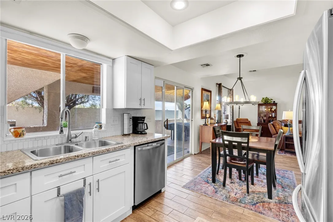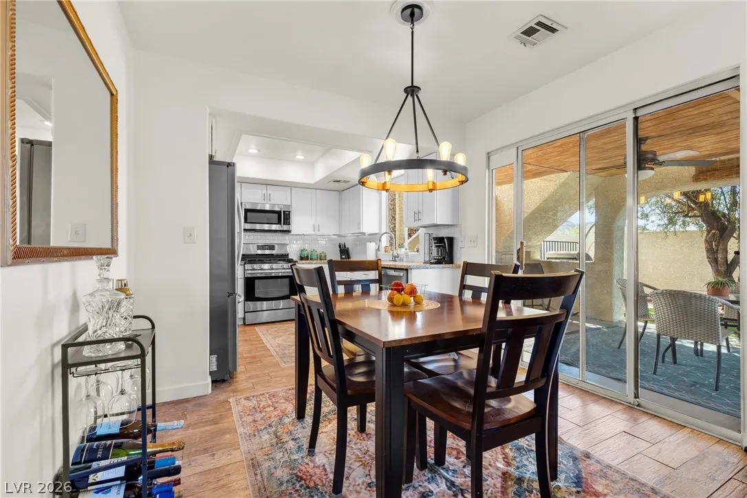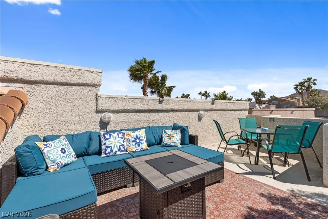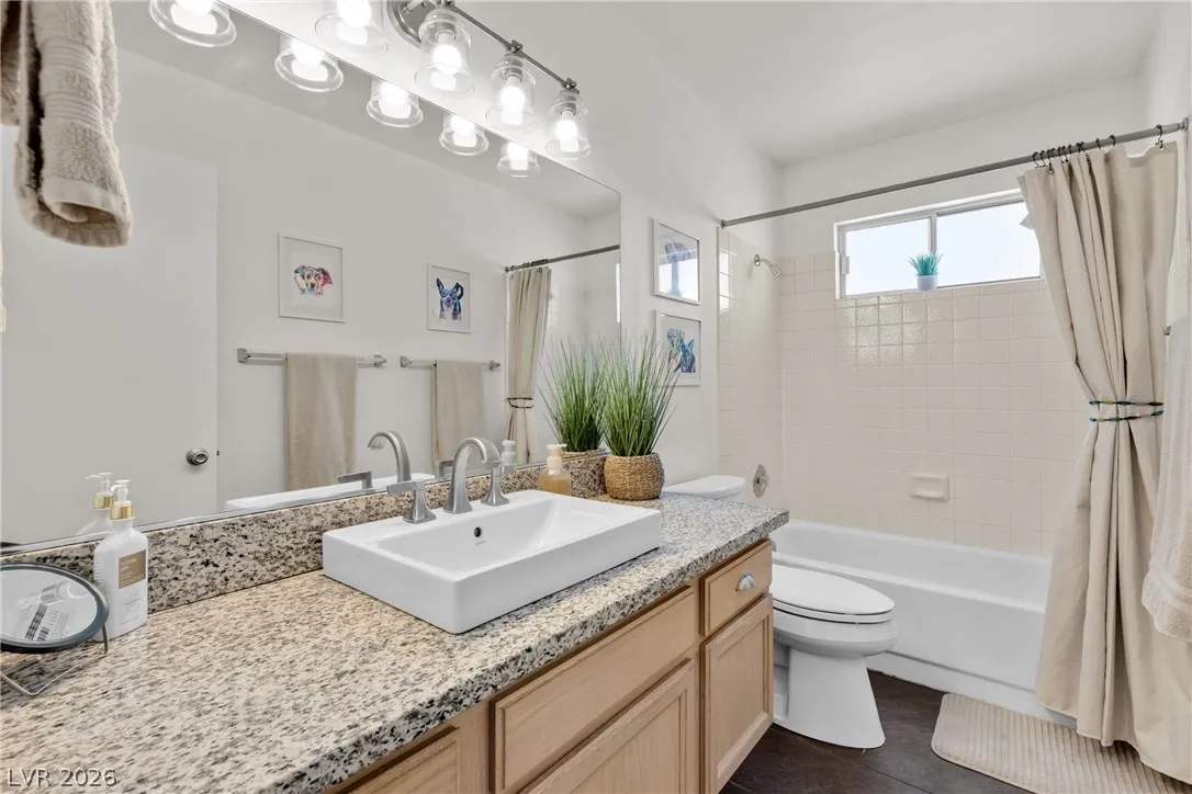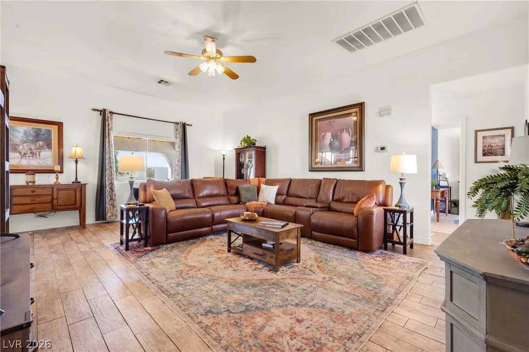 Beautiful and fully remodeled one story home with a pool, possible RV parking and no HOA! This is a 3 bedroom, 2 bath home with Porcelain wood-like tile throughout and a great open floor plan! Backyard has newly installed artificial turf with a putting green and a new shed that stays. The pool area is gated and set off to the side of the home with a separate gate for access for pet and child safety. The covered patio is great for BBQ’ing and entertaining with a game area and a pool table that stays with the home. There is also an upstairs deck with gorgeous views of the strip! This home is gorgeous and you will not be disappointed!