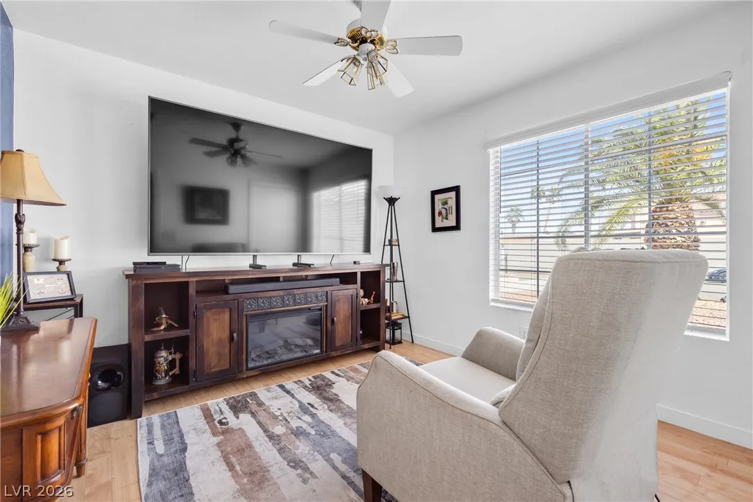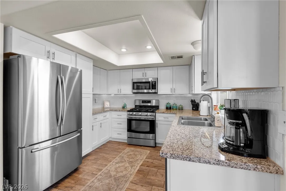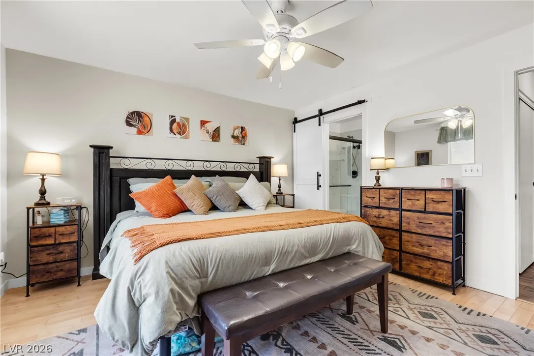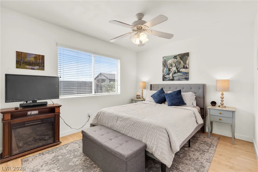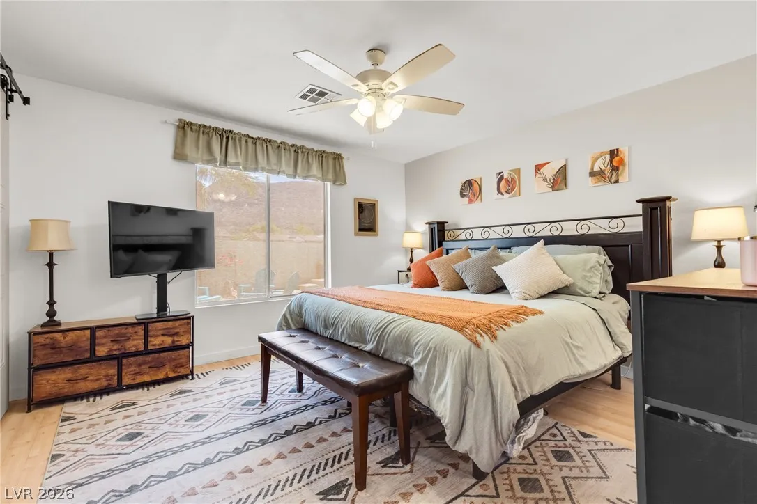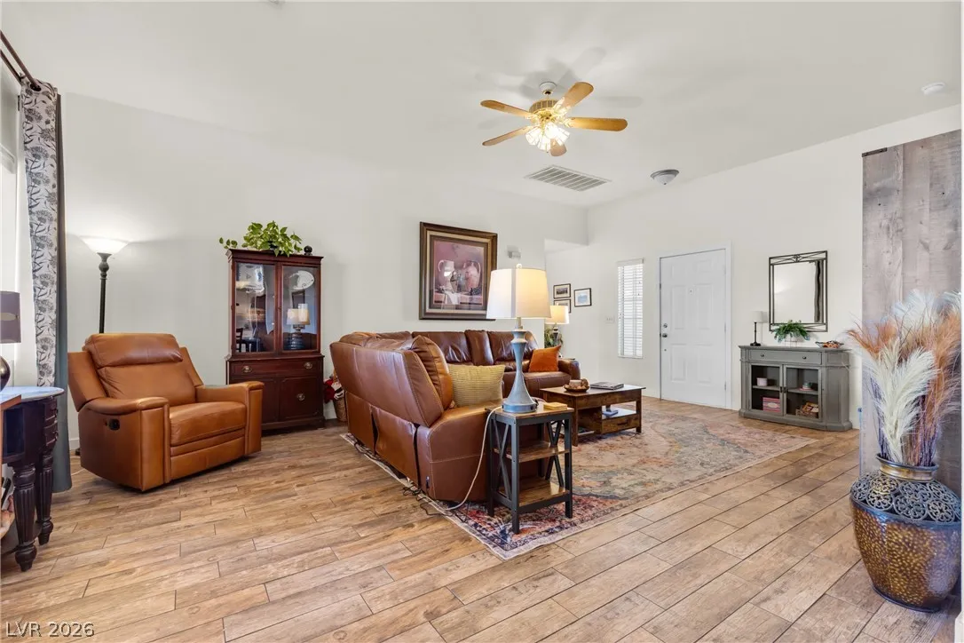 Beautiful and fully remodeled one story home with a pool, possible RV parking and no HOA! This is a 3 bedroom, 2 bath home with Porcelain wood-like tile throughout and a great open floor plan! Backyard has newly installed artificial turf with a putting green and a new shed that stays. The pool area is gated and set off to the side of the home with a separate gate for access for pet and child safety. The covered patio is great for BBQ’ing and entertaining with a game area and a pool table that stays with the home. There is also an upstairs deck with gorgeous views of the strip! This home is gorgeous and you will not be disappointed!