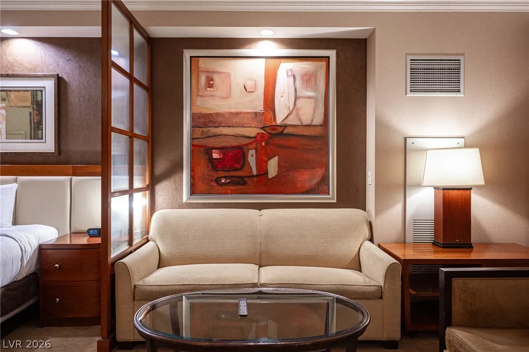 Panoramic Strip View Suite with balcony offering breathtaking views of the iconic Las Vegas Strip. The fully furnished turnkey suite features a kitchenette with high-end stainless-steel appliances, a two-burner stove, microwave, refrigerator, sink with granite countertops. Built-in entertainment center, closet with safe and extra bedding. Large bathroom with double sinks, jacuzzi tub, and walk-in shower. The unit comfortably sleeps four, with a luxurious king bed and pullout sleeper couch. Enjoy access to MGM Signature’s 3 private heated pools & spas, cabanas, a lounge with full bar, gym, valet, concierge, Starbucks, and laundry! Connected to MGM Grand, Palm Tree Beach Club, Lazy River, several high-end restaurants, casino, and MGM Grand Spa. The onsite rental program, AIRBNB, or third-party rental program is available.