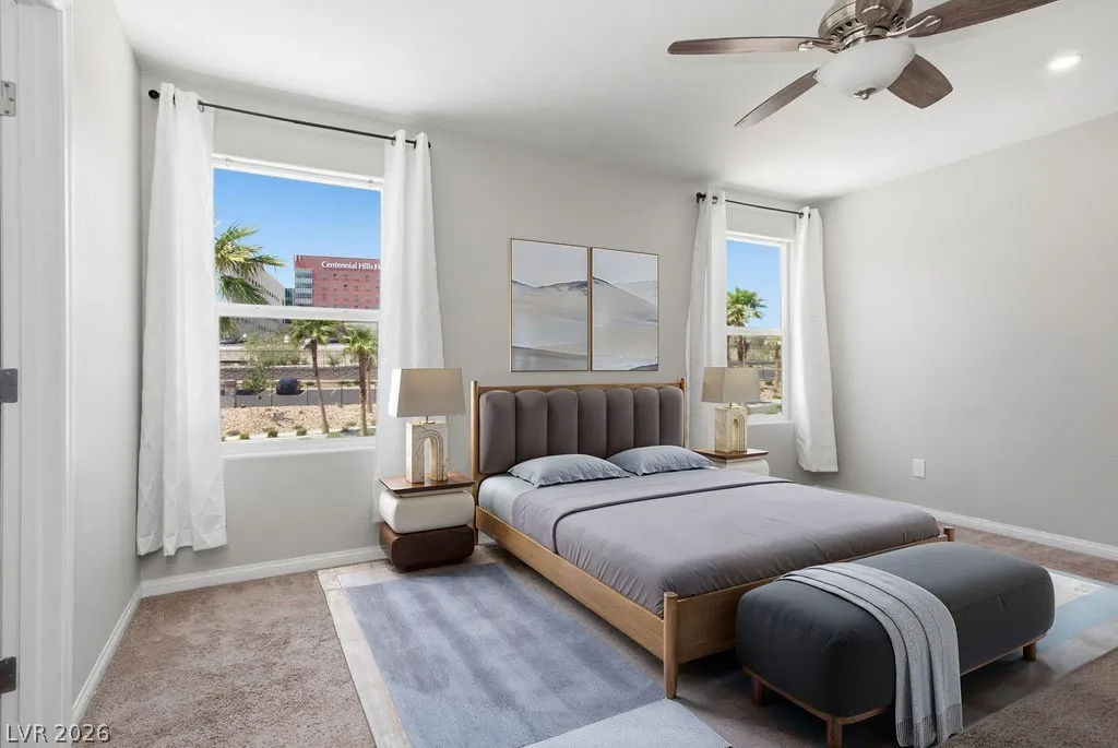 A well maintained 2 story, 3-bedroom home located in the gated Montecito community in NW Las Vegas. This home offers a desirable open main floor that flows into a functional kitchen with granite countertops, counter/bar area and stainless-steel appliances, ideal for everyday living and entertaining. Upstairs, the spacious primary bedroom provides a comfortable retreat with an en suite primary bath and walk in closet space. The large backyard is ready for you to create the space of your dreams, seller has added a full length slab patio with attached covered awning. Conveniently located within walking distance to Centennial Hills Hospital and surrounded by extensive shopping and dining, this home features modern finishes and a great northwest location.