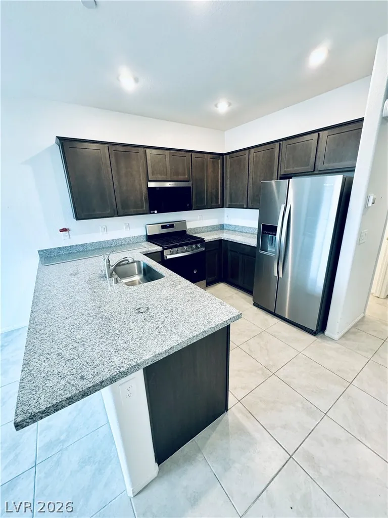 kitchen w/ recessed lighting, breakfast bar, Granite Counter Tops, custom cabinets, and ALL STAINLESS