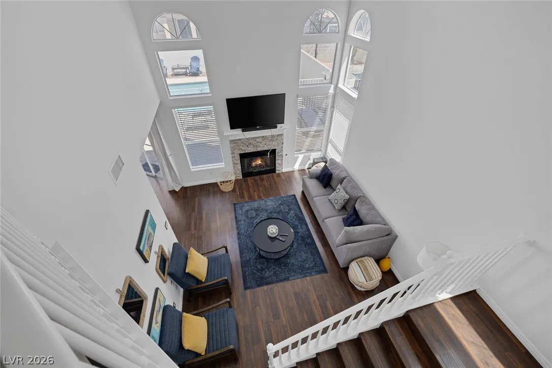 spa. Vaulted ceilings create an open and airy ambiance, complemented by an impressive stone fireplace.