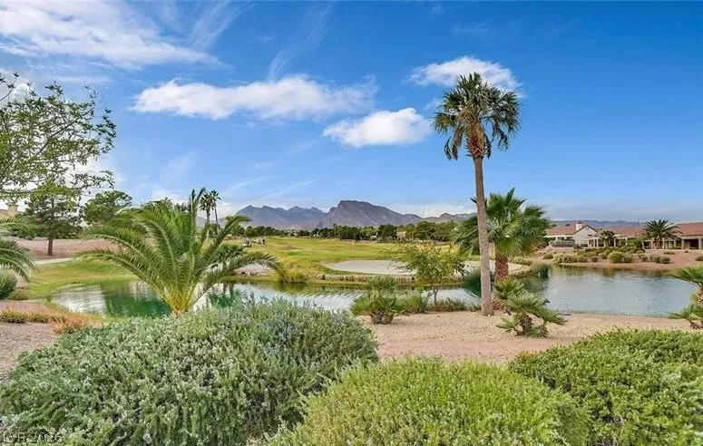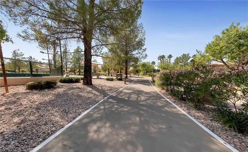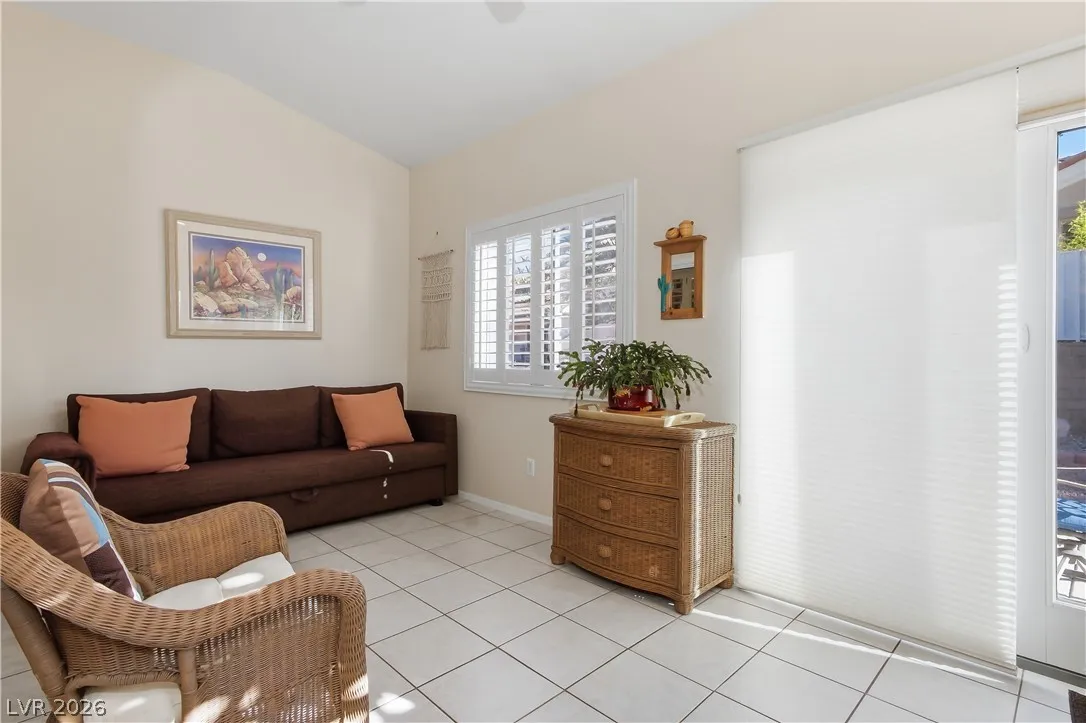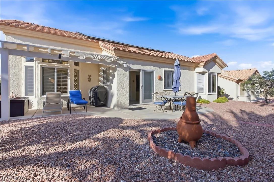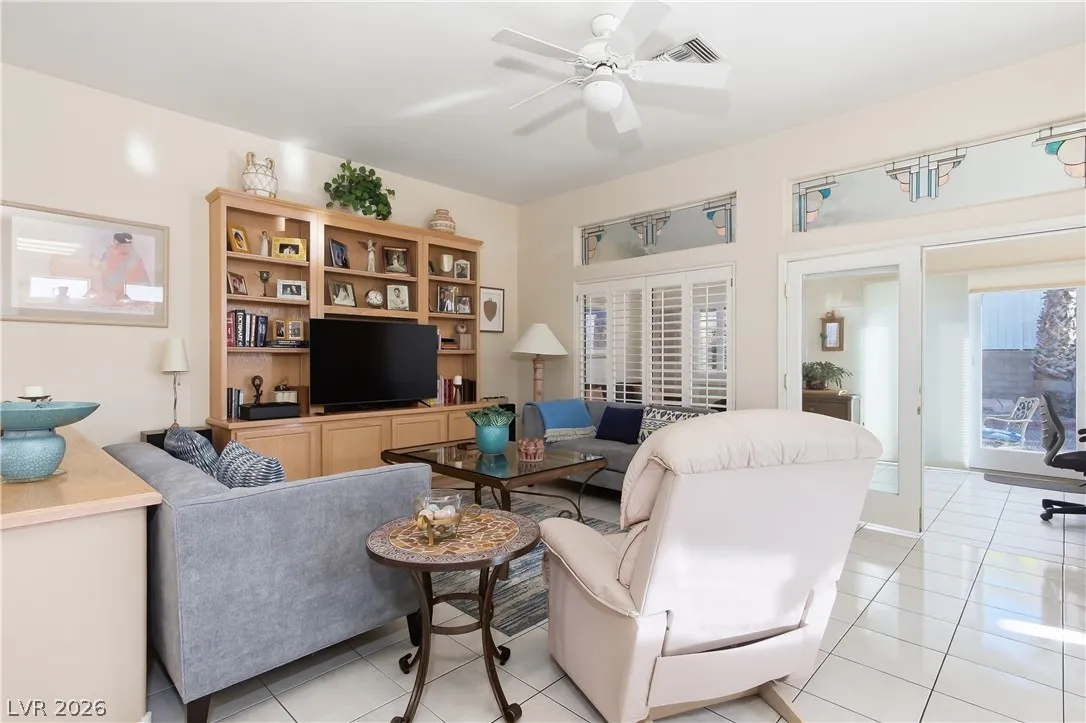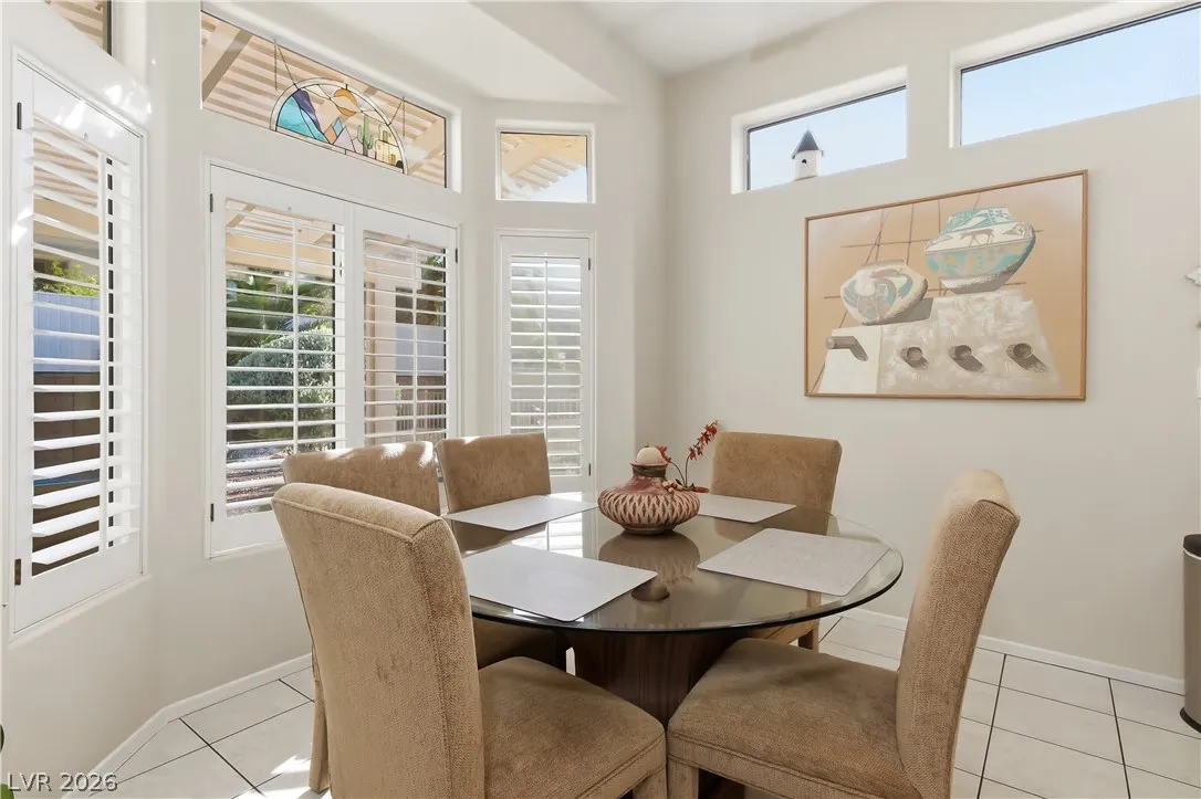 Expanded Tahoe model of approx. 1,703 sq ft, including a thoughtfully built 170 sq ft addition. This 2-bed, 2-bath home with a den/office is located in the premier 55+ Sun City Summerlin community. Open layout is ideal for comfortable living and entertaining. A welcoming foyer leads into a bright airy interior with hard-surface flooring throughout. An open kitchen with granite counters overlooks a bay-window eat-in nook, dining area, living room & den. Large windows bring in soft natural light from the south-facing backyard. The primary suite features a bay window, dual vanities & dual closets. Ceiling fans and plantation shutters add to the relaxed feel of casual living. Spacious 2nd bedroom and nearby full bath offer convenience. Additional highlights include an oversized 2-car garage with storage cabinets & a low-maintenance backyard with an expanded covered patio—perfect for outdoor enjoyment. Community offers 3 golf courses, 4 clubhouses, pools, fitness, sports courts & amenities.