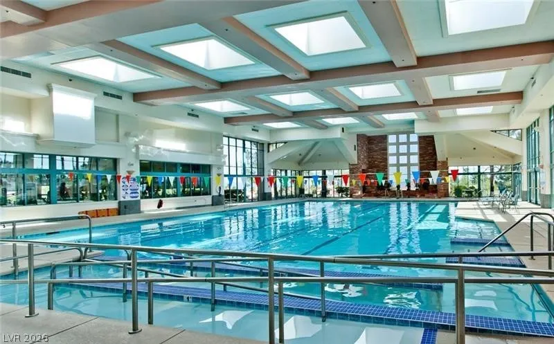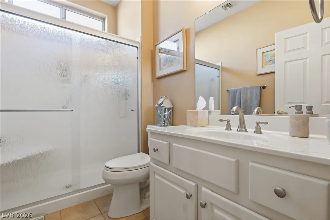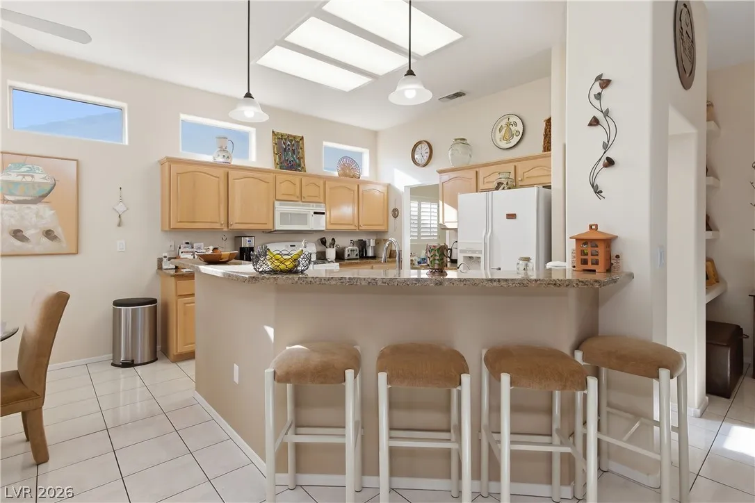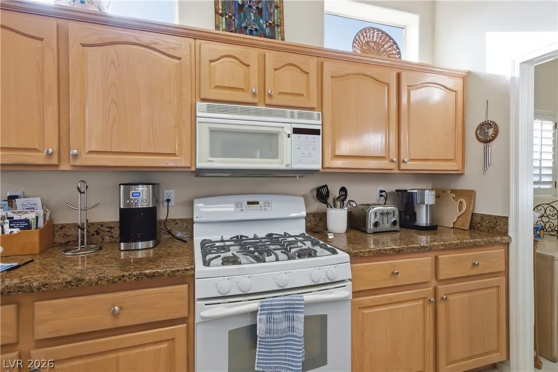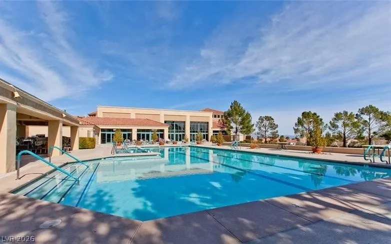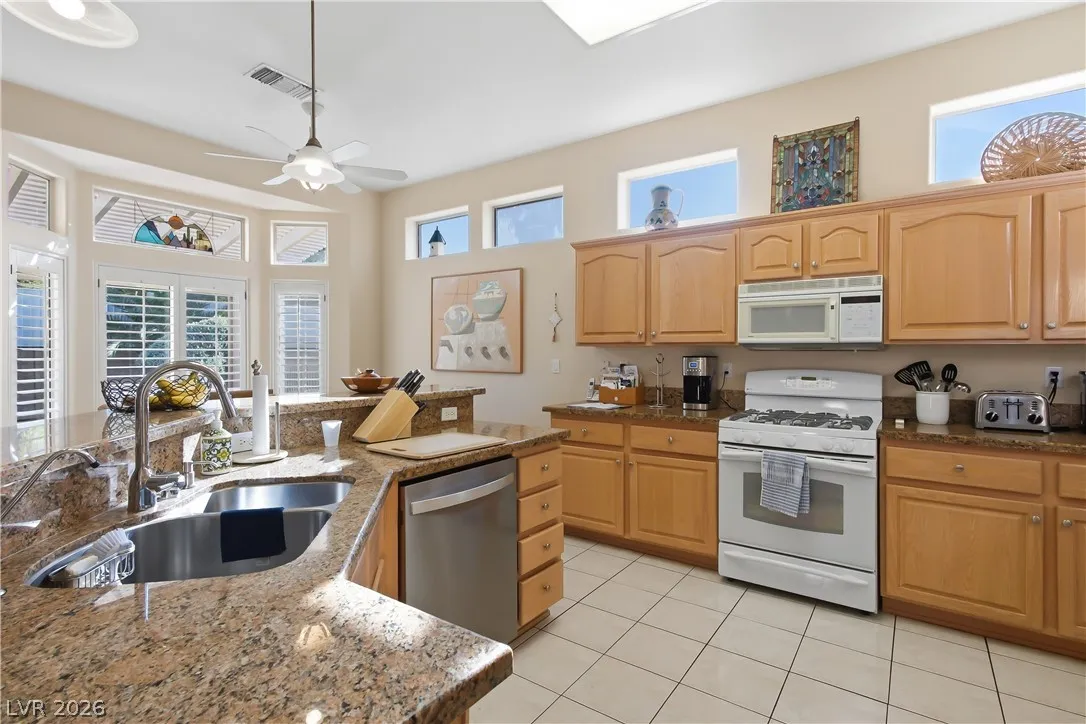 Expanded Tahoe model of approx. 1,703 sq ft, including a thoughtfully built 170 sq ft addition. This 2-bed, 2-bath home with a den/office is located in the premier 55+ Sun City Summerlin community. Open layout is ideal for comfortable living and entertaining. A welcoming foyer leads into a bright airy interior with hard-surface flooring throughout. An open kitchen with granite counters overlooks a bay-window eat-in nook, dining area, living room & den. Large windows bring in soft natural light from the south-facing backyard. The primary suite features a bay window, dual vanities & dual closets. Ceiling fans and plantation shutters add to the relaxed feel of casual living. Spacious 2nd bedroom and nearby full bath offer convenience. Additional highlights include an oversized 2-car garage with storage cabinets & a low-maintenance backyard with an expanded covered patio—perfect for outdoor enjoyment. Community offers 3 golf courses, 4 clubhouses, pools, fitness, sports courts & amenities.