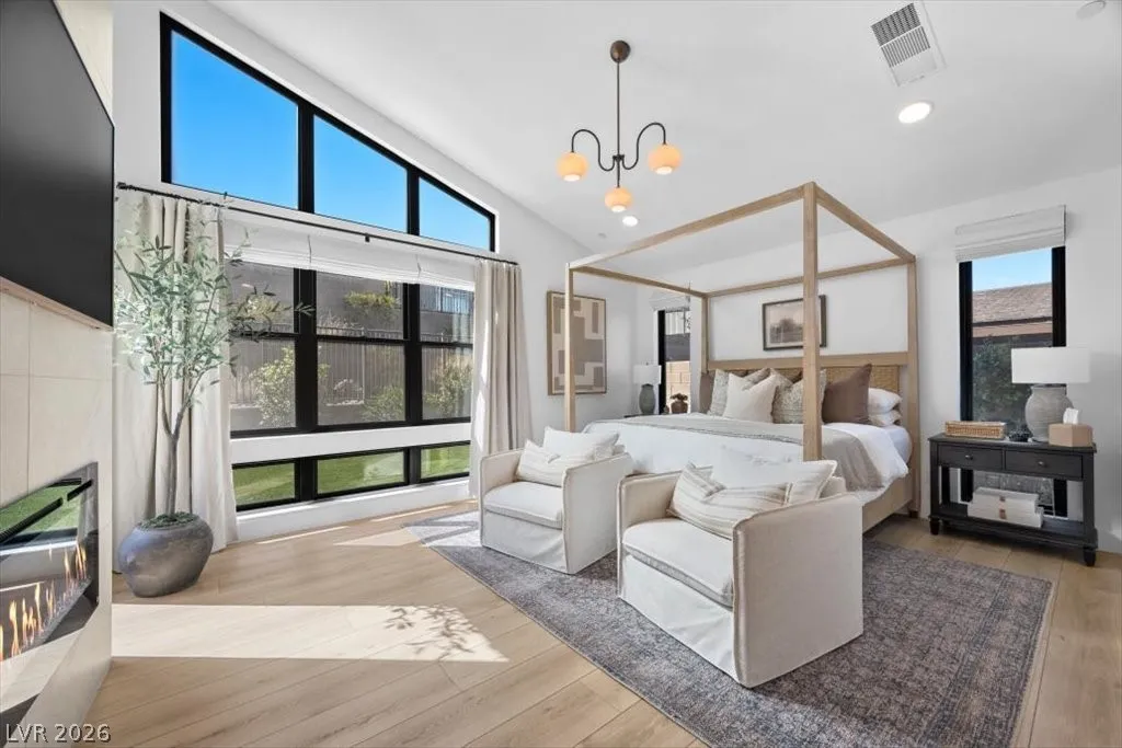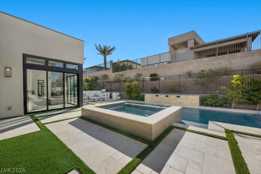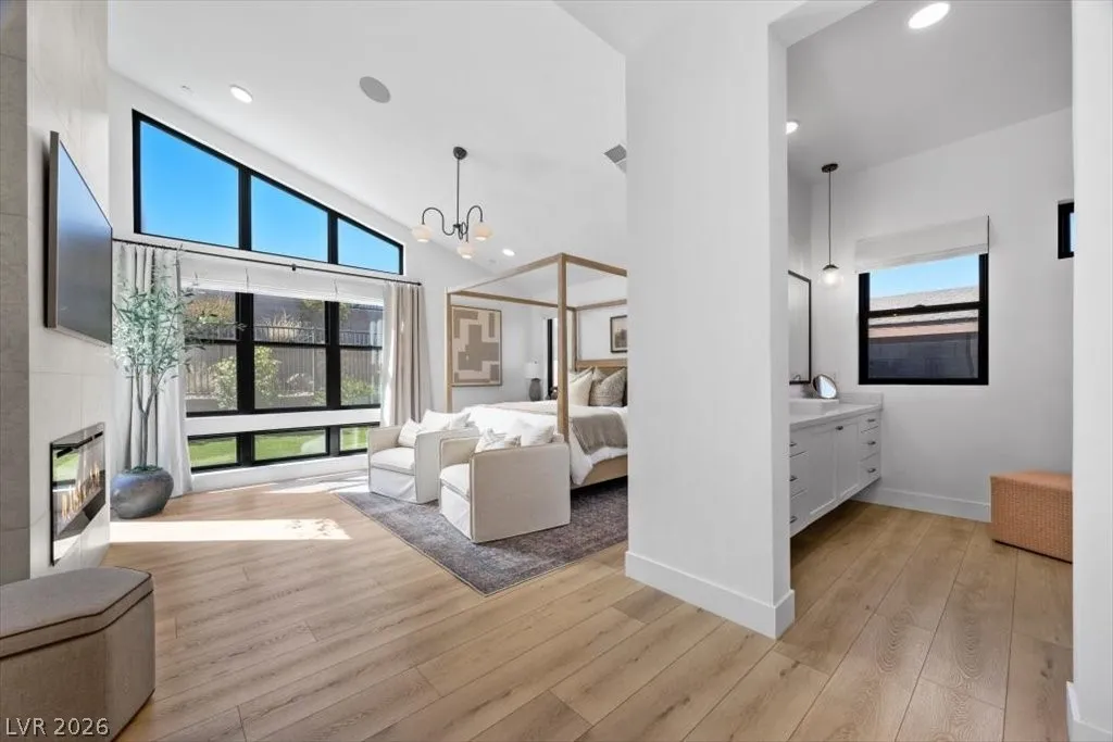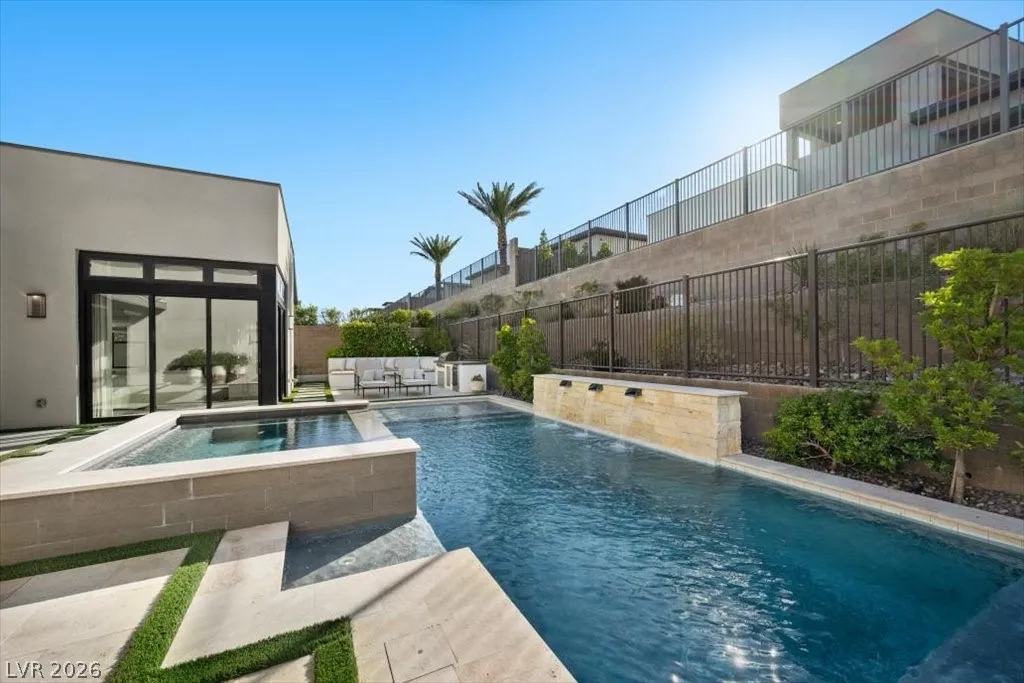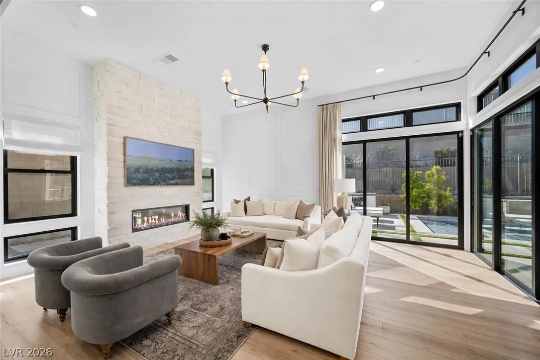 An Achitectural Showpiece, $550k+ in designer upgrades, located in the most desirable part of Summerlin, “West Summerlin”, Neslted within the prestigious Sandalwood Community. This Exceptional Home welcomes you through a “New Upgraded Custom European Glass Pivot Door” into luminous interiors, defined by Rift White Oak Millwork, Bespoke Finishes, & sophisticated modern design. The gourmet kitchen & butler’s pantry feature top-tier appliances, dual ovens, wine refrigerator, & custom cabinetry designed for both elegance & function. The home offers “4” bedrooms plus a Private Den, with thoughtfully designed custom closets throughout. Dramatic floor-to-ceiling fireplaces anchor the living & master bedroom, creating warm yet refined gathering spaces. Expansive Pocket Sliders seamlessly connect indoor & outdoor living to a Tuscan-Inspired Backyard Retreat featuring an oversized spa, built-in BBQ, fire pit lounge, & lush landscaping—an extraordinary setting for luxury living & entertaining.