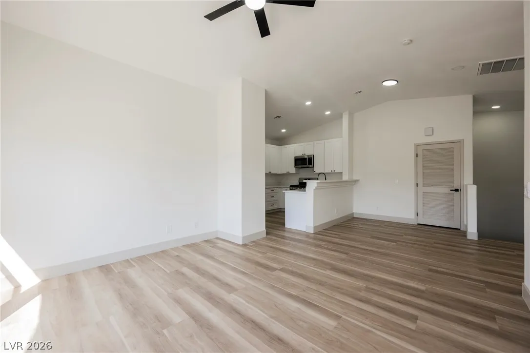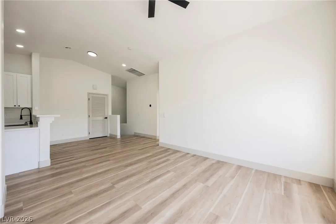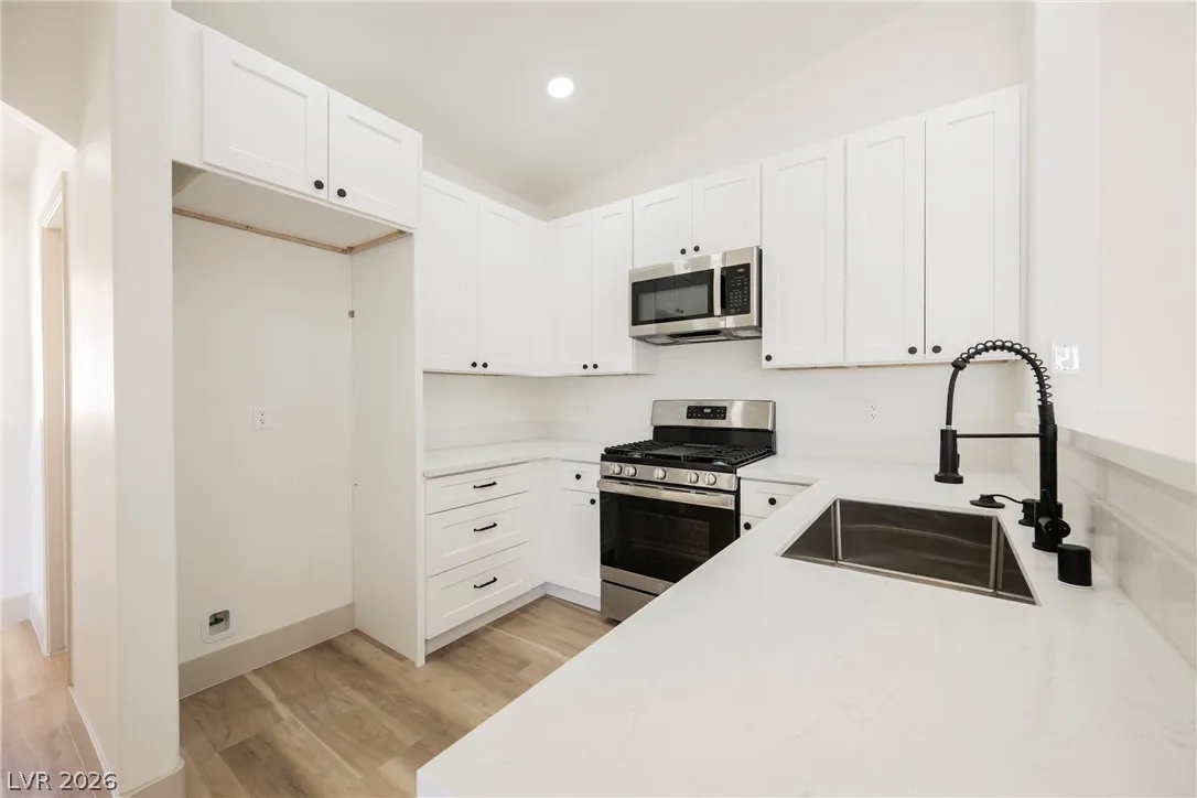 crisp white cabinets accented by matte black hardware and stainless appliances. Luxurious plank vinyl