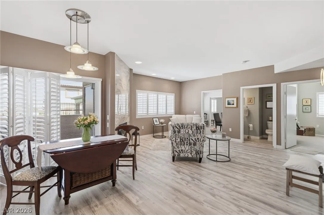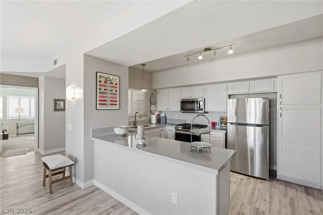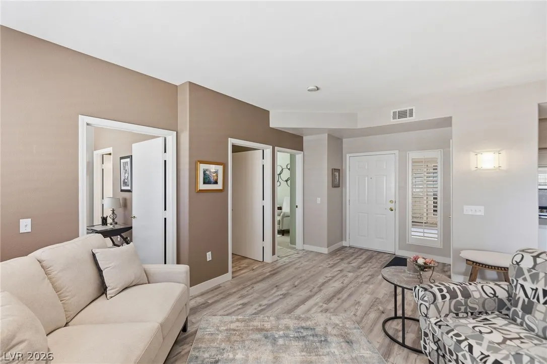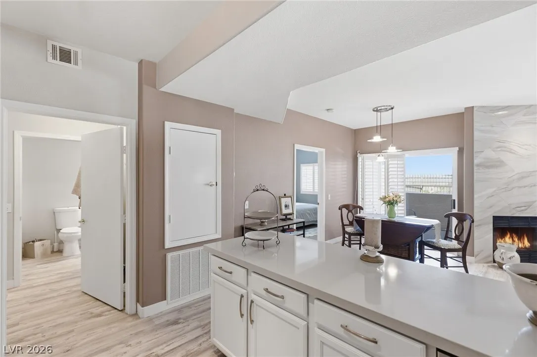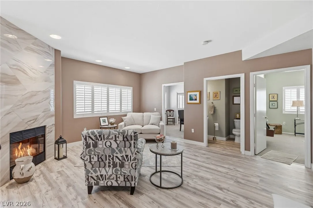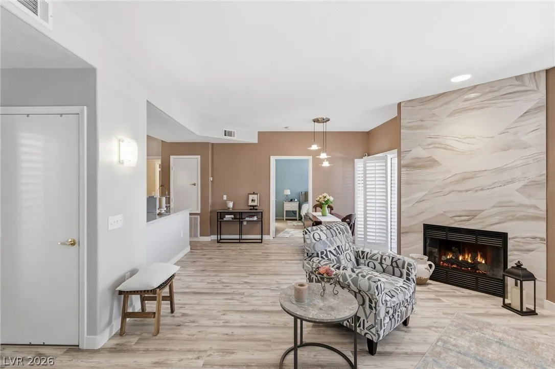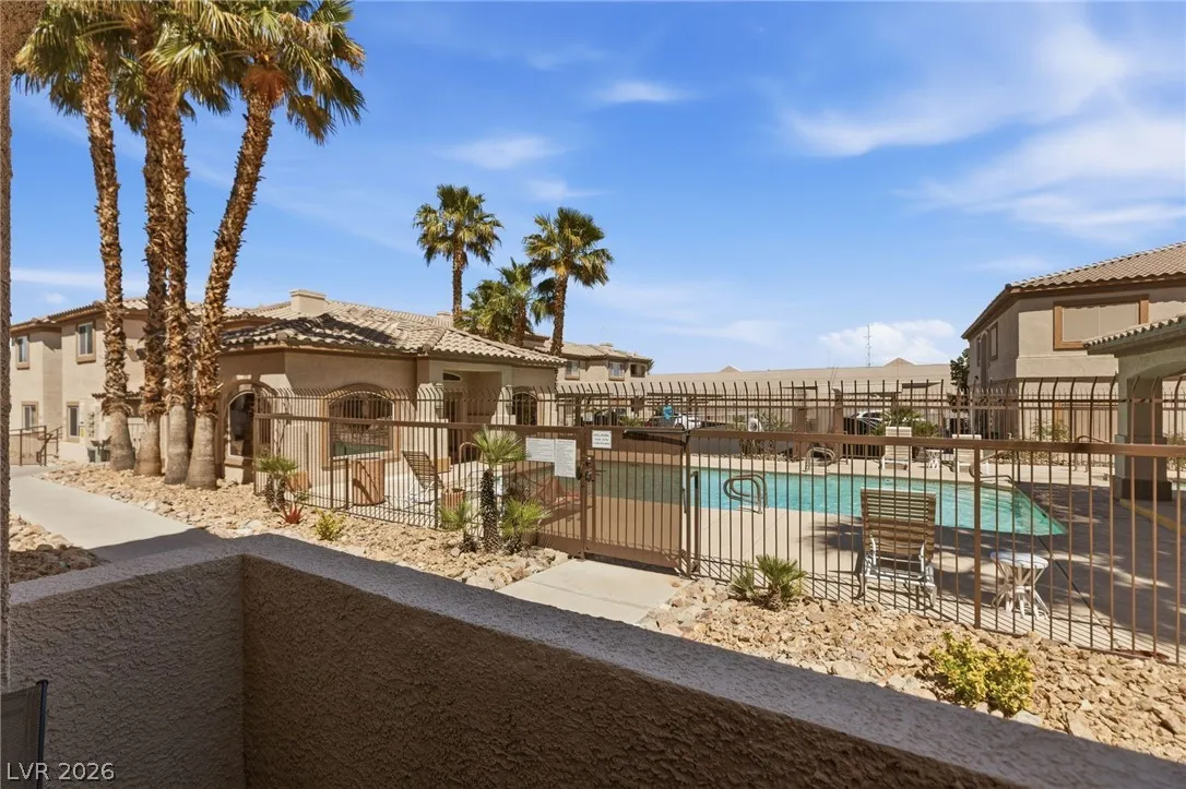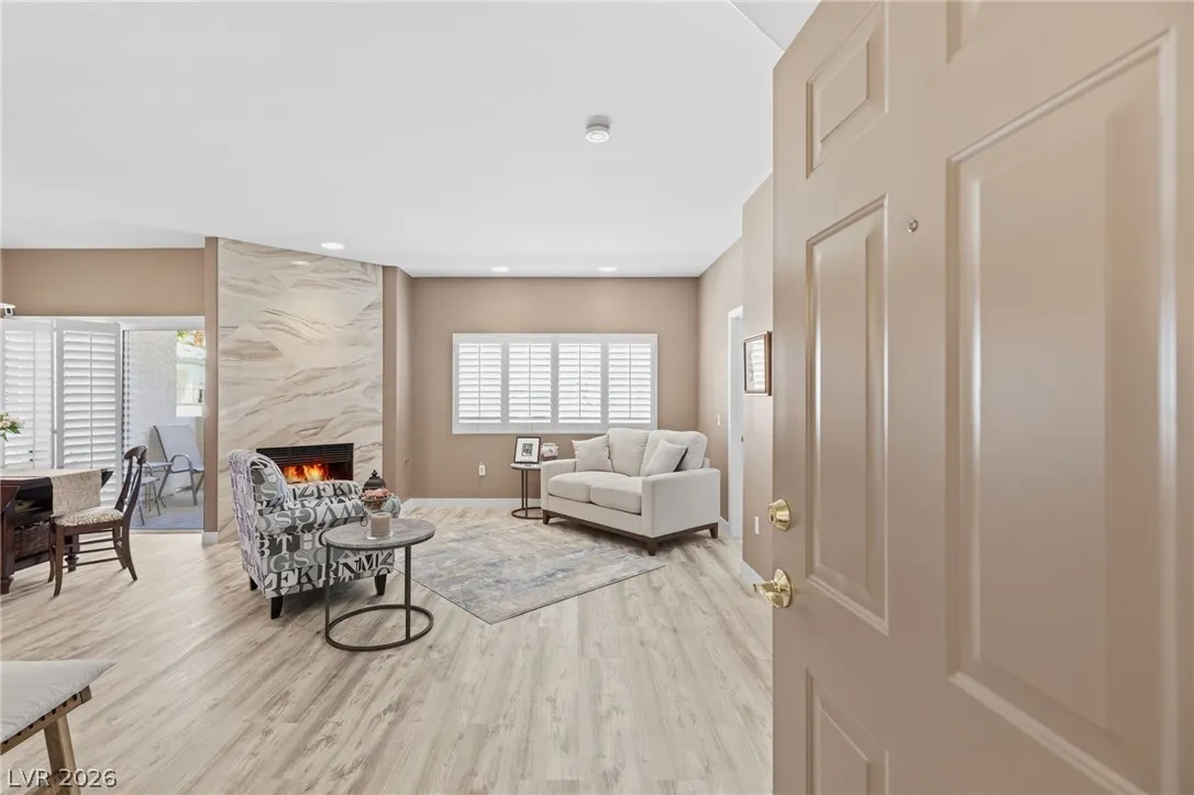Stunning downstairs condo ideally positioned overlooking the pool! This beautifully designed 3-bedroom, 2.5-bath home offers an open layout with a spacious living and dining area centered around a striking floor-to-ceiling marble fireplace. Luxury laminate flooring in the main living areas pairs perfectly with low-profile Berber carpeting in the bedrooms. The kitchen features sleek quartz countertops and stainless appliances. The primary suite offers a relaxing retreat with a custom walk-in closet by California Closets and a built-in wall feature for added style and storage plus a huge walk in shower. Subtle accessibility enhancements—such as wider doorways, lower outlets, and lowered kitchen counters—are seamlessly integrated, making the home wheelchair accessible without compromising design. Located in a gated community with a pool, spa, fitness center and no rental restrictions, this property presents an exceptional opportunity for both homeowners and investors alike.