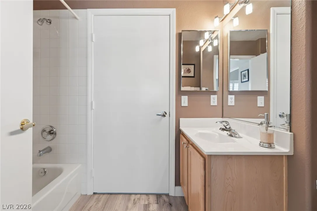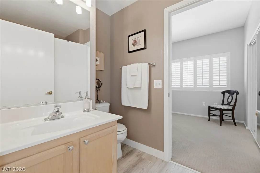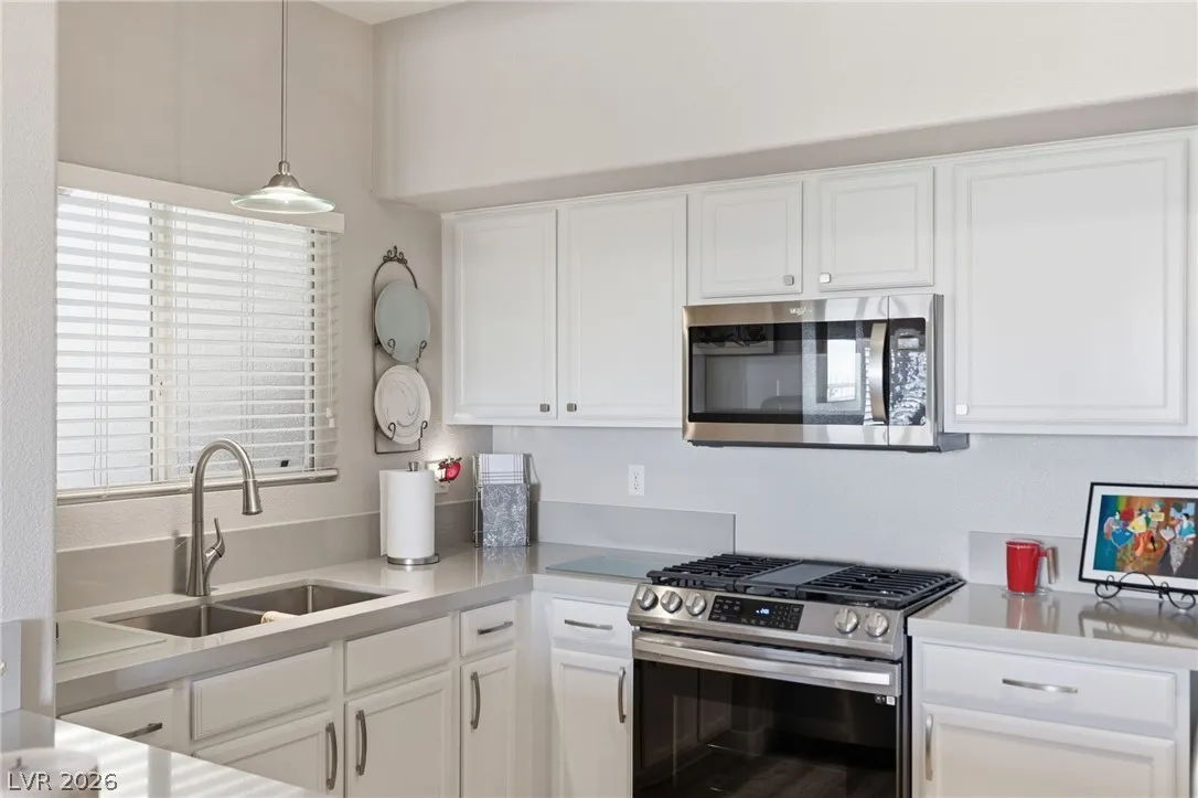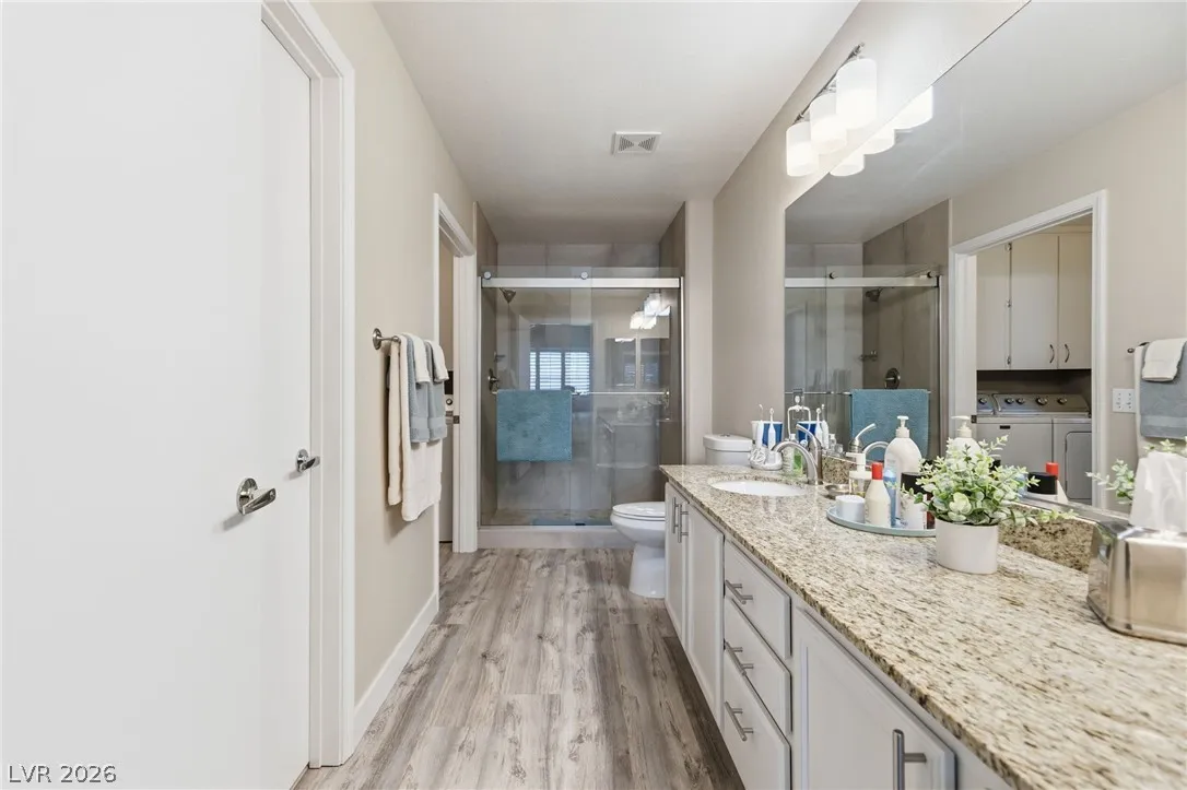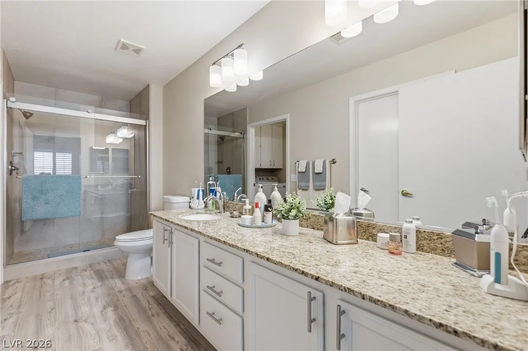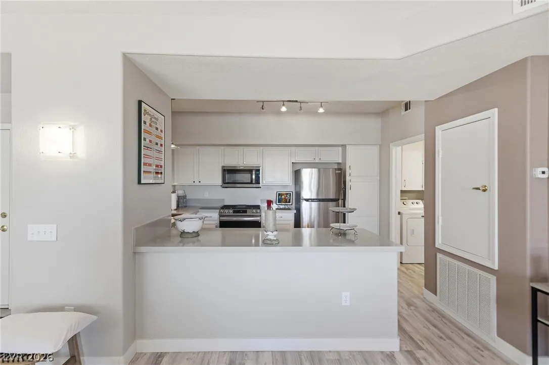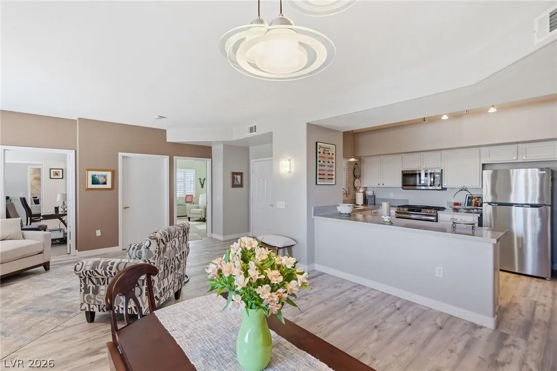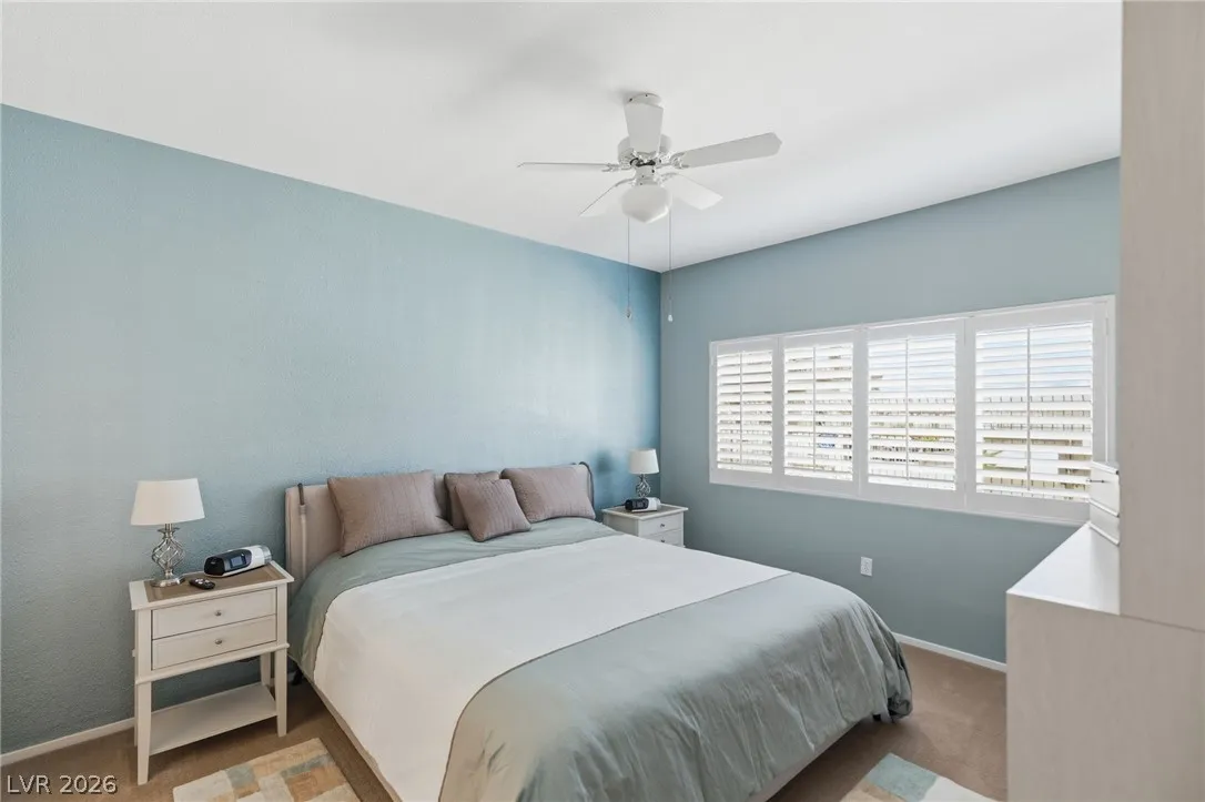 Stunning downstairs condo ideally positioned overlooking the pool! This beautifully designed 3-bedroom, 2.5-bath home offers an open layout with a spacious living and dining area centered around a striking floor-to-ceiling marble fireplace. Luxury laminate flooring in the main living areas pairs perfectly with low-profile Berber carpeting in the bedrooms. The kitchen features sleek quartz countertops and stainless appliances. The primary suite offers a relaxing retreat with a custom walk-in closet by California Closets and a built-in wall feature for added style and storage plus a huge walk in shower. Subtle accessibility enhancements—such as wider doorways, lower outlets, and lowered kitchen counters—are seamlessly integrated, making the home wheelchair accessible without compromising design. Located in a gated community with a pool, spa, fitness center and no rental restrictions, this property presents an exceptional opportunity for both homeowners and investors alike.