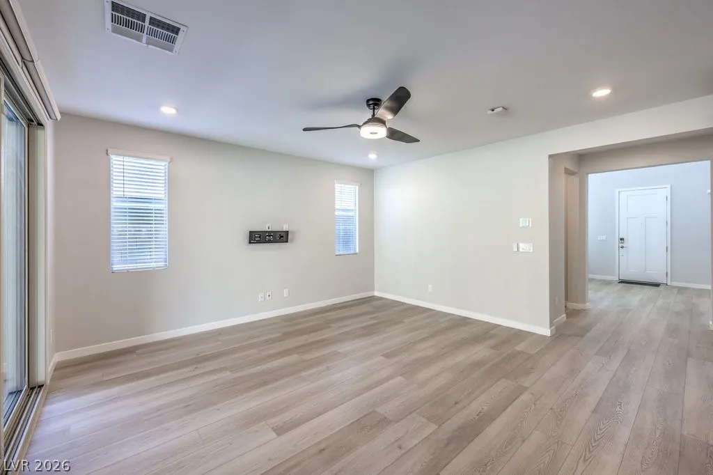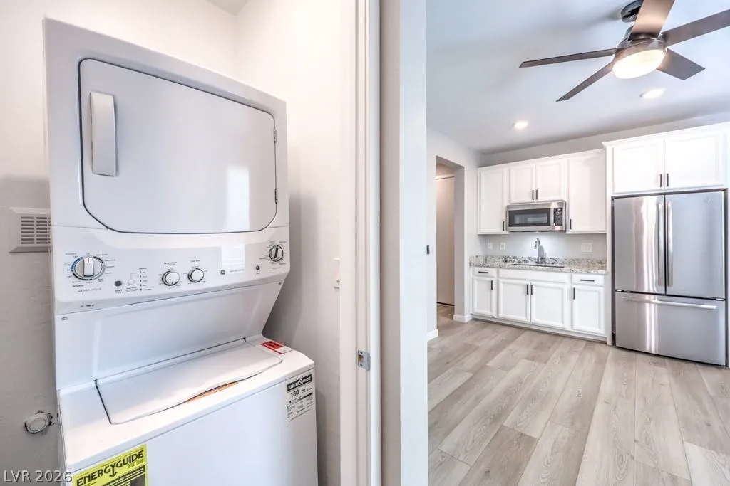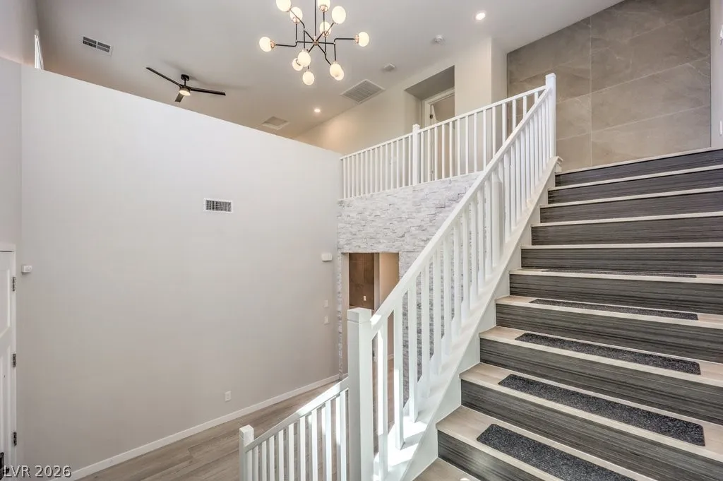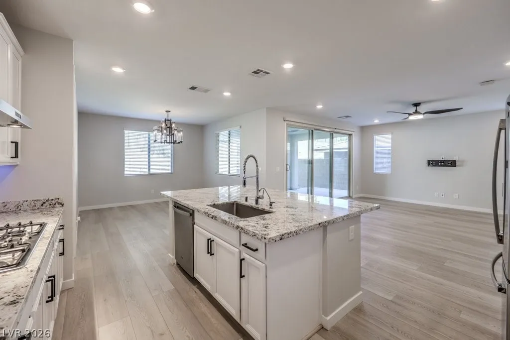 Stunning Summerlin 4 bedroom with a 3-car garage and an attached NextGen unit with its own private entry, living space, full bath, washer and dryer, and kitchenette! The home features beautiful stone accent wall in the foyer, wood-look flooring, soaring vaulted ceilings, and living room perfect for hosting. The kitchen is equipped with upgraded cabinetry, stainless steel appliances, wall ovens, granite counters, a walk-in pantry, and an oversized center island. Upstairs features a large loft perfect for relaxing or as a media room. The sizable main bedroom has a private balcony, large ensuite with dual sinks, shower, and soaking tub. All bedrooms upstairs each have walk-in closets. The backyard with NO REAR NEIGHBORS features a covered patio and ample space for gatherings. Other modern perks include an EV charger and smart devices such as light switches, thermostat, fans, locks, ring doorbell, motorized blinds, and garage doors. Solar panels installed! An amazing opportunity!