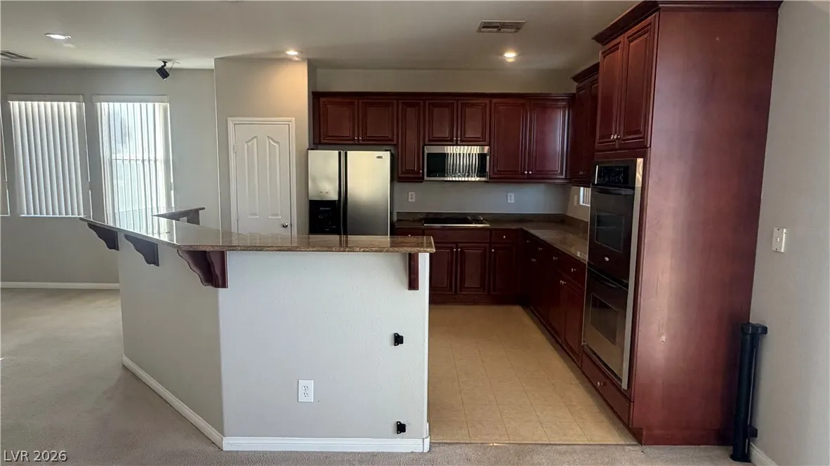bright kitchen offers an island/breakfast bar combination,stainless steel appliances, a built-in microwave,
