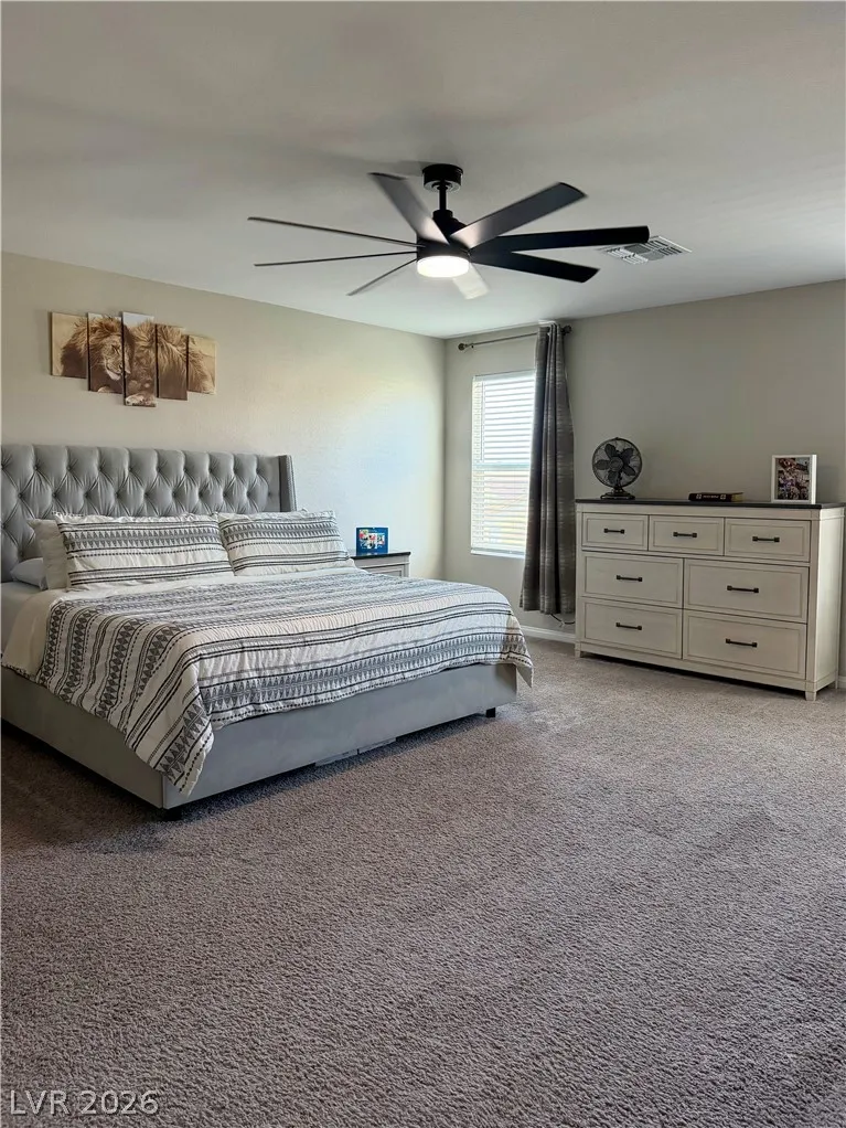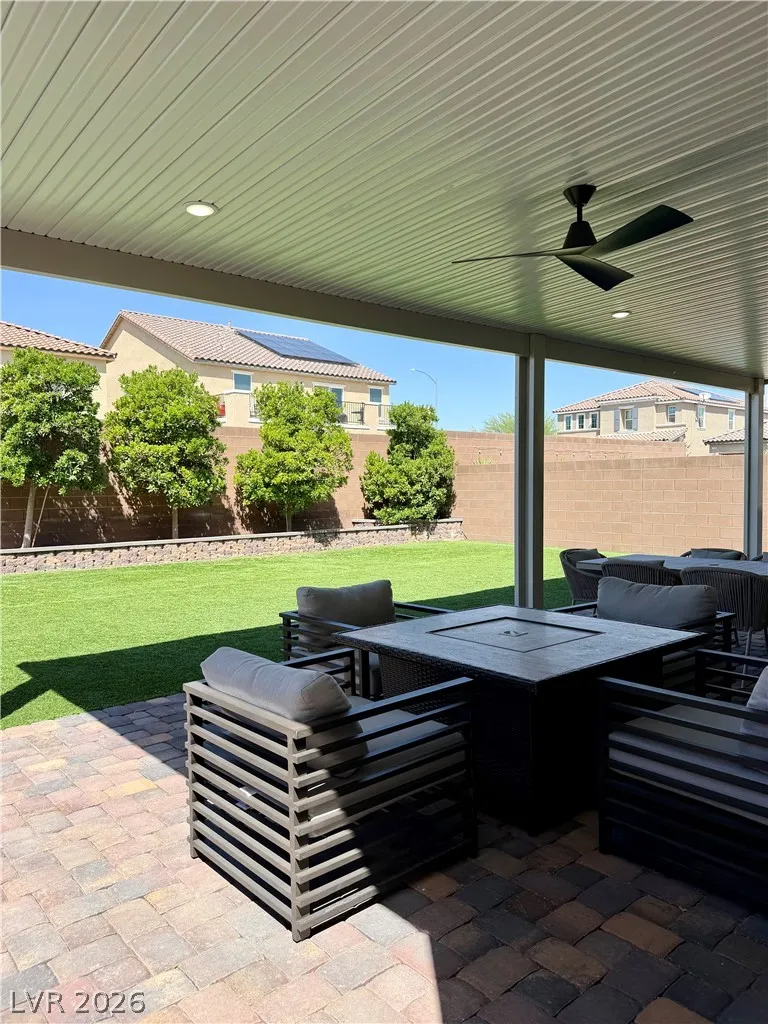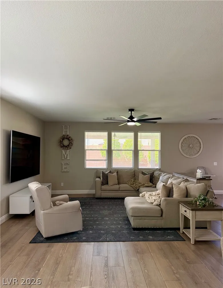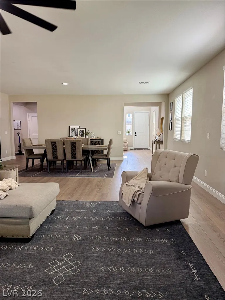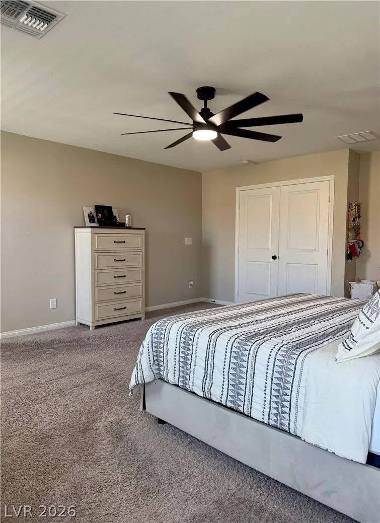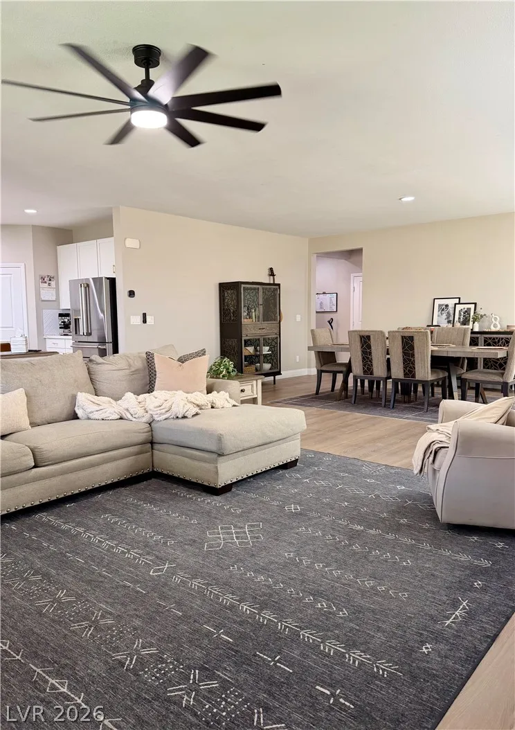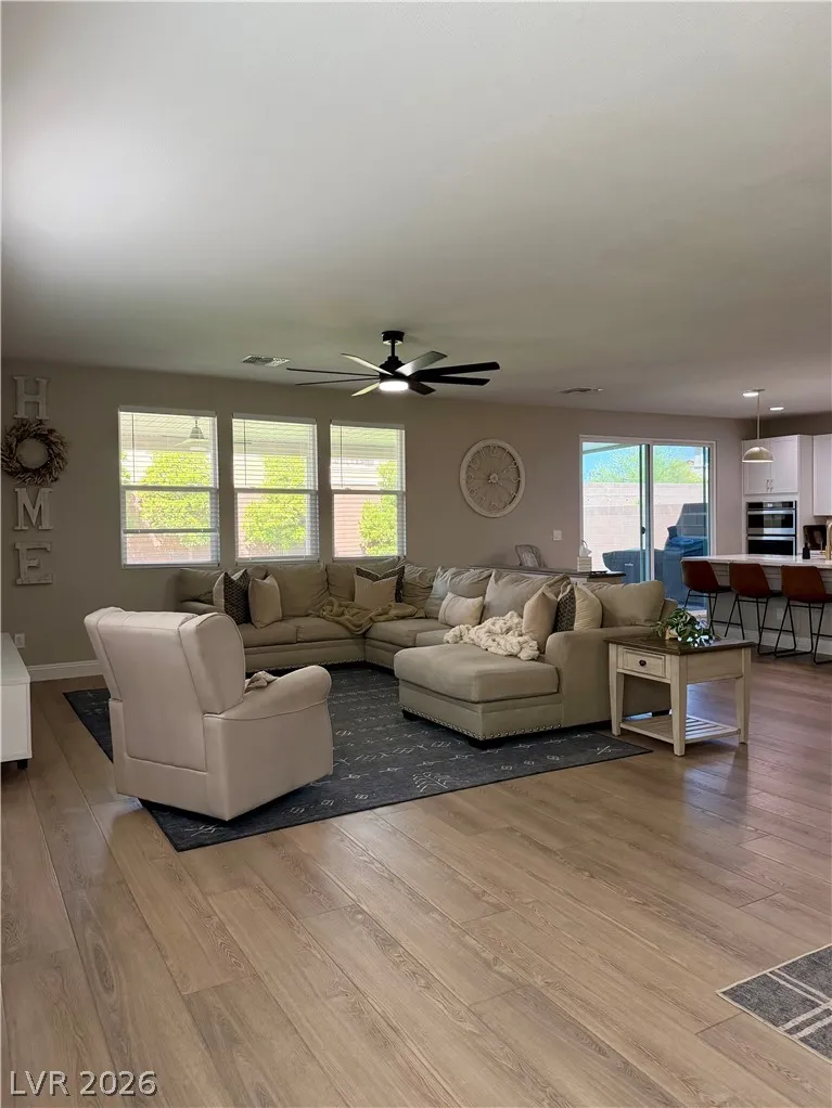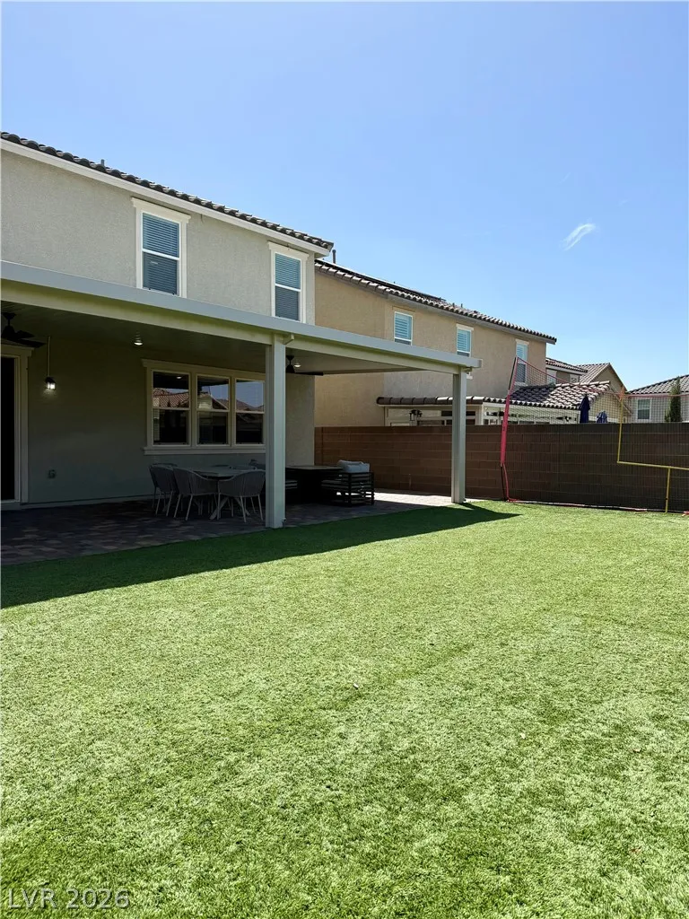 Beautifully maintained 5-bedroom, 3-bath home offering over 3,000 sq ft of modern living in a gated community. Built in 2021, this home features a bright open-concept layout with soaring ceilings, abundant natural light, and wood-look flooring. The upgraded kitchen includes quartz countertops, white cabinetry, stainless steel appliances, and a large island with bar seating. Spacious bedrooms offer flexibility for guests, office, or multi-gen living. The primary suite features dual sinks and a clean, modern design. Enjoy a private backyard with low-maintenance turf—perfect for relaxing or entertaining. Additional highlights include a 2-car garage with EV charger and great curb appeal. Move-in ready and exceptionally well cared for.