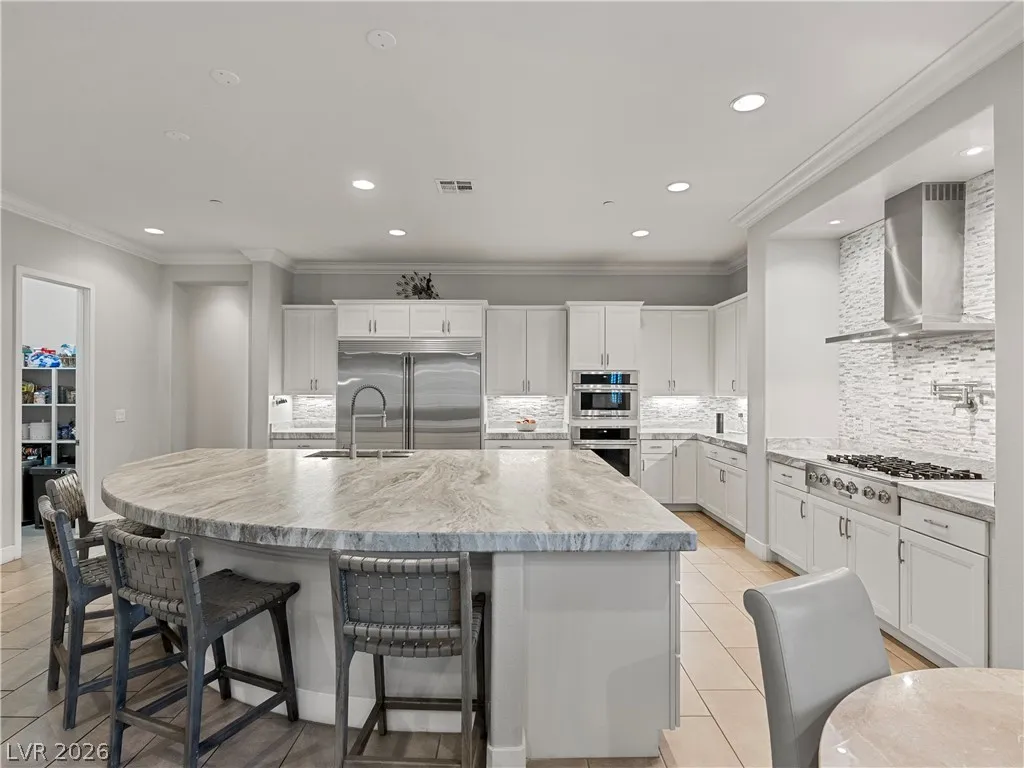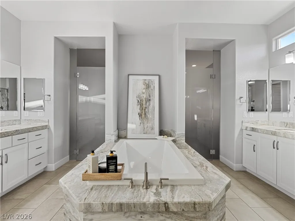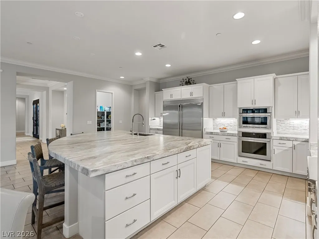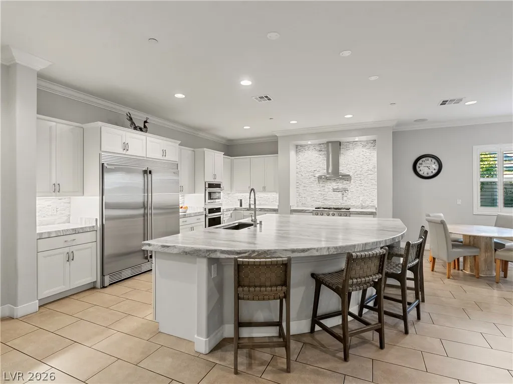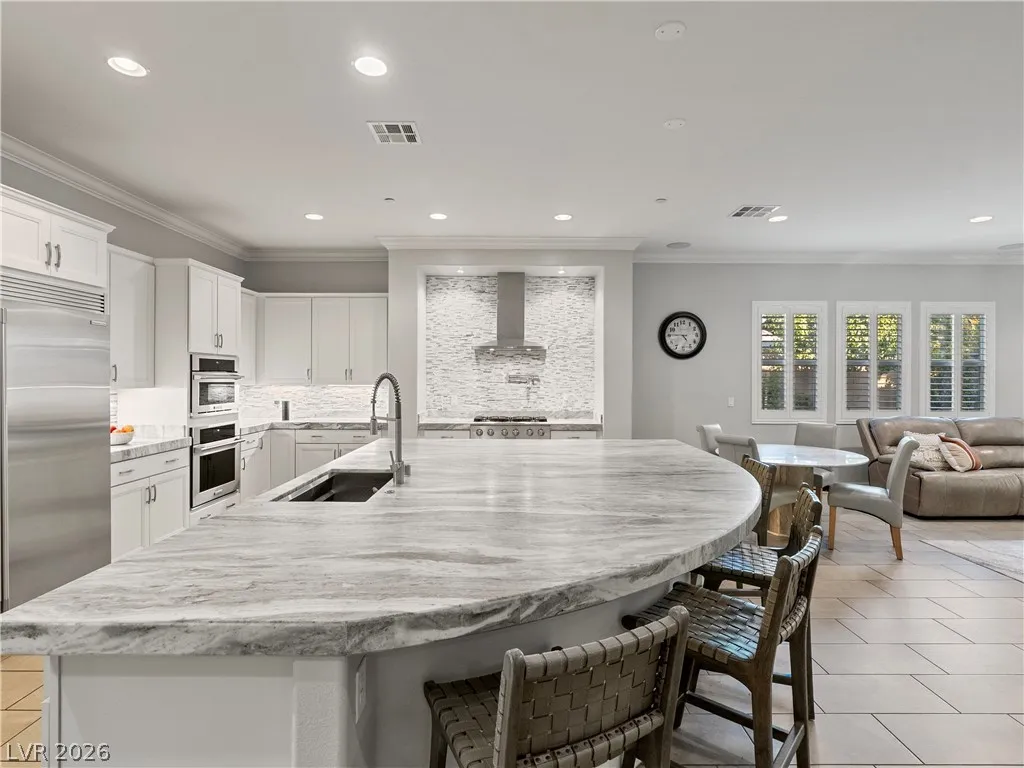 Interior highlights include leathered marble countertops, Electrolux stainless steel appliances, soft-close cabinetry with pull-out storage, and an oversized island. A centralized smart-home system integrates indoor/outdoor audio and security. Five of six bedrooms are en-suite. The primary wing includes a spa-style dual shower, soaking tub, dual vanities, and custom dressing space. Single-story layout offers space, privacy, and flexibility rarely found on lots of this size.