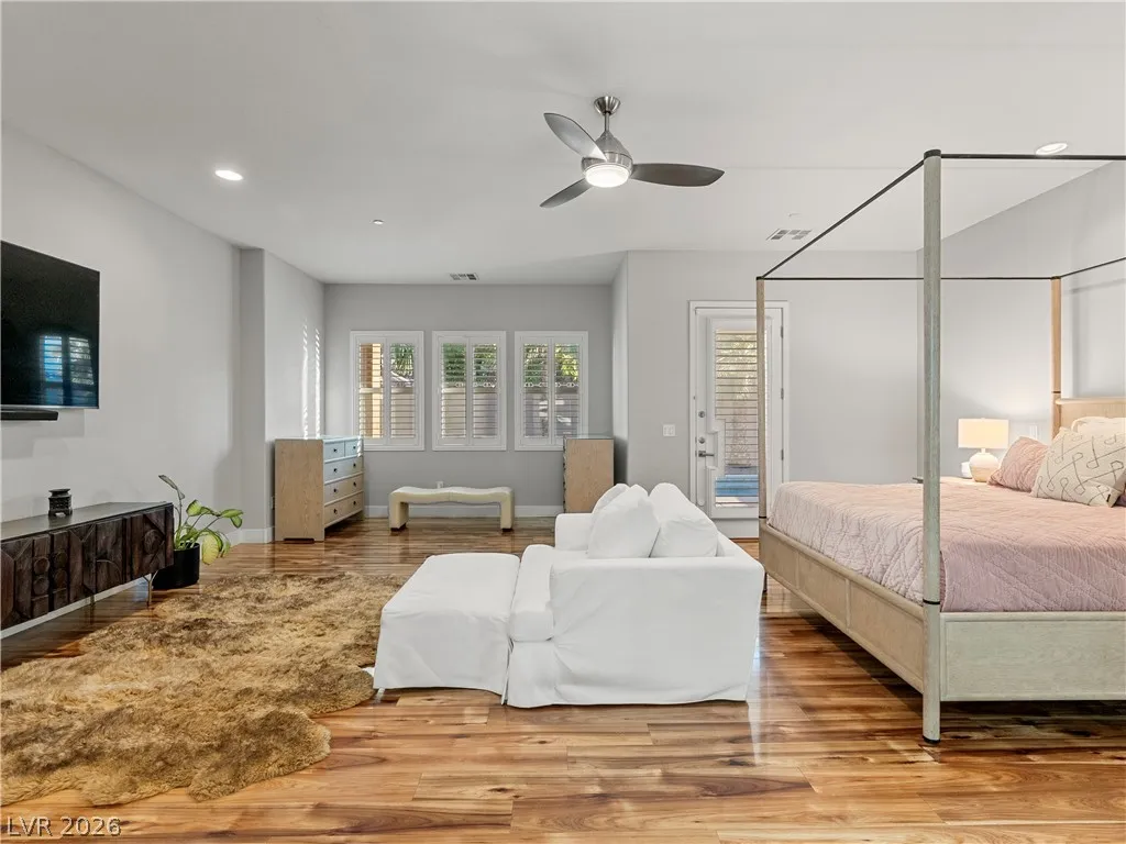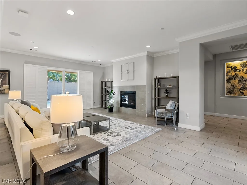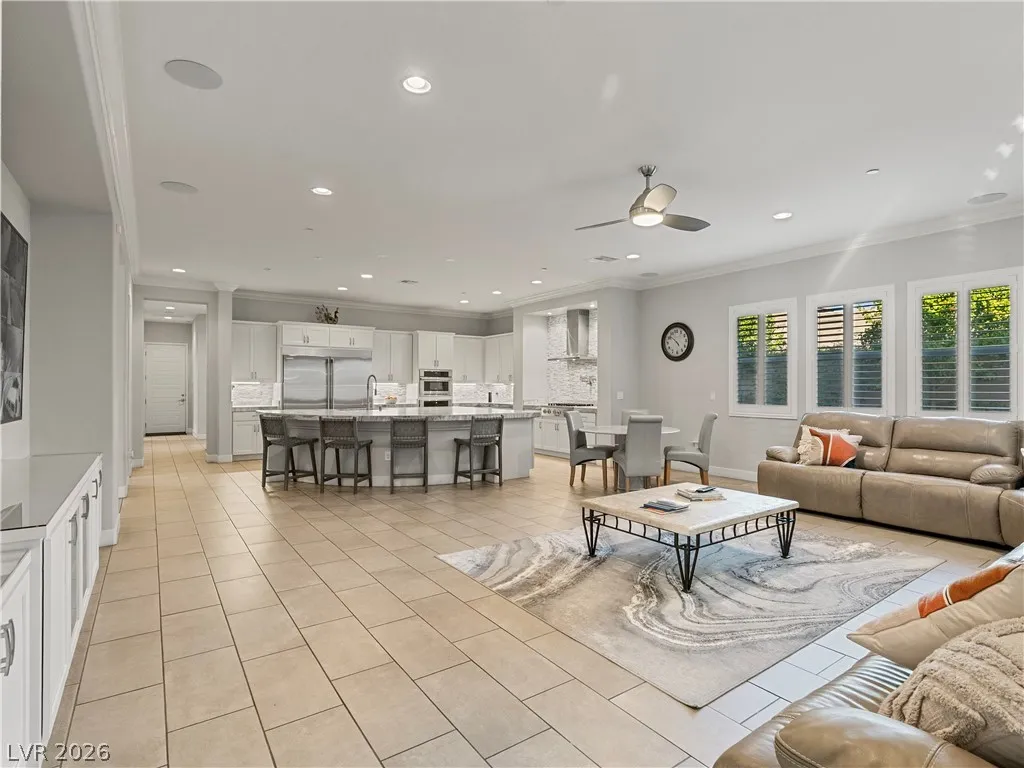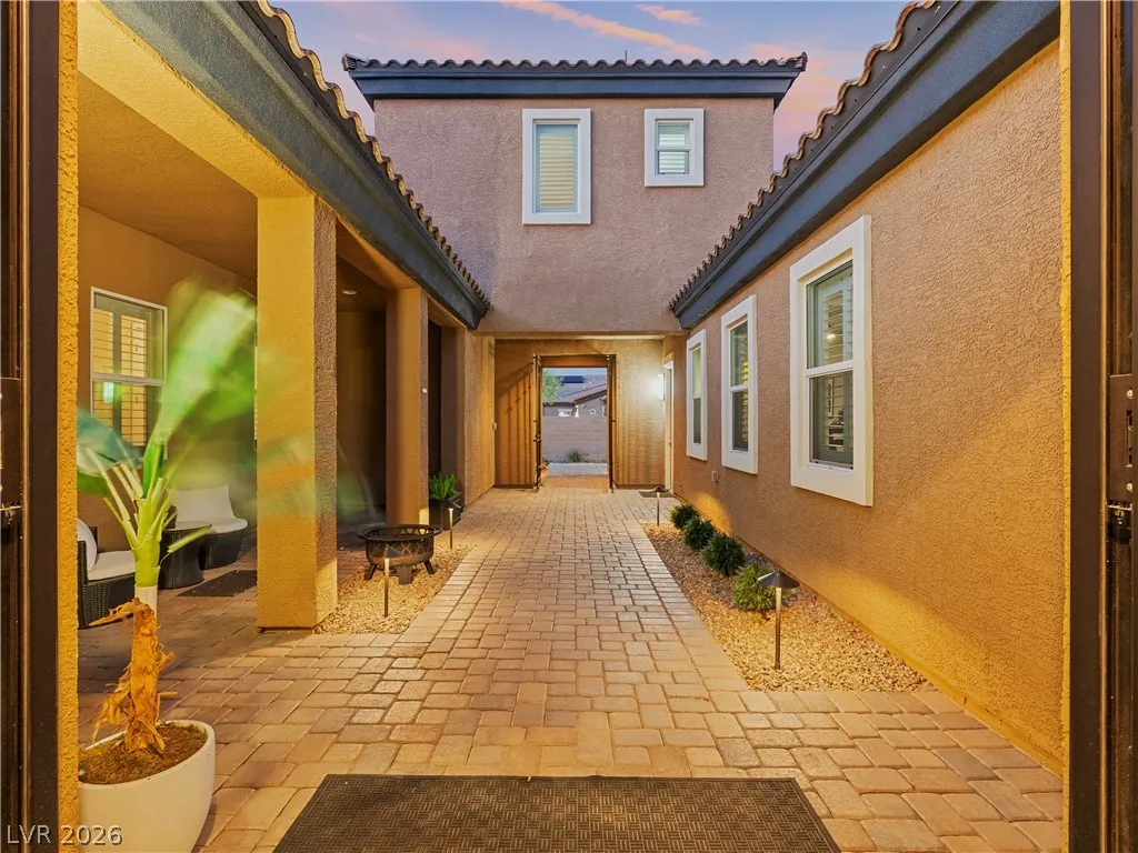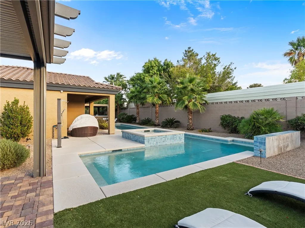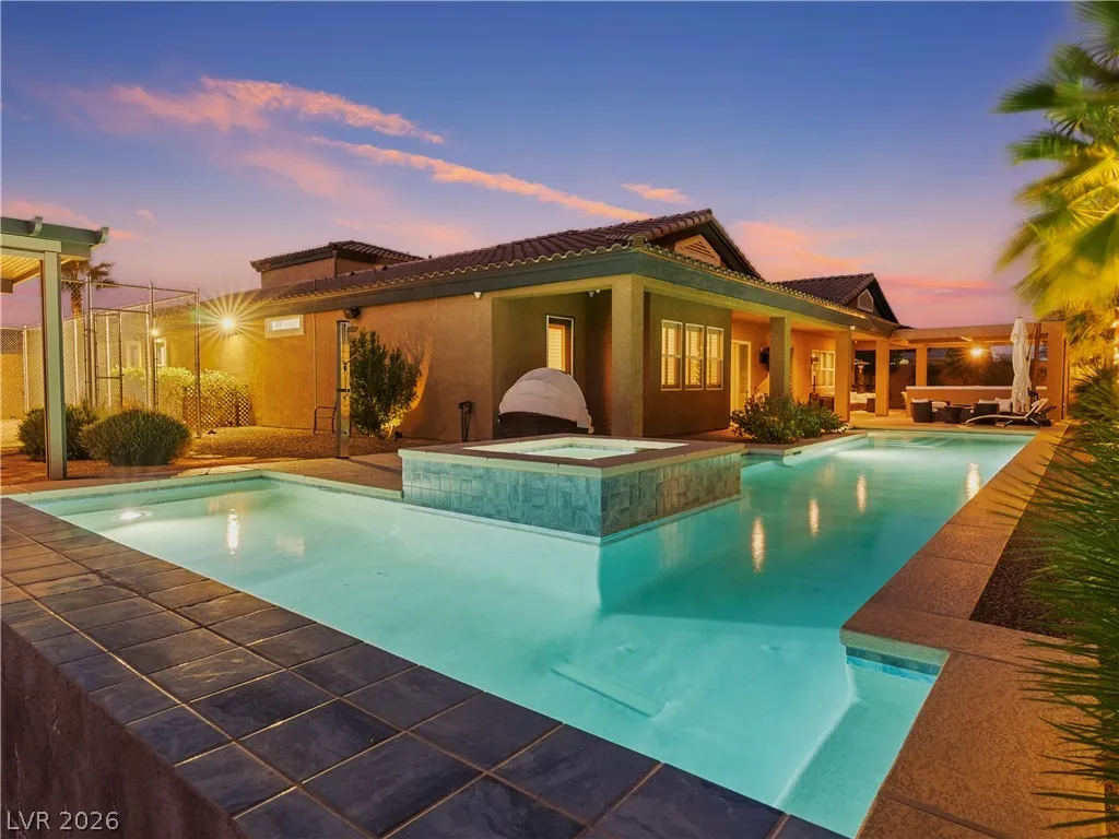 Single-story, no HOA, privately gated estate on over half an acre in Centennial Hills. Designed for everyday living and elevated entertaining, this property features a fully curated outdoor living environment with a heated self-cleaning pool/spa with waterfall feature, an outdoor kitchen with custom stucco patio cover, and a separate pergola with motorized shade and fireside lounge, along with a mini putting green, extended pavers, space for RV parking, and an enclosed half basketball court.