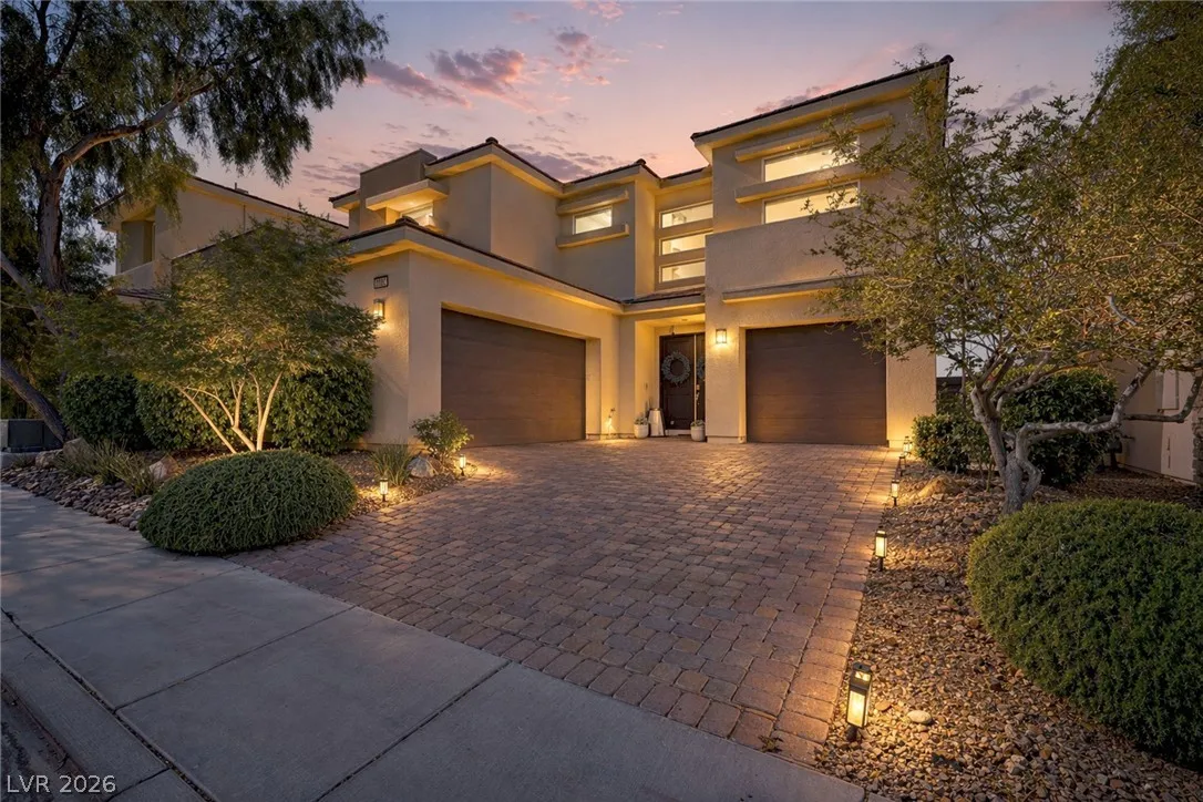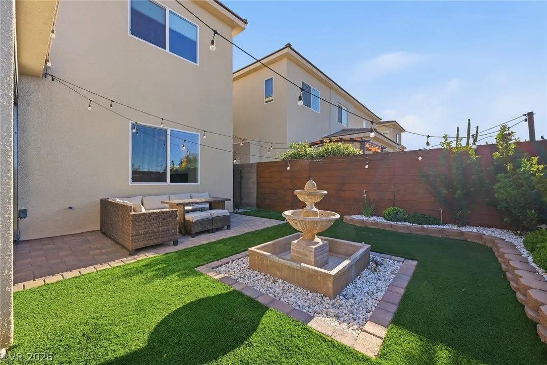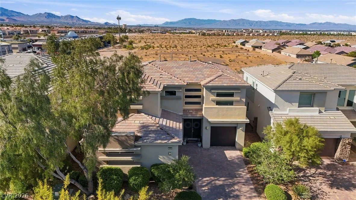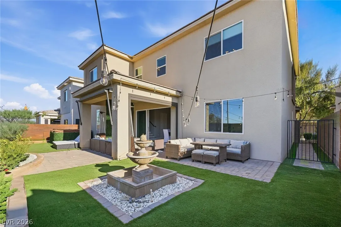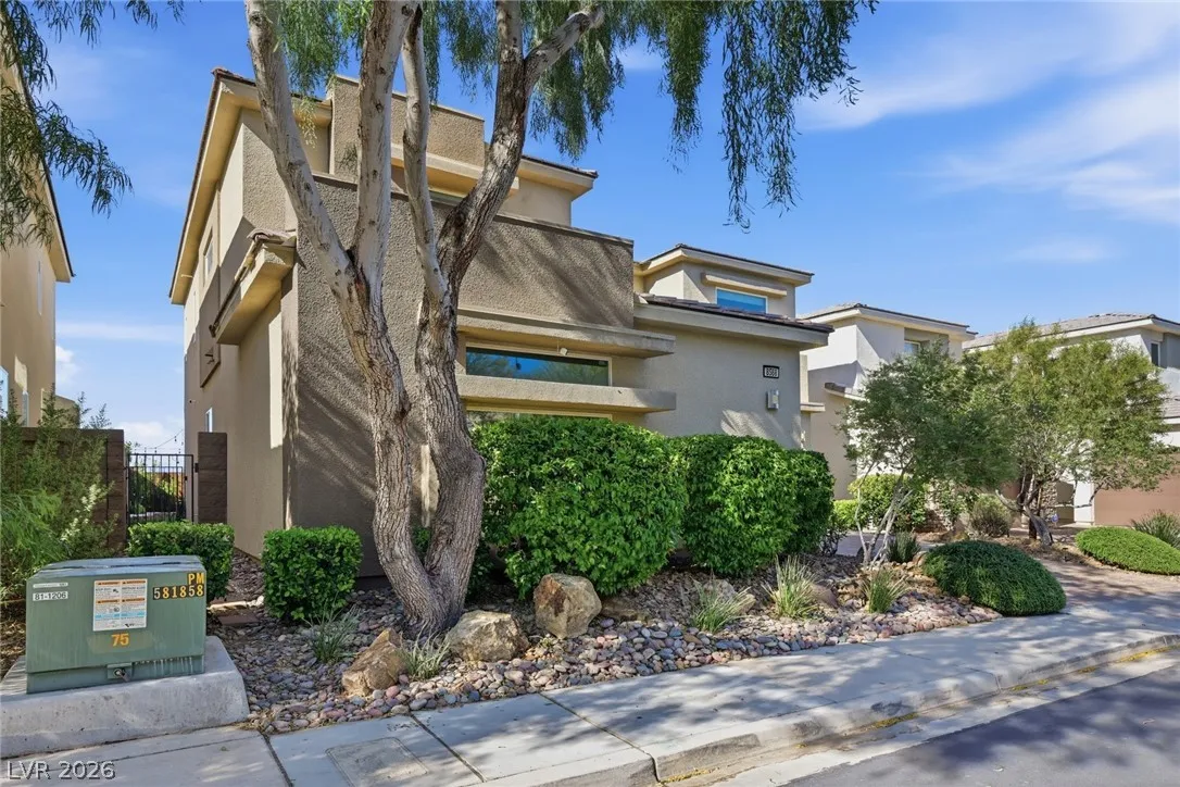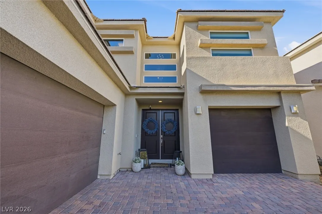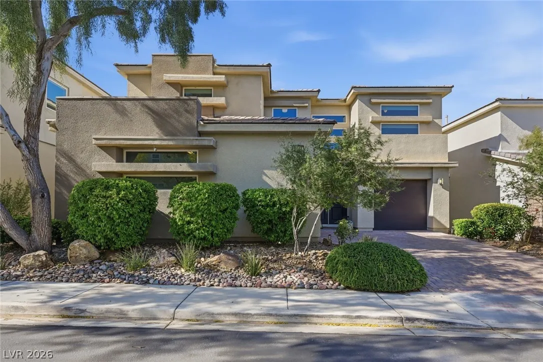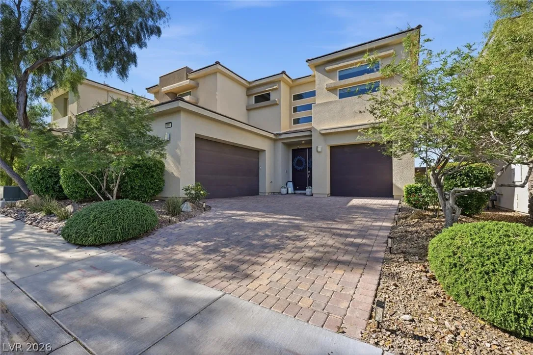Thoughtfully upgraded modern home in a gated Southwest Las Vegas community offering 4 bedrooms, 3 baths, loft & split 3-car garage. Open-concept floor plan features 10-ft ceilings, wide plank flooring, designer lighting & stunning great room w/ custom floor-to-ceiling stone fireplace wall, linear electric fireplace and built-in surround sound. Gourmet kitchen includes waterfall-edge quartz island, shaker cabinetry, black hardware, double ovens, farmhouse sink and large walk-in pantry. Flexible layout includes full bedroom and bath downstairs for possible generational living plus spacious loft with custom built-ins. Primary suite offers soaking tub, oversized walk-in shower and custom closet system. Backyard retreat features covered patio with rolling shutter, spa, fountain, synthetic turf, dog run and paver hardscape. Epoxy garage floors, premium whole-home water filtration, tankless water heater and ideal proximity to 215, Durango Resort, shopping, dining and more. Contact us to view.