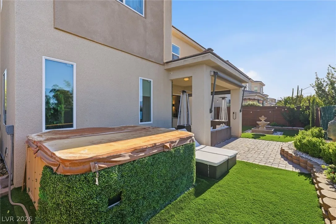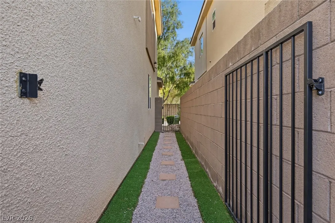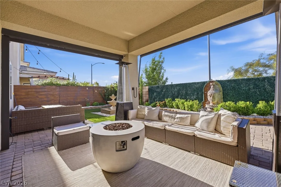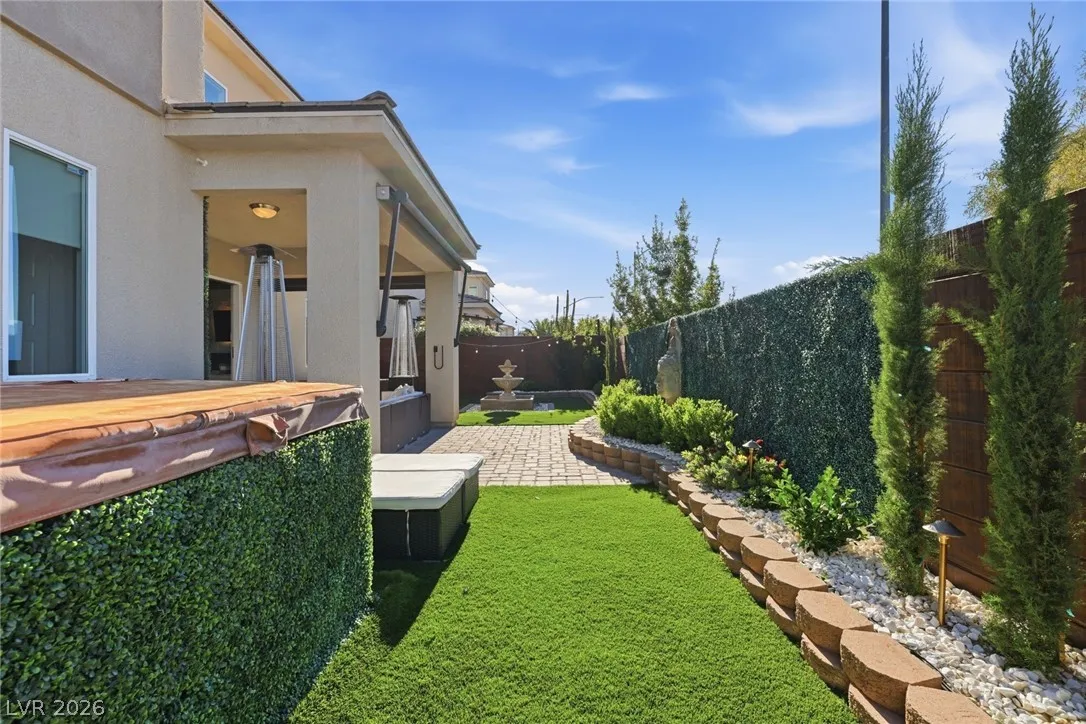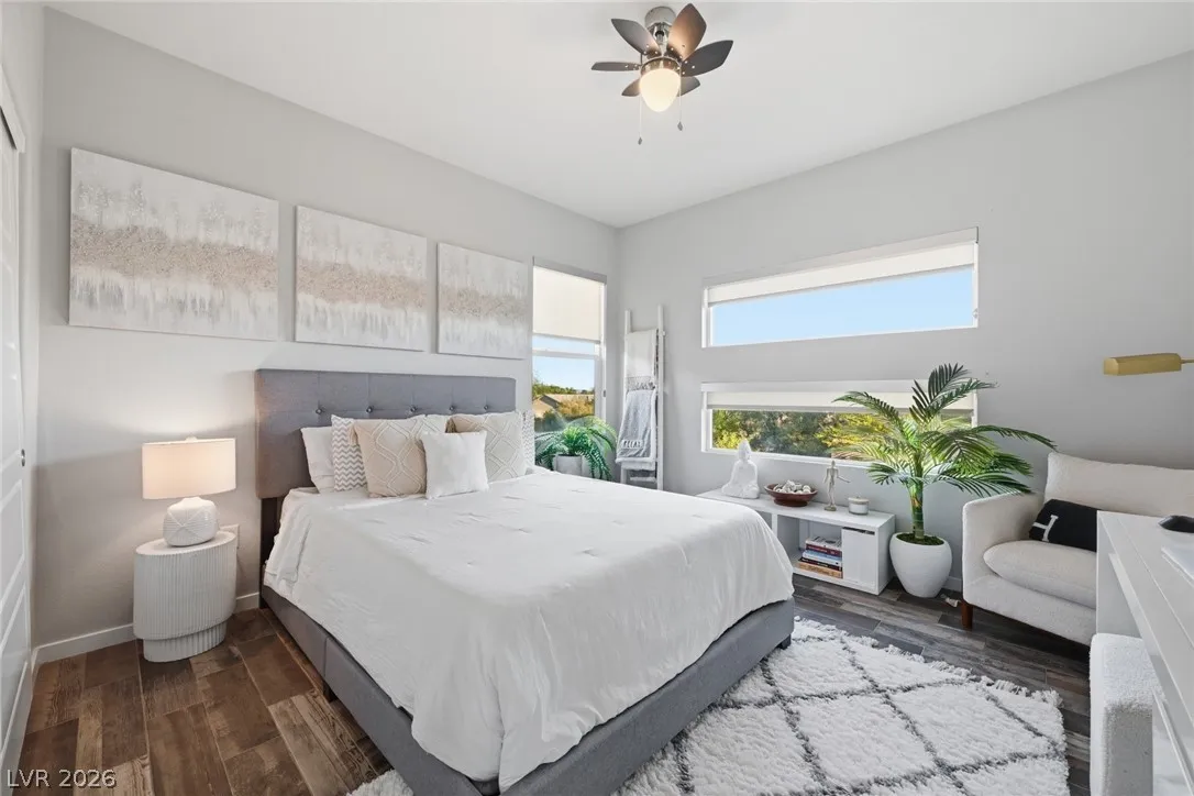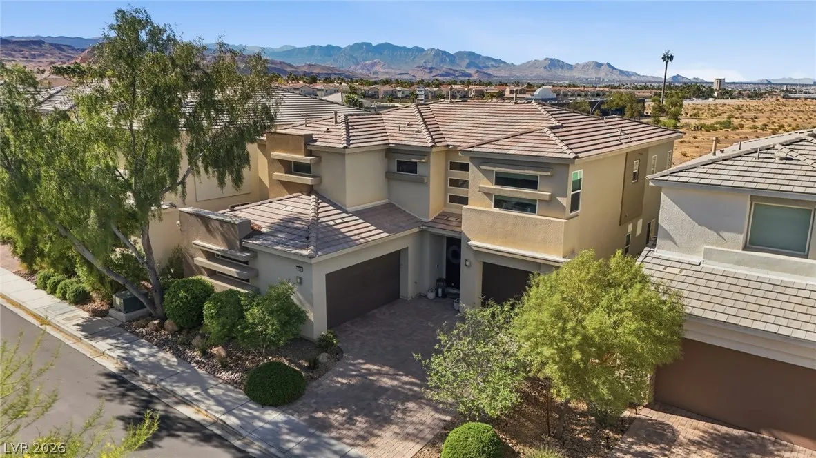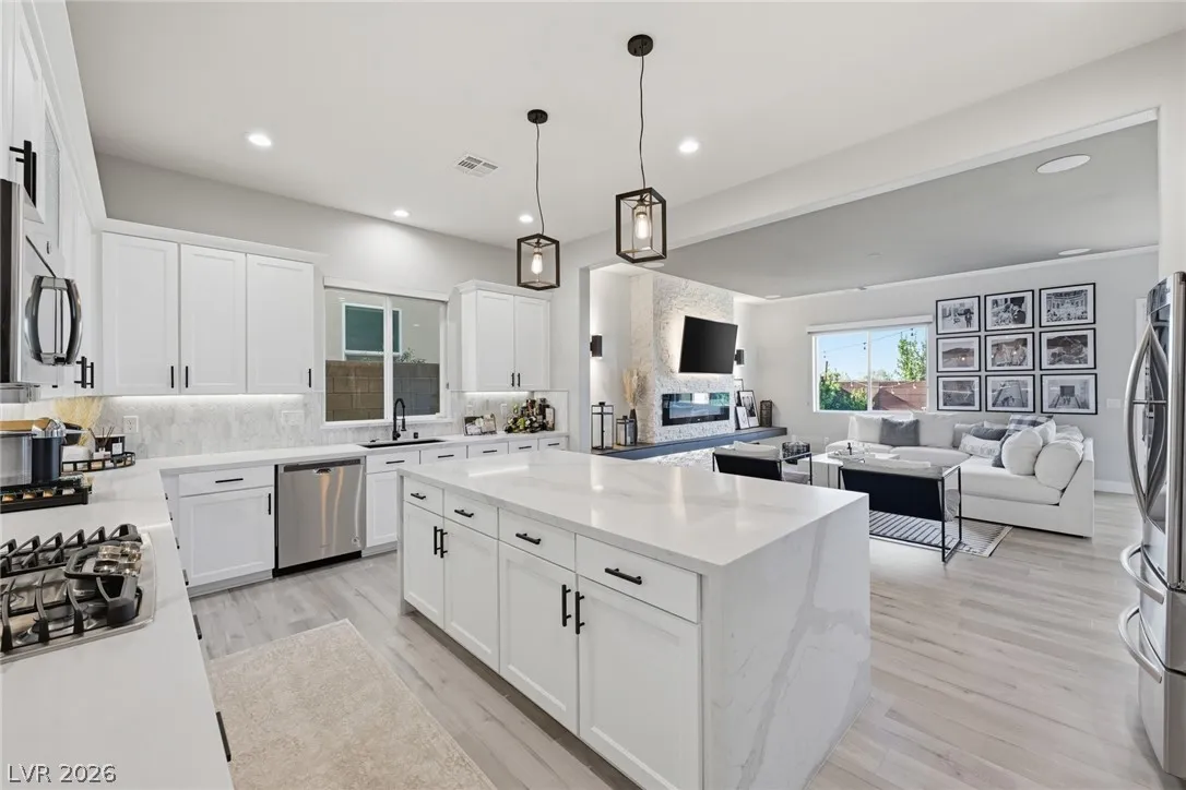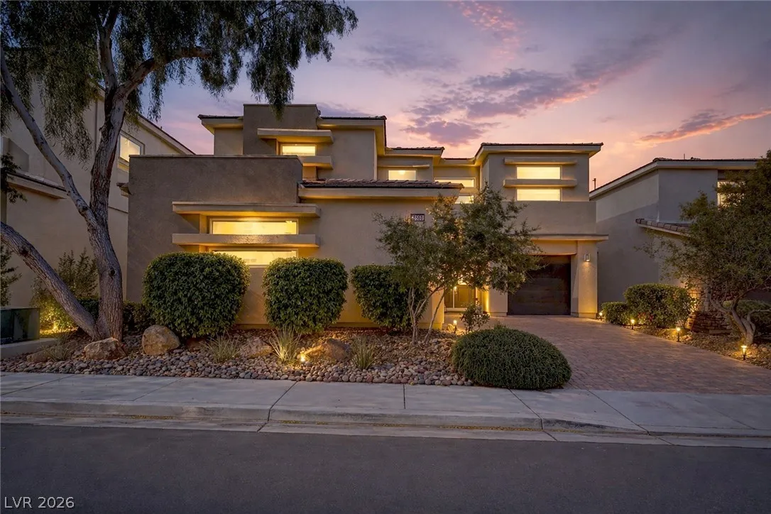 Thoughtfully upgraded modern home in a gated Southwest Las Vegas community offering 4 bedrooms, 3 baths, loft & split 3-car garage. Open-concept floor plan features 10-ft ceilings, wide plank flooring, designer lighting & stunning great room w/ custom floor-to-ceiling stone fireplace wall, linear electric fireplace and built-in surround sound. Gourmet kitchen includes waterfall-edge quartz island, shaker cabinetry, black hardware, double ovens, farmhouse sink and large walk-in pantry. Flexible layout includes full bedroom and bath downstairs for possible generational living plus spacious loft with custom built-ins. Primary suite offers soaking tub, oversized walk-in shower and custom closet system. Backyard retreat features covered patio with rolling shutter, spa, fountain, synthetic turf, dog run and paver hardscape. Epoxy garage floors, premium whole-home water filtration, tankless water heater and ideal proximity to 215, Durango Resort, shopping, dining and more. Contact us to view.