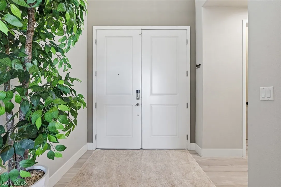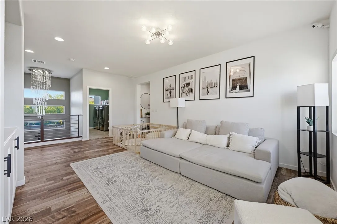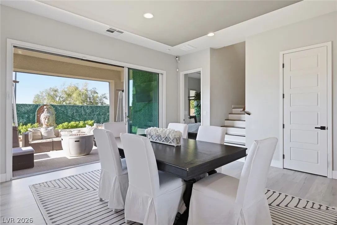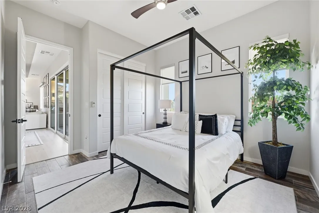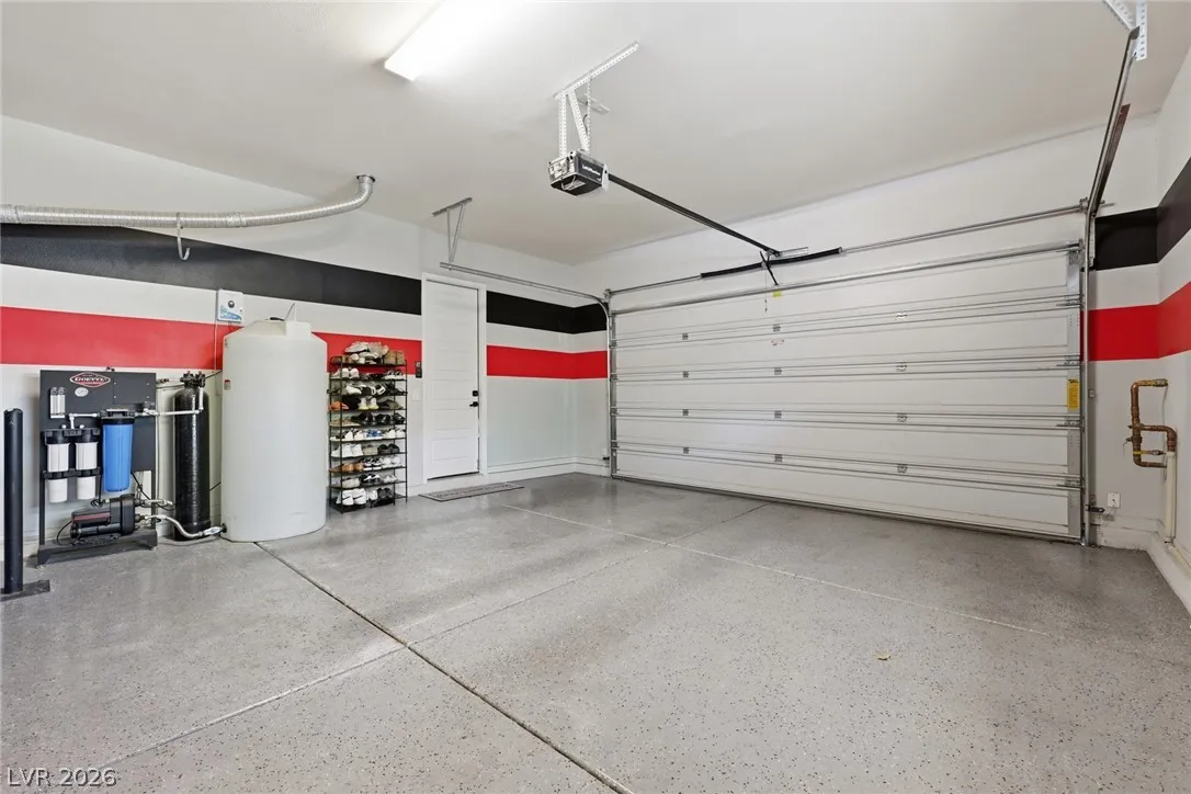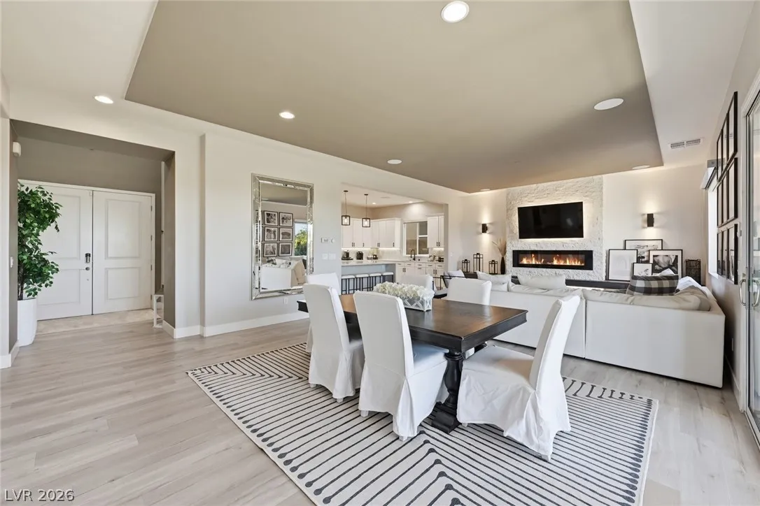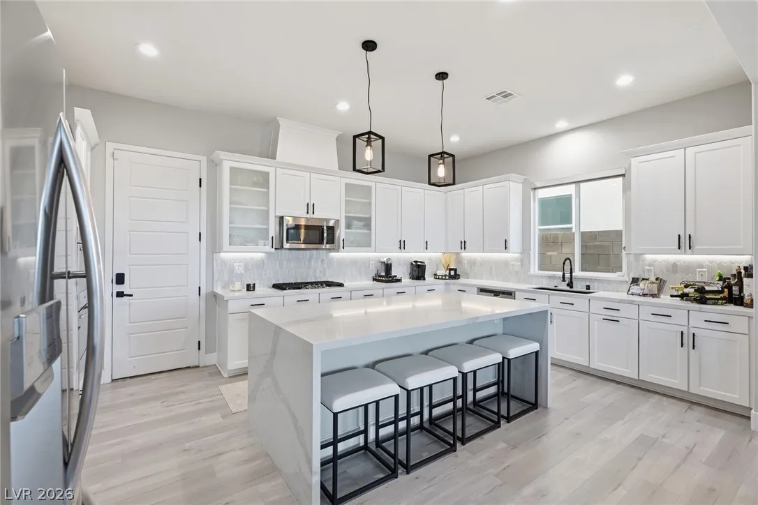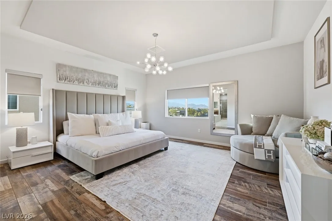 Thoughtfully upgraded modern home in a gated Southwest Las Vegas community offering 4 bedrooms, 3 baths, loft & split 3-car garage. Open-concept floor plan features 10-ft ceilings, wide plank flooring, designer lighting & stunning great room w/ custom floor-to-ceiling stone fireplace wall, linear electric fireplace and built-in surround sound. Gourmet kitchen includes waterfall-edge quartz island, shaker cabinetry, black hardware, double ovens, farmhouse sink and large walk-in pantry. Flexible layout includes full bedroom and bath downstairs for possible generational living plus spacious loft with custom built-ins. Primary suite offers soaking tub, oversized walk-in shower and custom closet system. Backyard retreat features covered patio with rolling shutter, spa, fountain, synthetic turf, dog run and paver hardscape. Epoxy garage floors, premium whole-home water filtration, tankless water heater and ideal proximity to 215, Durango Resort, shopping, dining and more. Contact us to view.