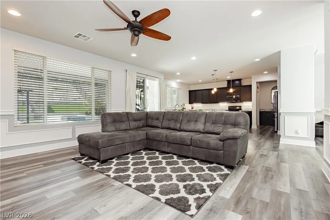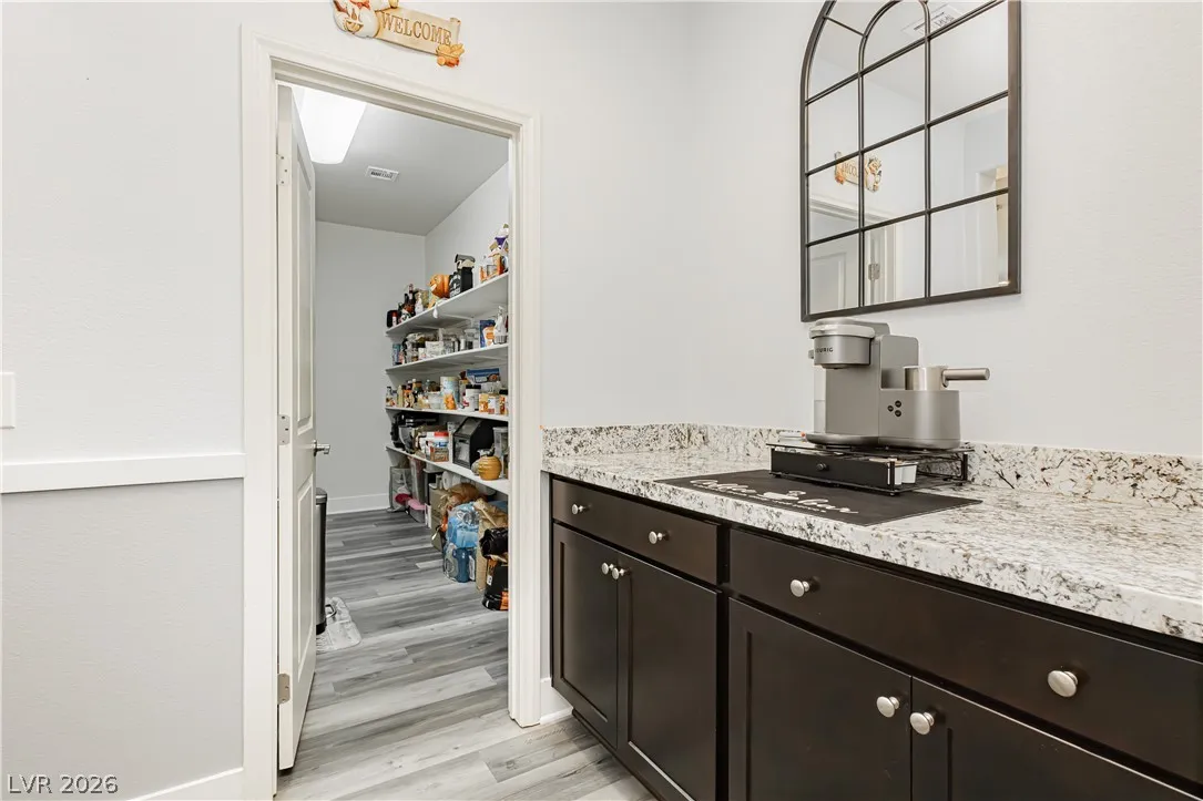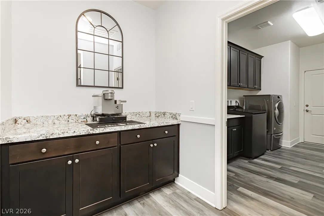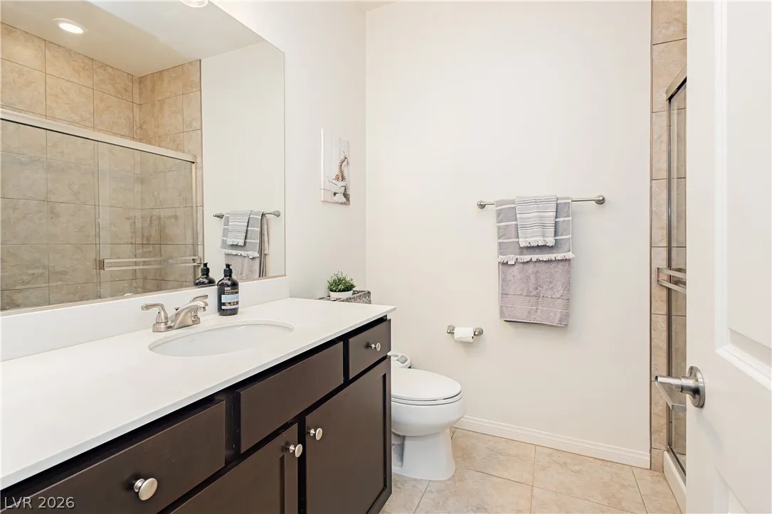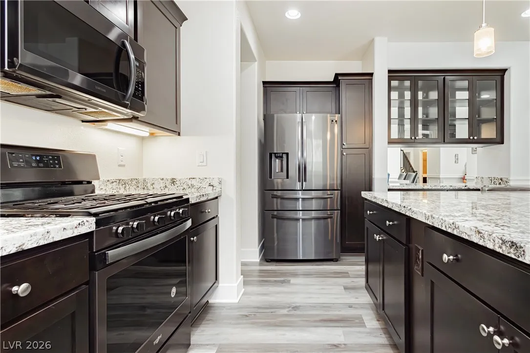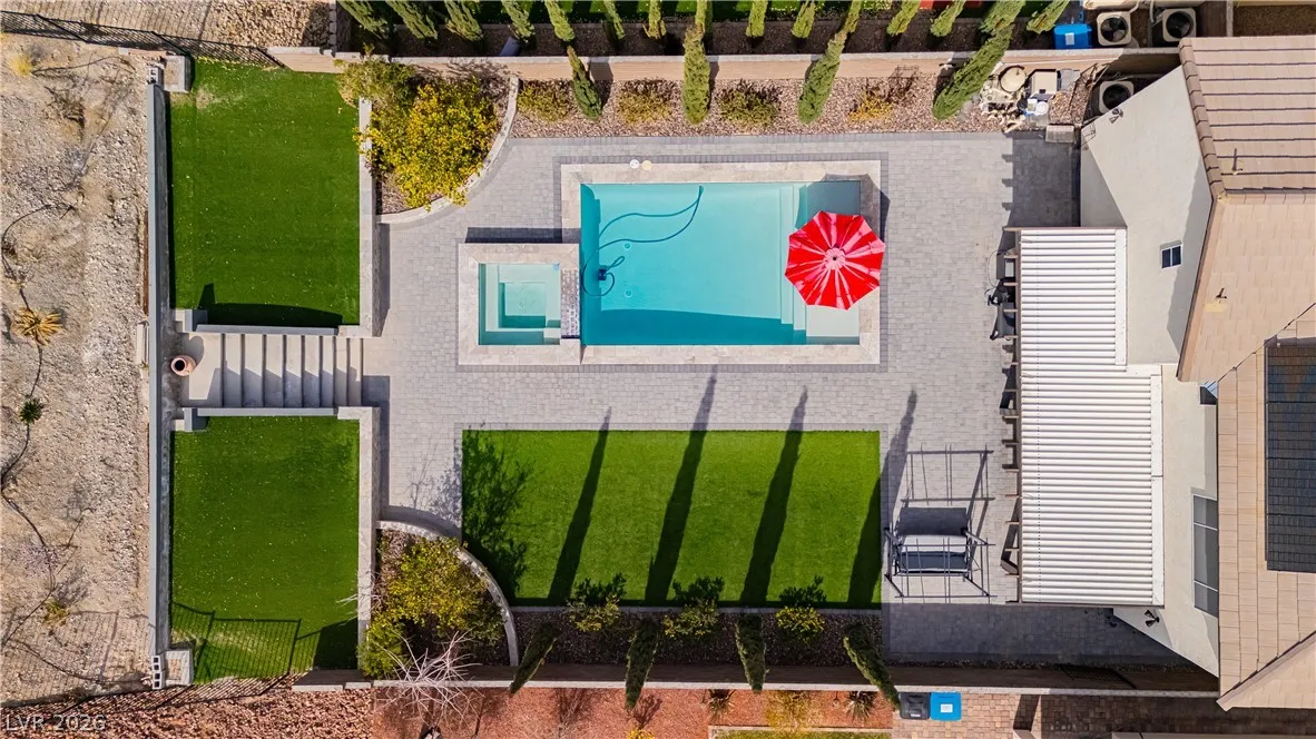 Better than new! Awesome Location, easy freeway access to Mt Charleston, Summerlin, shopping & parks, etc. Beautiful home accented w/stone facia, oversized lot w/inground pool/spa, mature landscape, cypress trees, faux grass, pavers on all areas around pool/spa, courtyard, cvrd patio, walkways, & driveway. As you enter you noticed accented walls, architectural designed chair rails, two-tone paint, stunning engineered laminate wood flooring, 9ft ceilings, bright & open living area, kitchen offering an expansive island, granite countertops, stainless steel appliances, plenty of cabinets, pendant & recessed lighting, generous walk-in pantry, dnstrs bdrm with 3/4 bath offering flexibility for guests, upstairs secondary bdrms w/Jack & Jill bath, incredible size loft, primary suite enhanced by spa like walk-in shower & drying area, dual sinks & vanity, kingsize walk-in closet, laundry rm w/sink & cabinets, garage w/epoxy floors & storage racks. SOLAR PANELS 2YRS OLD WILL BE PAID OFF AT COE
