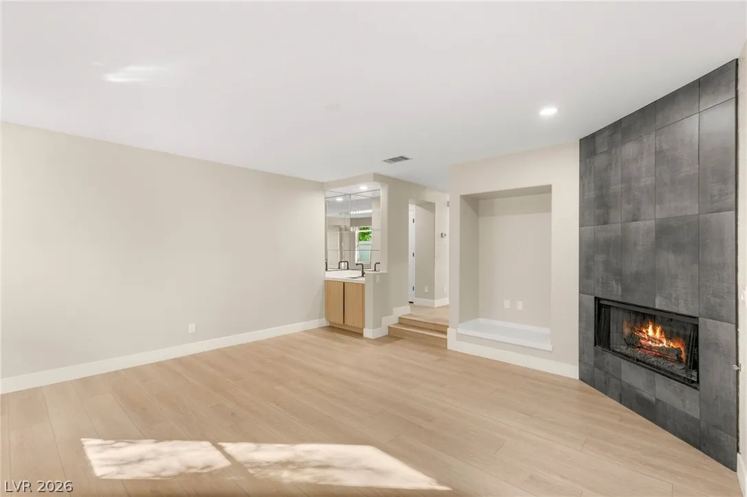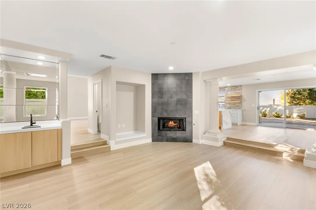 cabinetry. A sunken living room with wet bar and fireplace provides a distinctive space ideal for