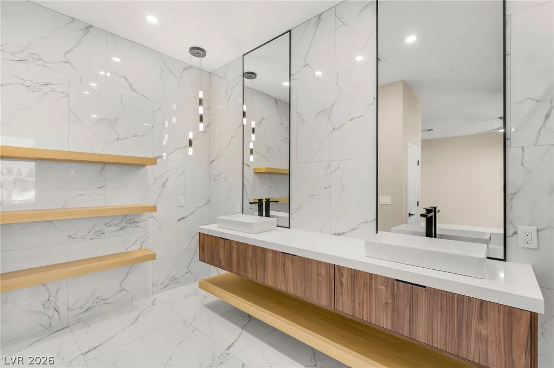 spa-inspired bath with floating vanities, soaking tub, oversized frameless shower, and a private balcony.