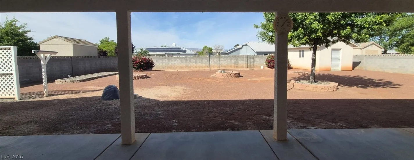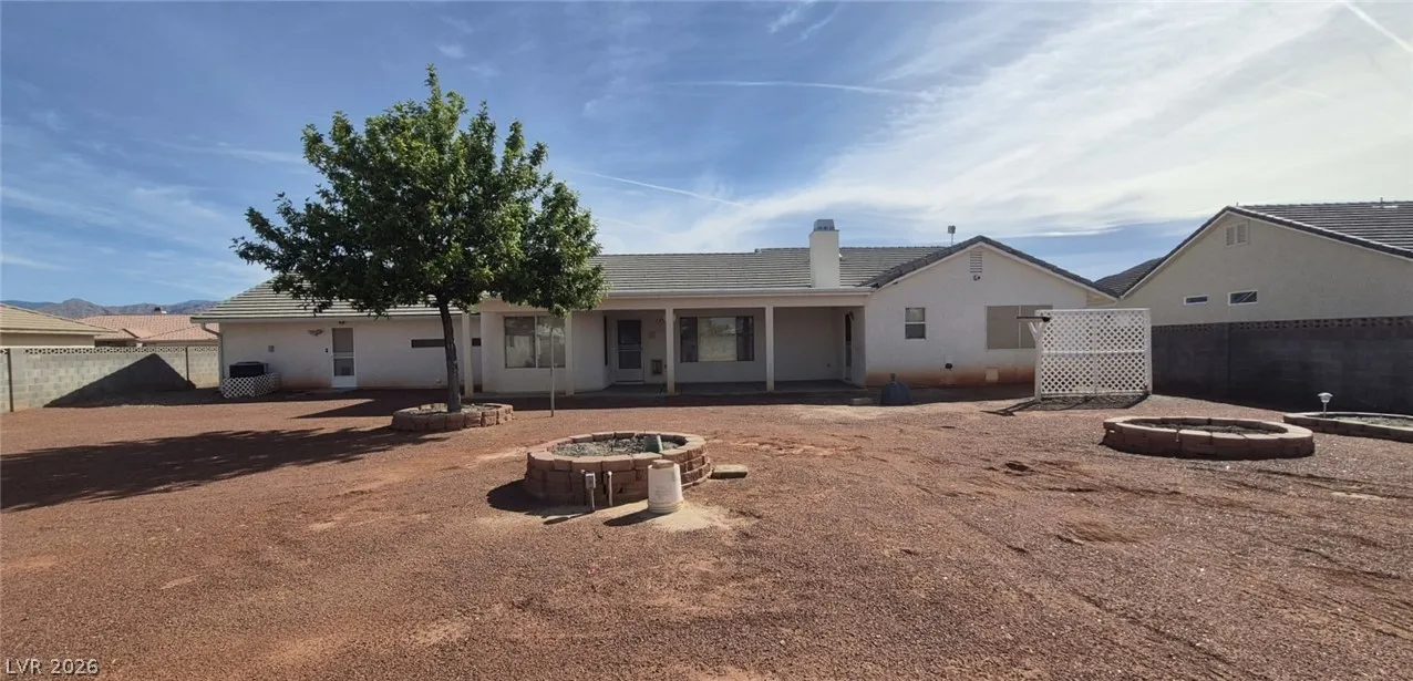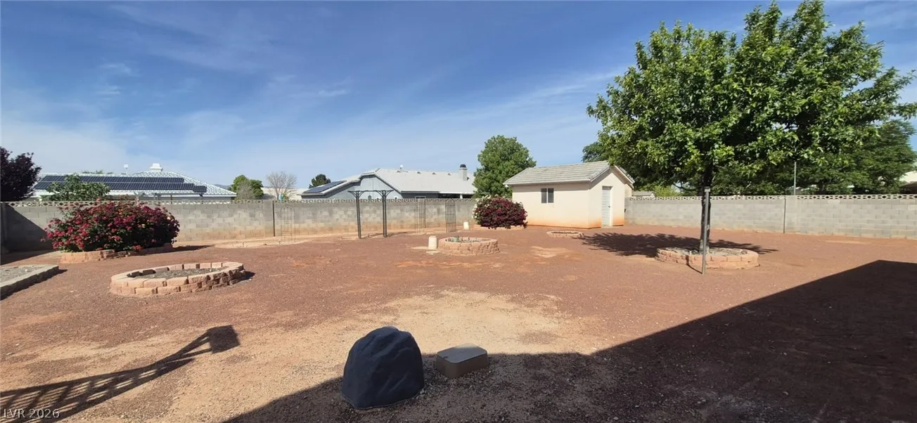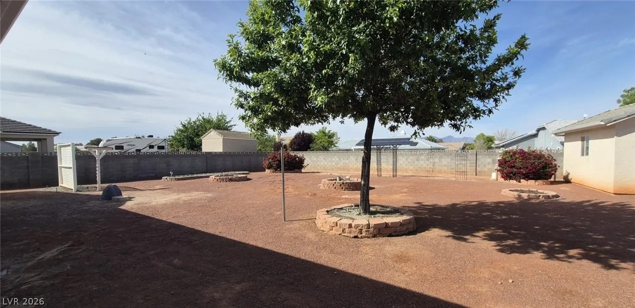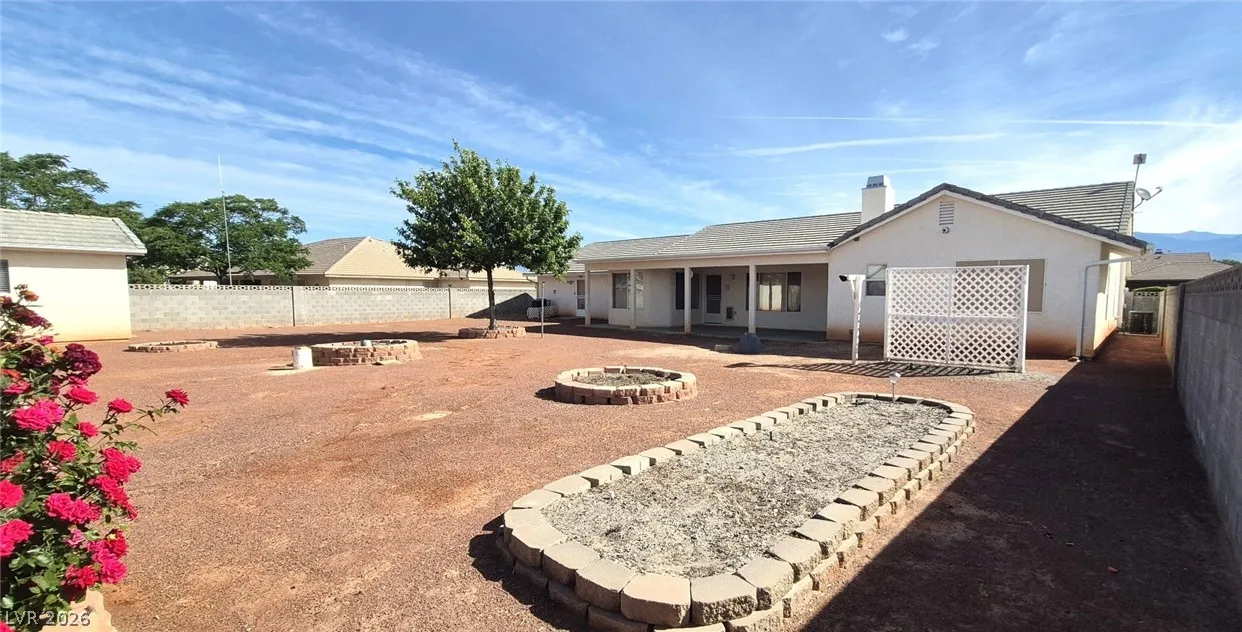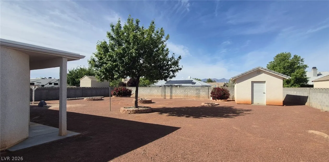Ranch style floorplan with large, spacious rooms. Formal front entry with custom porcelain tile insert, rear facing living room with wood burning fireplace and open floorplan to the kitchen and breakfast nook. Front part of laundry room contains a built-in desk and exit to garage, which is off of the kitchen. Front facing guest bedrooms both contain bay windows, ceiling fans and lights. Very spacious rear facing primary bedroom can hold large furnishings. Primary bathroom has dual sinks, make-up area, separate tub and shower, walk-in closet, and a doorway to the covered patio. Backyard contains desert style landscaping and a frame/stucco shed built on a slab. The side yard has RV parking with water, electric and sewer connections. The house is pre-wired for alarm system, surround sound, and water filtration system. The covered patio had the roofing replaced approx 1 year ago with TPO roofing membrane.