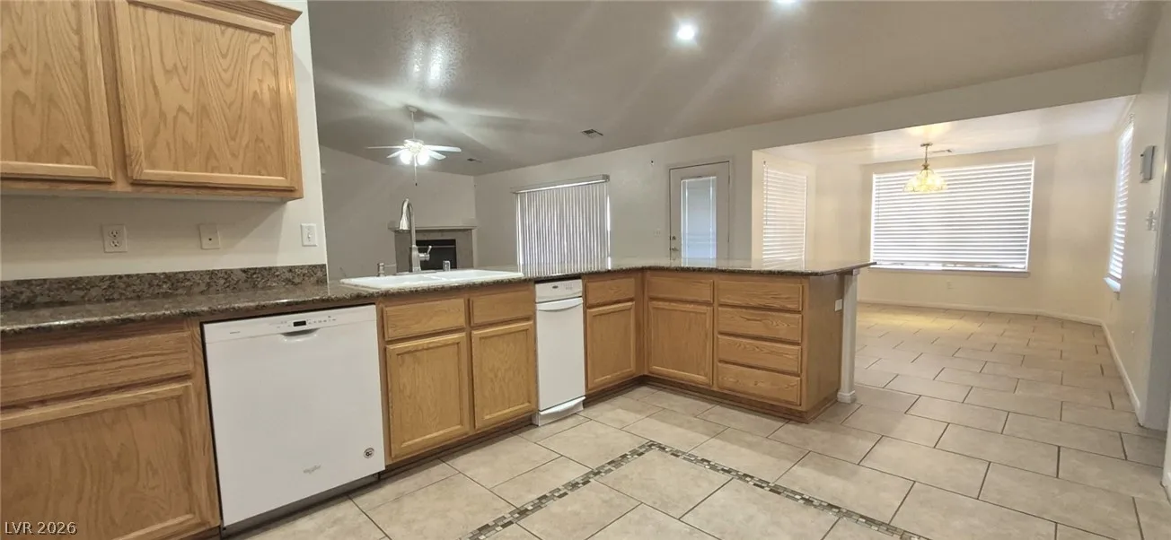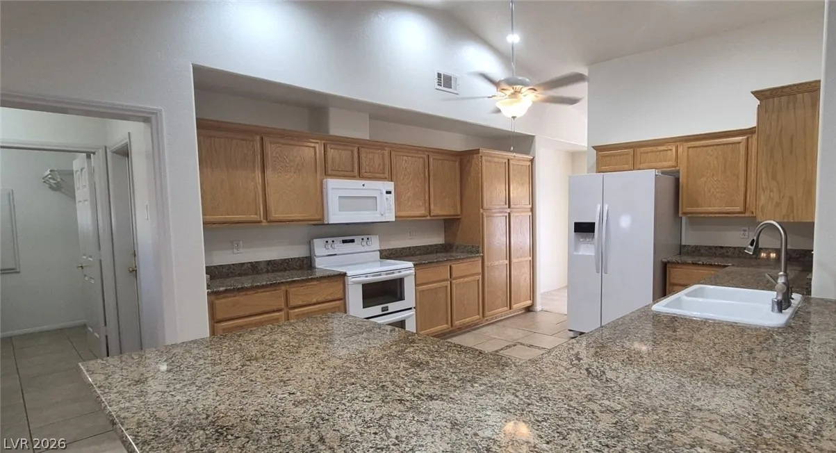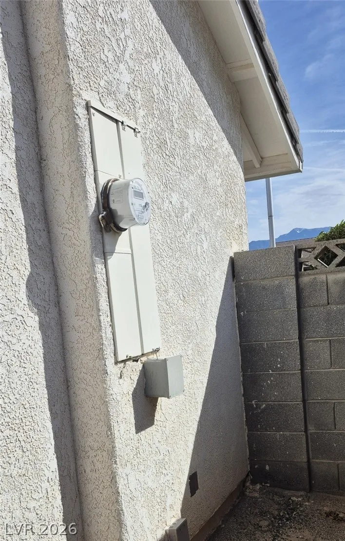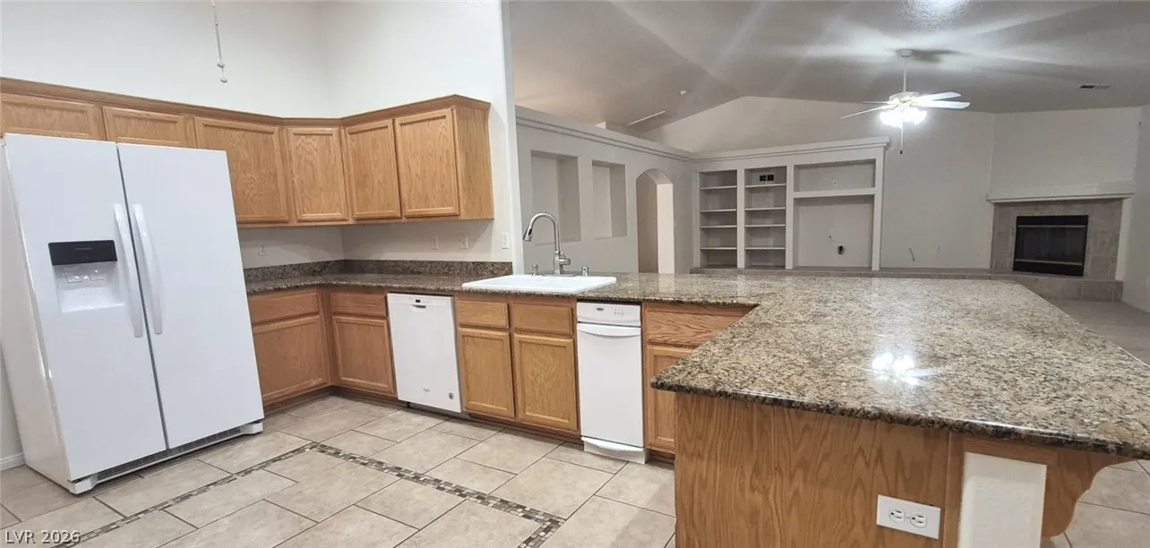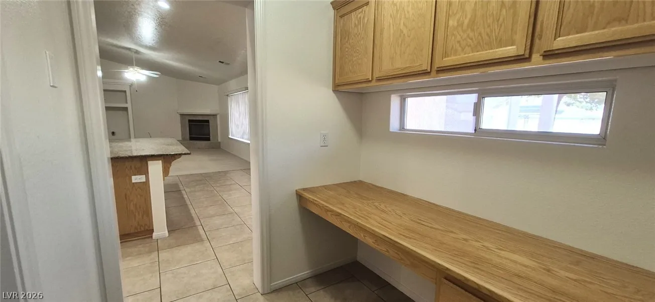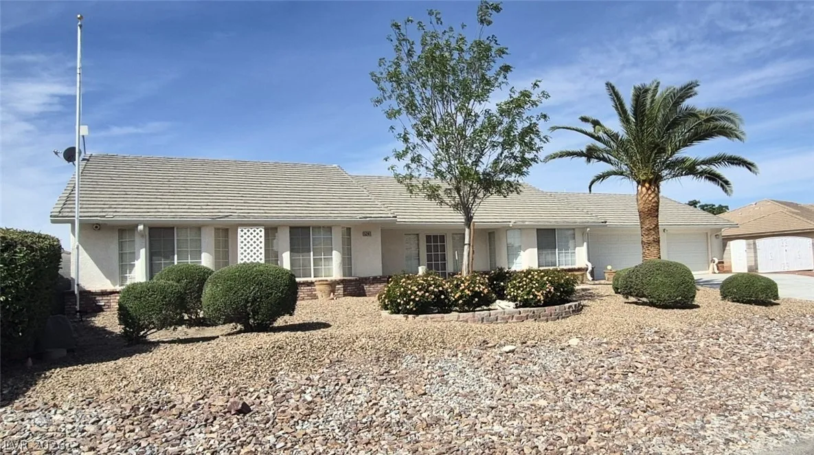 Ranch style floorplan with large, spacious rooms. Formal front entry with custom porcelain tile insert, rear facing living room with wood burning fireplace and open floorplan to the kitchen and breakfast nook. Front part of laundry room contains a built-in desk and exit to garage, which is off of the kitchen. Front facing guest bedrooms both contain bay windows, ceiling fans and lights. Very spacious rear facing primary bedroom can hold large furnishings. Primary bathroom has dual sinks, make-up area, separate tub and shower, walk-in closet, and a doorway to the covered patio. Backyard contains desert style landscaping and a frame/stucco shed built on a slab. The side yard has RV parking with water, electric and sewer connections. The house is pre-wired for alarm system, surround sound, and water filtration system. The covered patio had the roofing replaced approx 1 year ago with TPO roofing membrane.