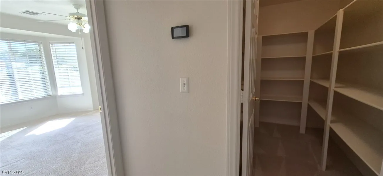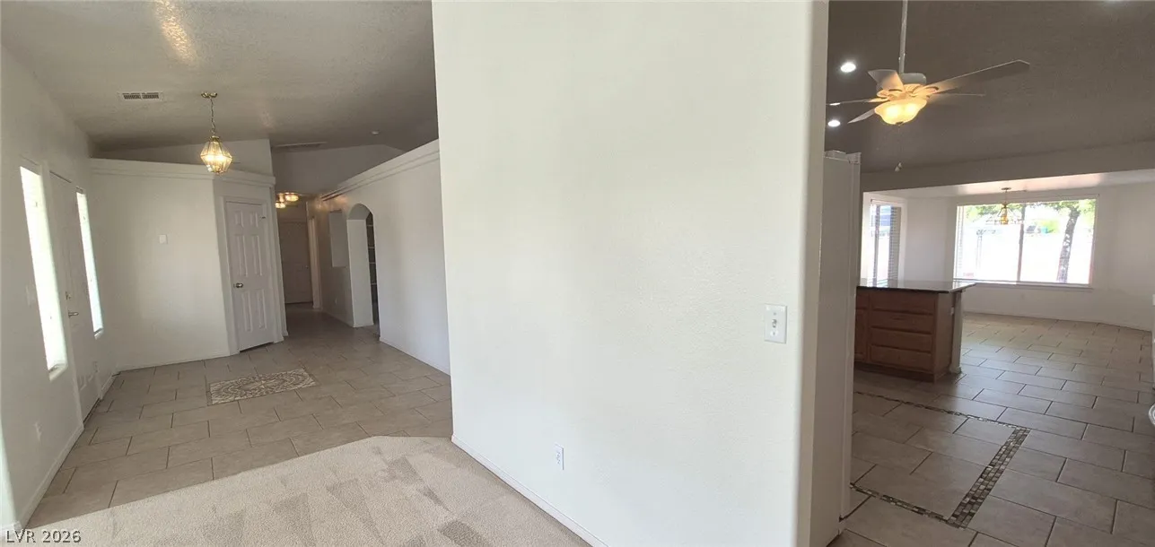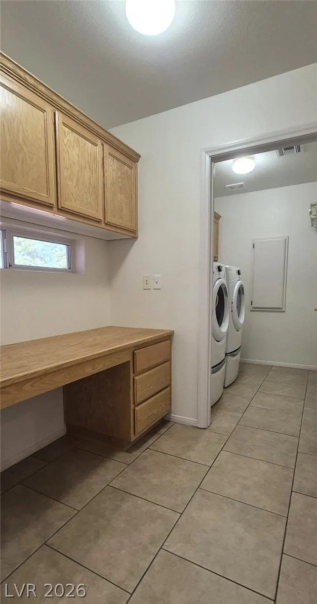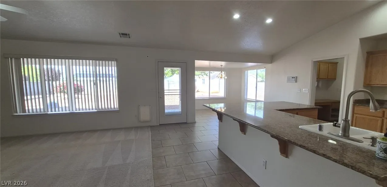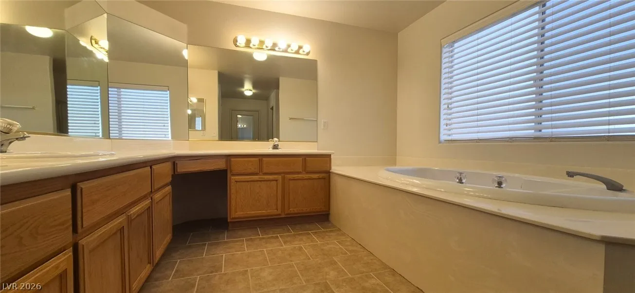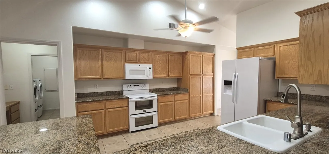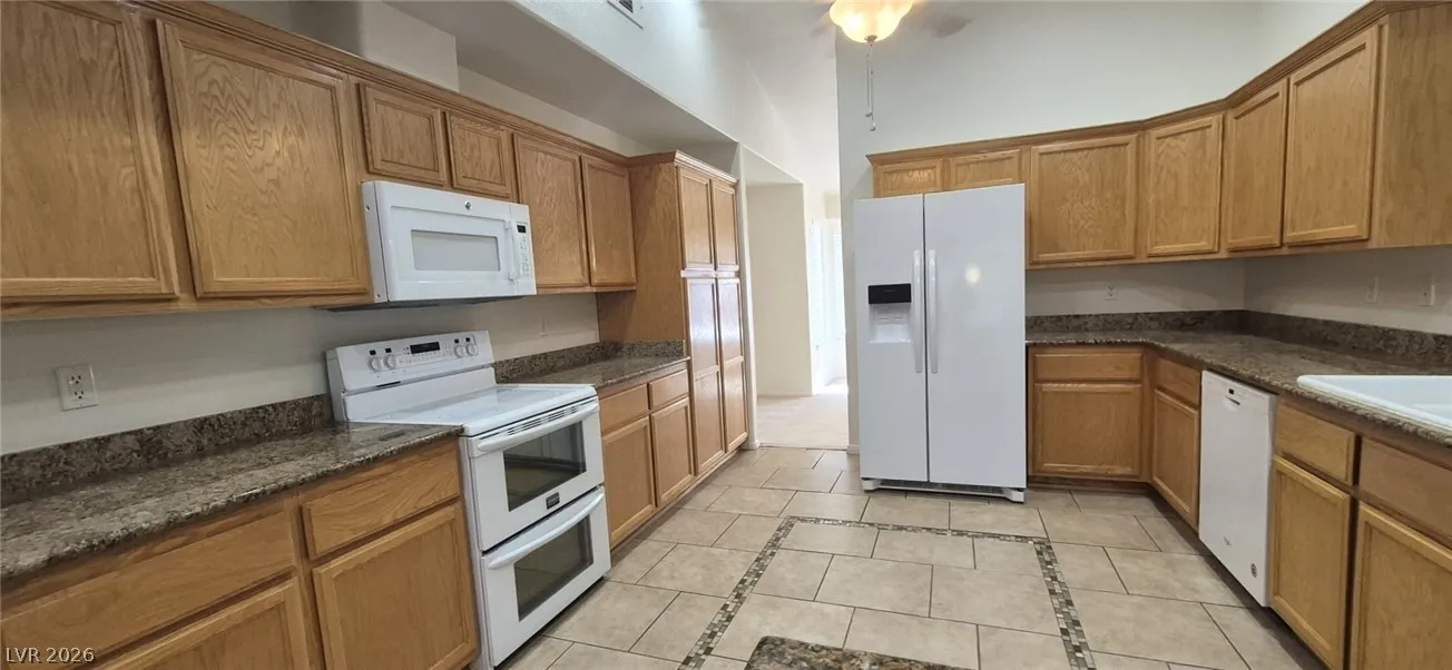 Ranch style floorplan with large, spacious rooms. Formal front entry with custom porcelain tile insert, rear facing living room with wood burning fireplace and open floorplan to the kitchen and breakfast nook. Front part of laundry room contains a built-in desk and exit to garage, which is off of the kitchen. Front facing guest bedrooms both contain bay windows, ceiling fans and lights. Very spacious rear facing primary bedroom can hold large furnishings. Primary bathroom has dual sinks, make-up area, separate tub and shower, walk-in closet, and a doorway to the covered patio. Backyard contains desert style landscaping and a frame/stucco shed built on a slab. The side yard has RV parking with water, electric and sewer connections. The house is pre-wired for alarm system, surround sound, and water filtration system. The covered patio had the roofing replaced approx 1 year ago with TPO roofing membrane.