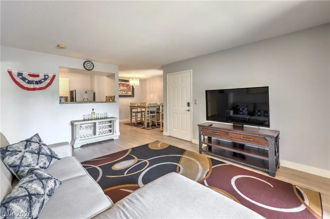 This is a special unit. Partially furnished! Beautiful flooring throughout. No carpet! Matching tile backsplash and matching granite countertops in kitchen and primary bath. Modern, upgraded dual vanities, upgraded lighting, and large tiles in primary shower. New built-in microwave and new coffee maker perfect for your eating area off the kitchen. Covered front patio with sliding glass door. All furniture and appliances will stay including the washer and dryer. Gated neighborhood. Assigned parking and guest parking. Two community pools, barbeque areas, fire pit, and spa tub. Call agent with questions!