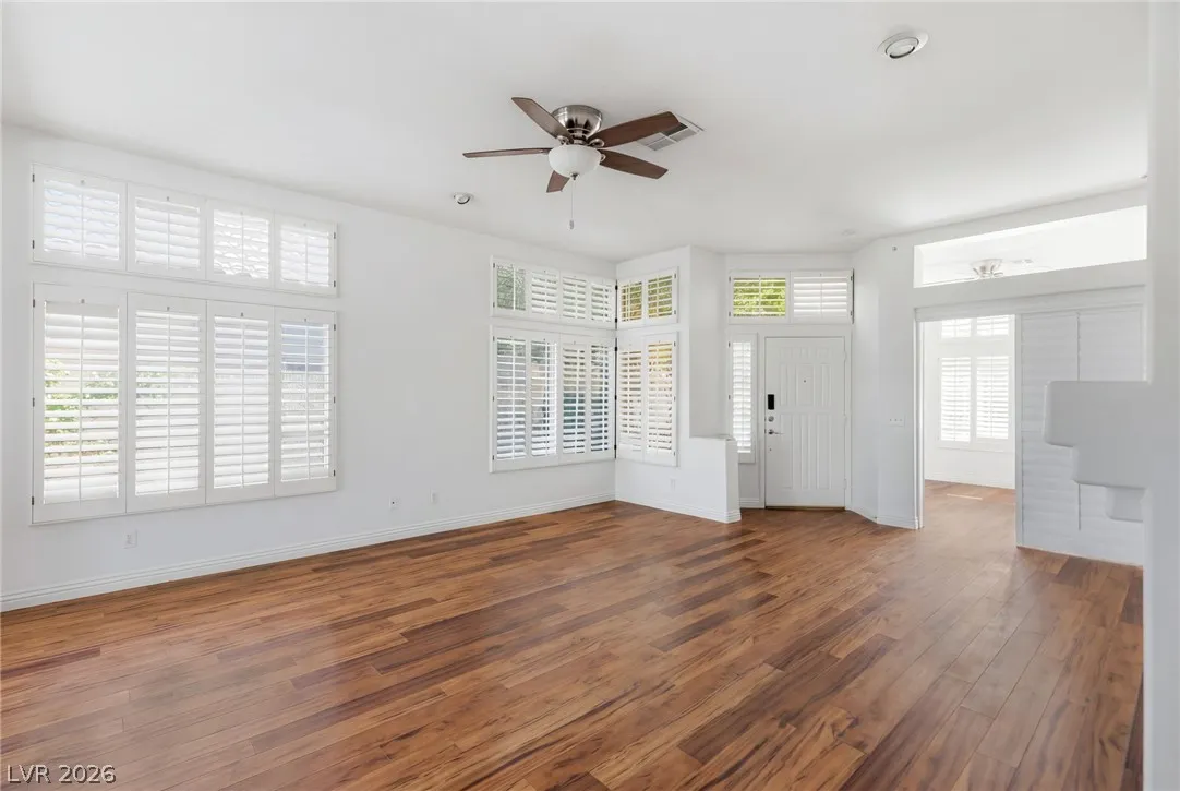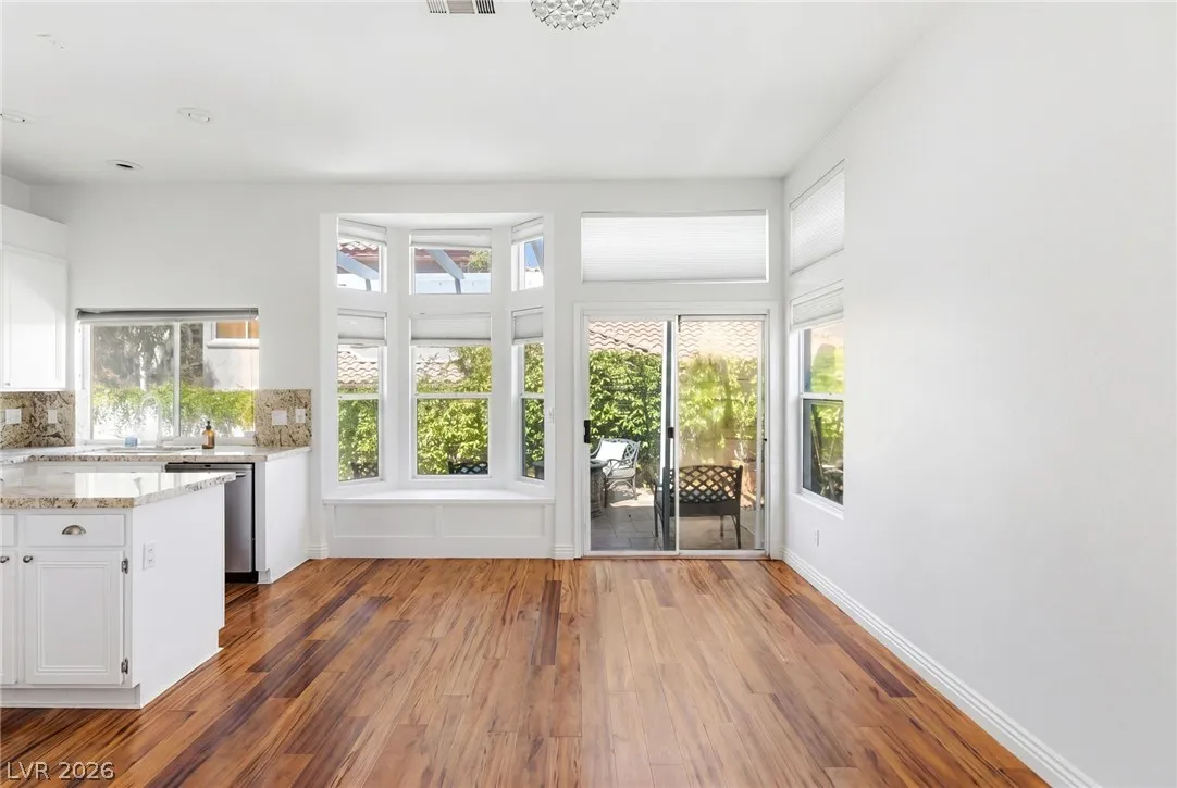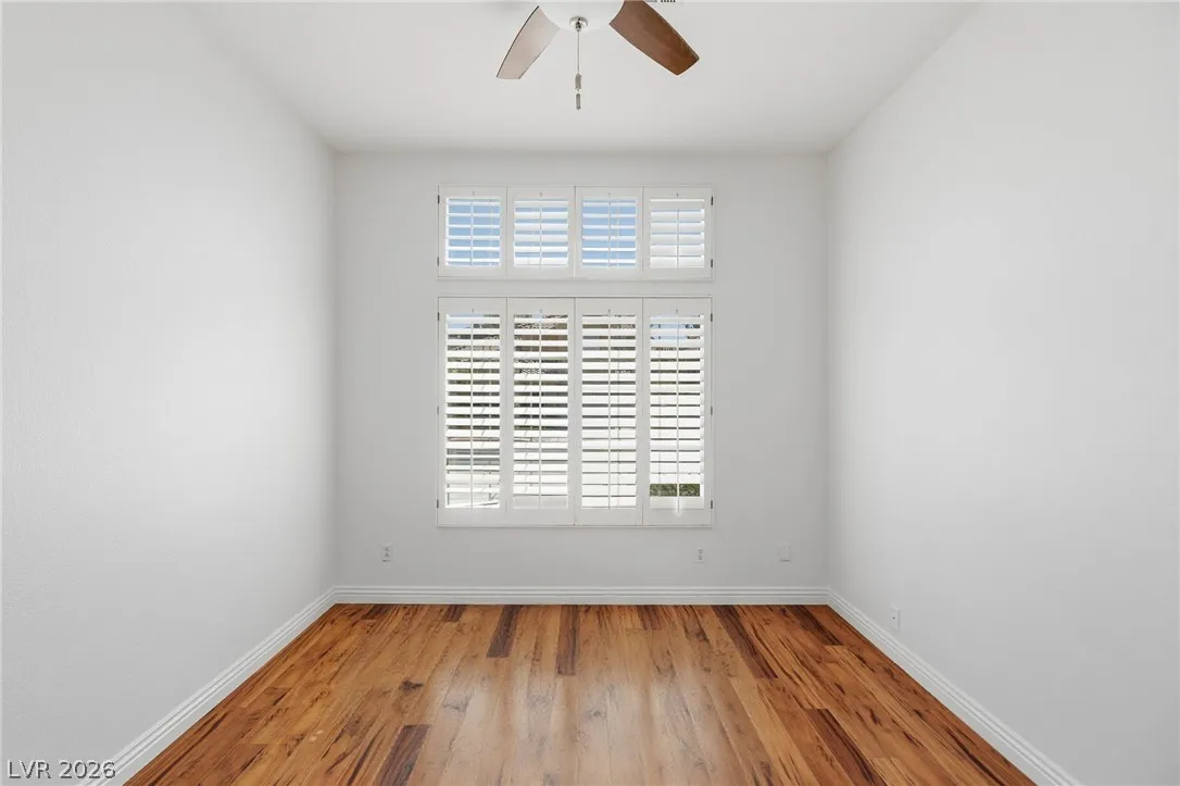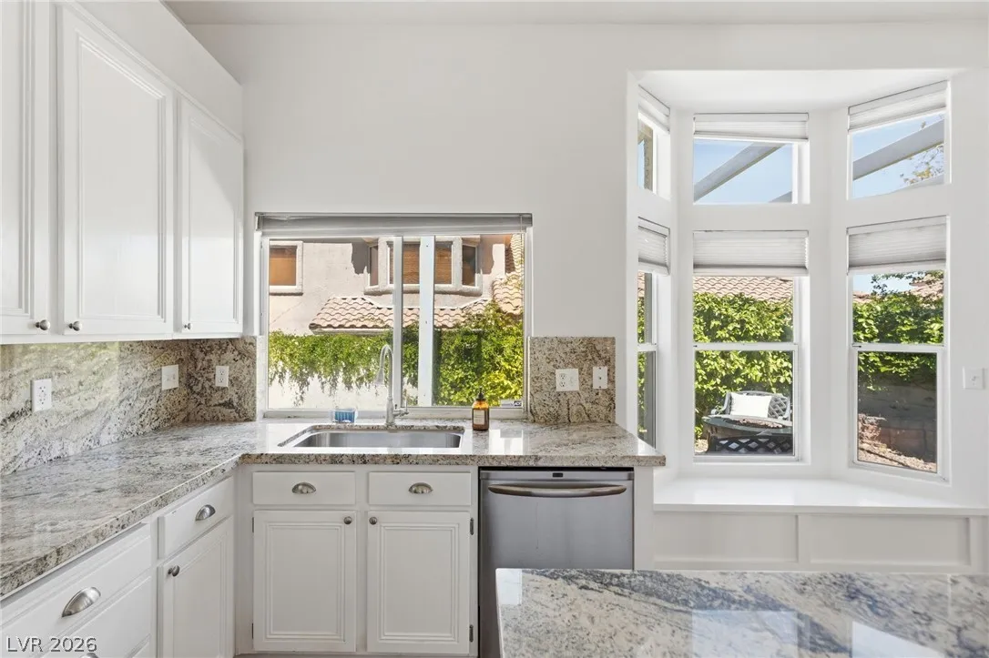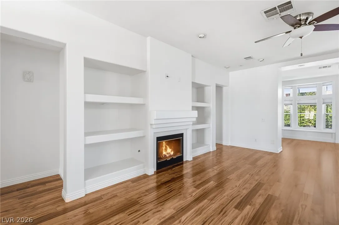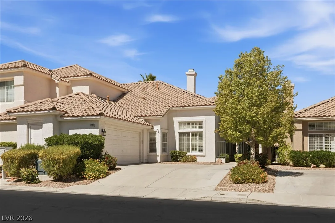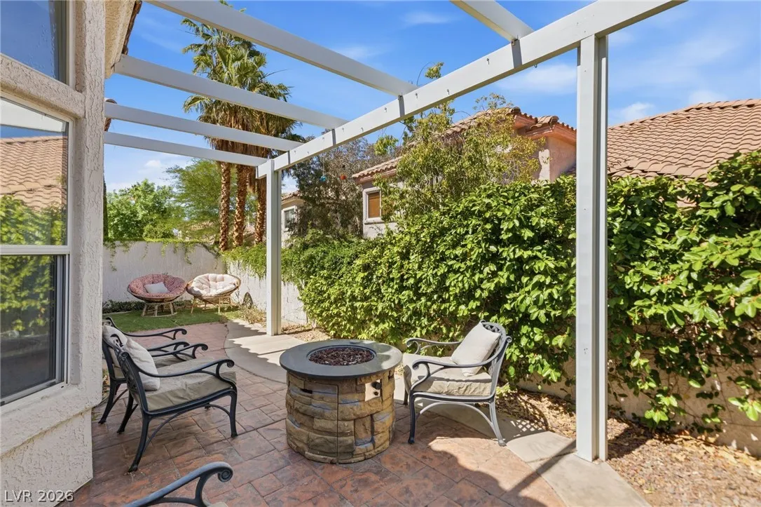Completely refreshed, brand new paint and pre-inspected: 100% move-in ready with no repairs or maintenance needed. Premium Summerlin location in a well-maintained gated community on a quiet, low-traffic interior lot. This single-story townhome lives like a single-family home with only one shared wall (garage side). Smart split floor plan: 2 bedrooms + 2 baths plus a den/office that easily converts to a 3rd bedroom. Spacious primary suite features a large slider to the private backyard, custom walk-in closet, and a spa-like bath with extended dual-sink vanity, large walk-in shower with full glass enclosure and soap niche, and a separate soaking tub. Granite counters, stainless steel appliances all included, plantation shutters throughout, ceiling fans, with the perfect touch of a fireplace in the living room. Clerestory windows and raised ceilings flood the home with natural light. Lush, low-maintenance landscape with a quaint backyard firepit. Brand new main water line.