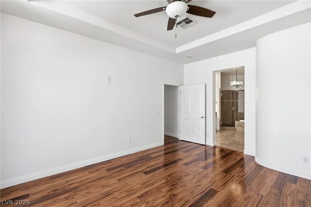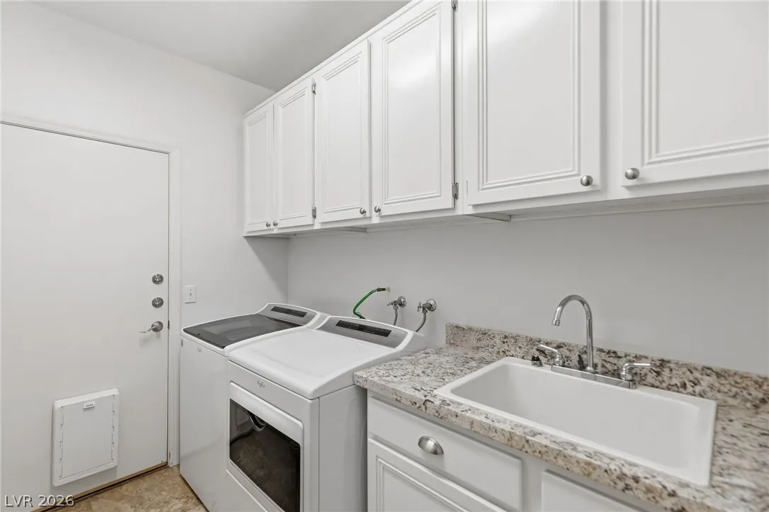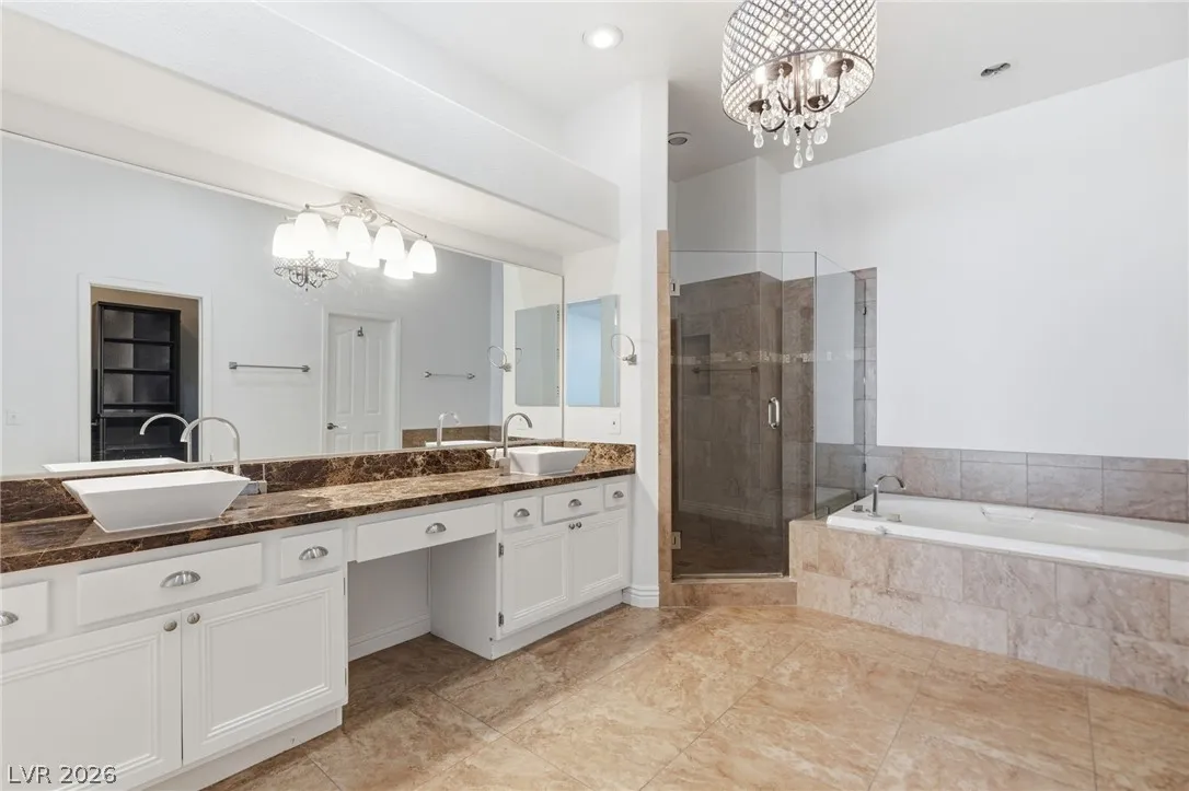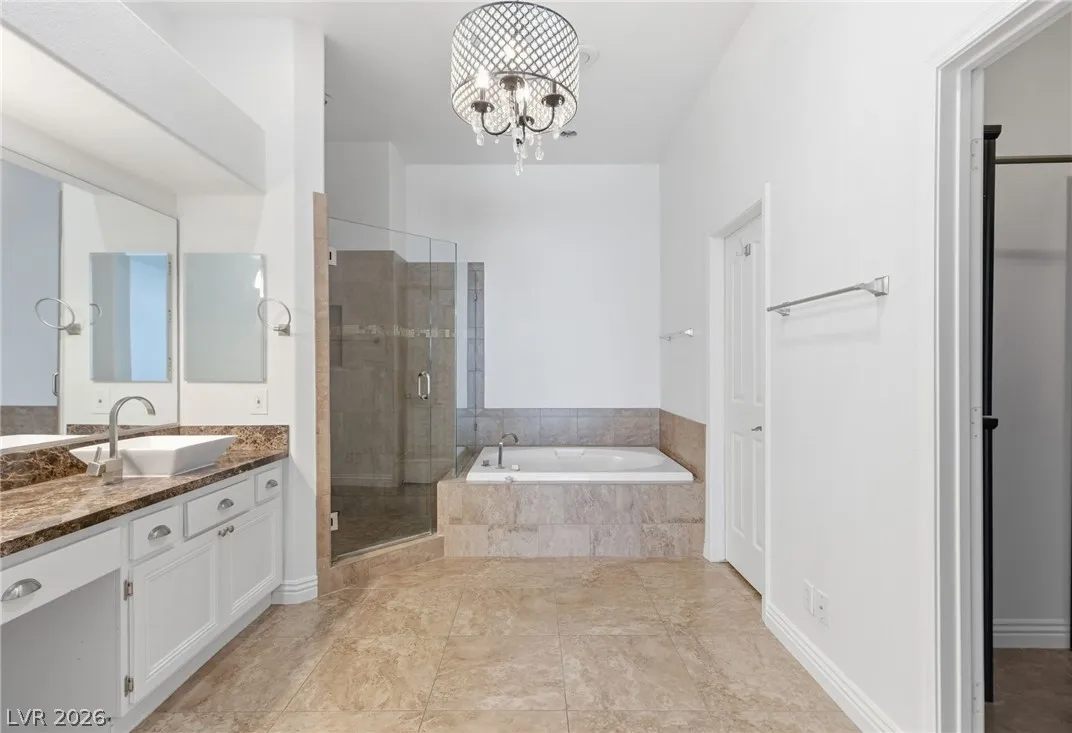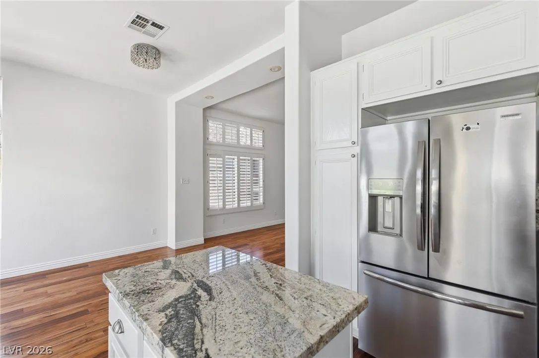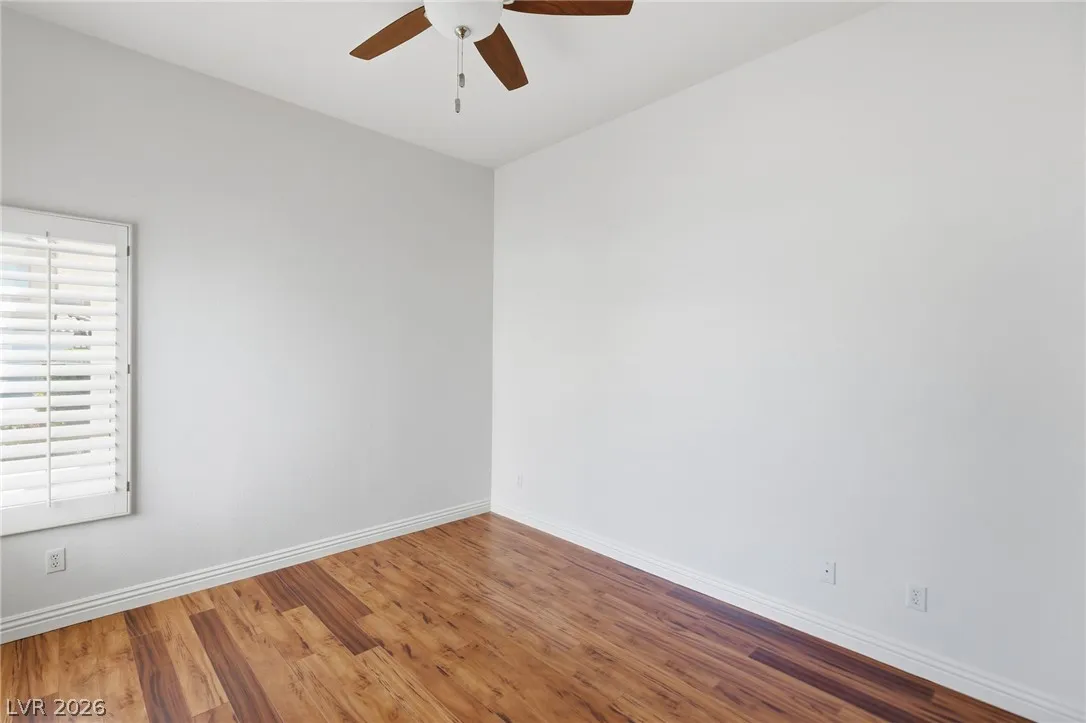 Completely refreshed, brand new paint and pre-inspected: 100% move-in ready with no repairs or maintenance needed. Premium Summerlin location in a well-maintained gated community on a quiet, low-traffic interior lot. This single-story townhome lives like a single-family home with only one shared wall (garage side). Smart split floor plan: 2 bedrooms + 2 baths plus a den/office that easily converts to a 3rd bedroom. Spacious primary suite features a large slider to the private backyard, custom walk-in closet, and a spa-like bath with extended dual-sink vanity, large walk-in shower with full glass enclosure and soap niche, and a separate soaking tub. Granite counters, stainless steel appliances all included, plantation shutters throughout, ceiling fans, with the perfect touch of a fireplace in the living room. Clerestory windows and raised ceilings flood the home with natural light. Lush, low-maintenance landscape with a quaint backyard firepit. Brand new main water line.