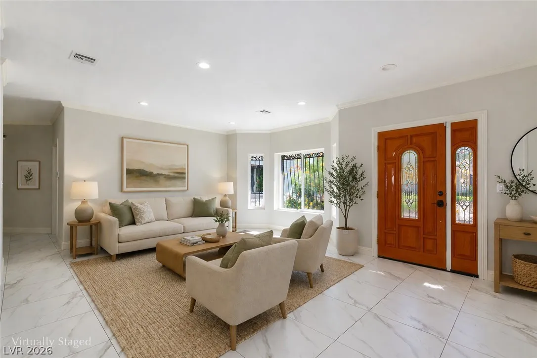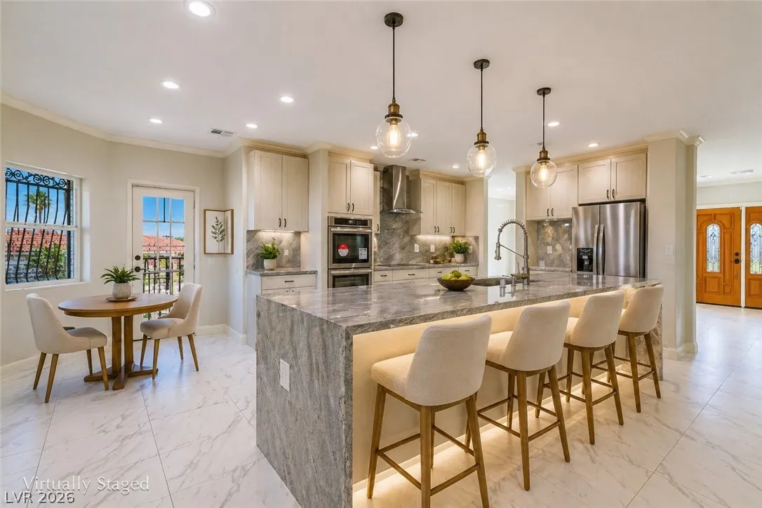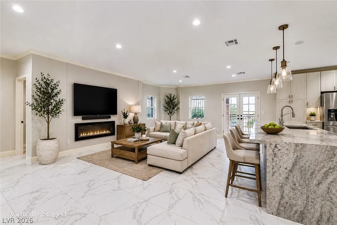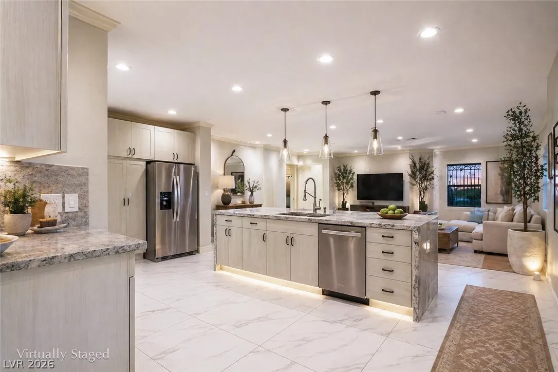 COMPLETELY REMODELED SINGLE STORY GEM WITH PANORAMIC BACKYARD MOUNTAIN VIEWS AND RV PARKING!!! Spectacular layout features 5 bedrooms and casita. 4 of the bedrooms have attached 3/4 bath. The kitchen has been redone with huge island that seats 5, stainless steel appliances, hooded vent, and pantry. Tile throughout, no carpet. There is a large great room with dining space to the side and additional formal living room space at the entry. The oversized master bedroom features large walk in closet with custom shelving. Master bath comes with separate jetted tub and walk in shower along with double sinks. Separate laundry has a sink and folding area. Additional washer and dryer set in the finished garage with epoxy floor, if needed. The backyard includes a full length covered patio, low maintenance landscaping with shrubs, synthetic grass, and a conversation fire pit. The gated side lot can accommodate multiple vehicles or an RV and measures approximately 90×36. Only expense is power bill!