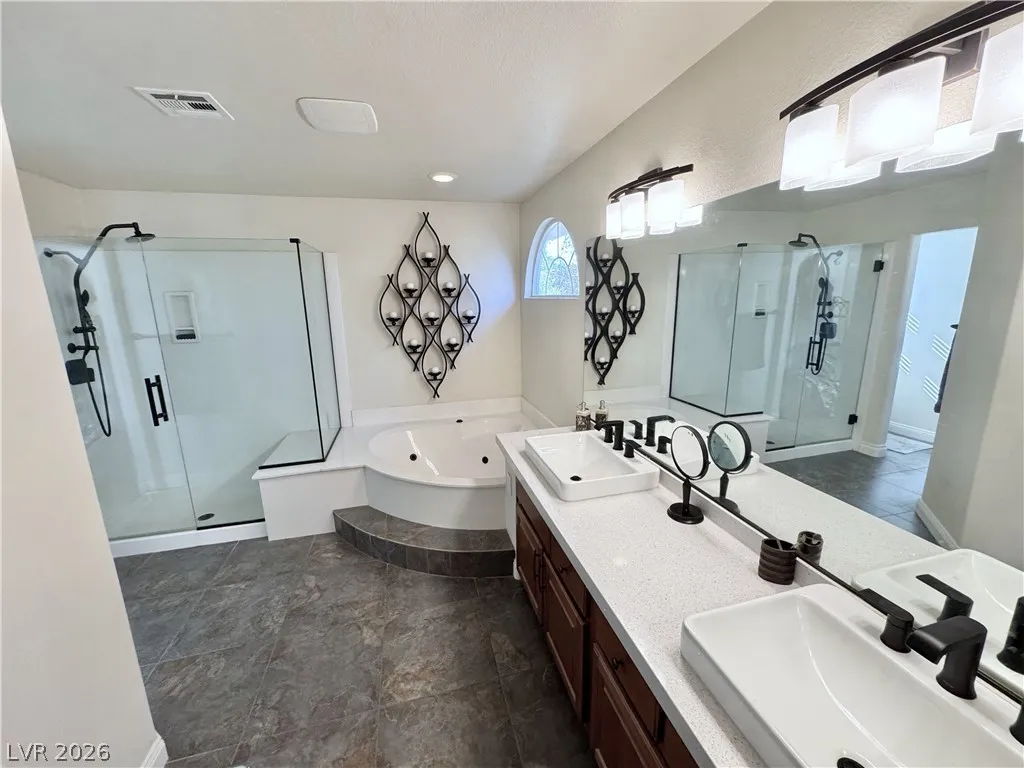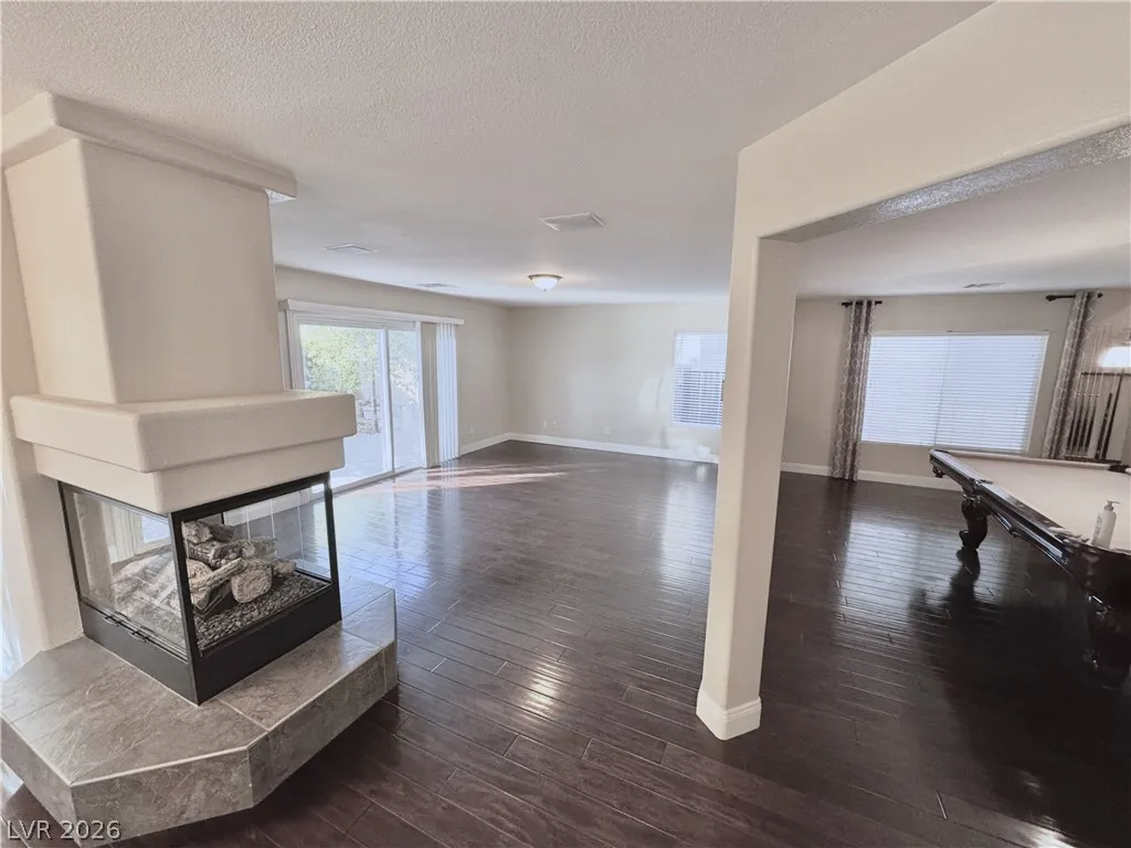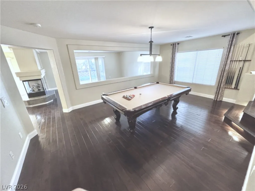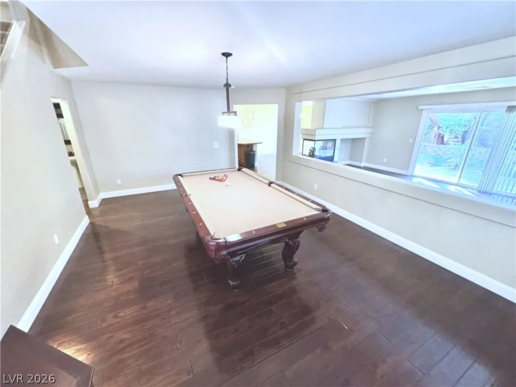 Remodeled primary bath features a jetted tub and oversized shower with thick glass. Blinds and window coverings included (except primary curtains). Kitchen includes a wine/beverage fridge. Garage has custom floor tiles. Family room and upstairs wired for surround sound (speakers included). Cat-5 wiring throughout, owned ADT system, and new water softener. Pool table (family room) and desk (Bed 4) included. Convenient to shopping, airport, and freeways.
