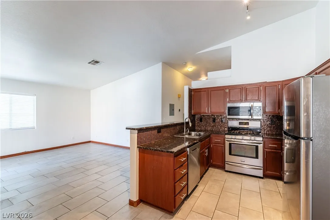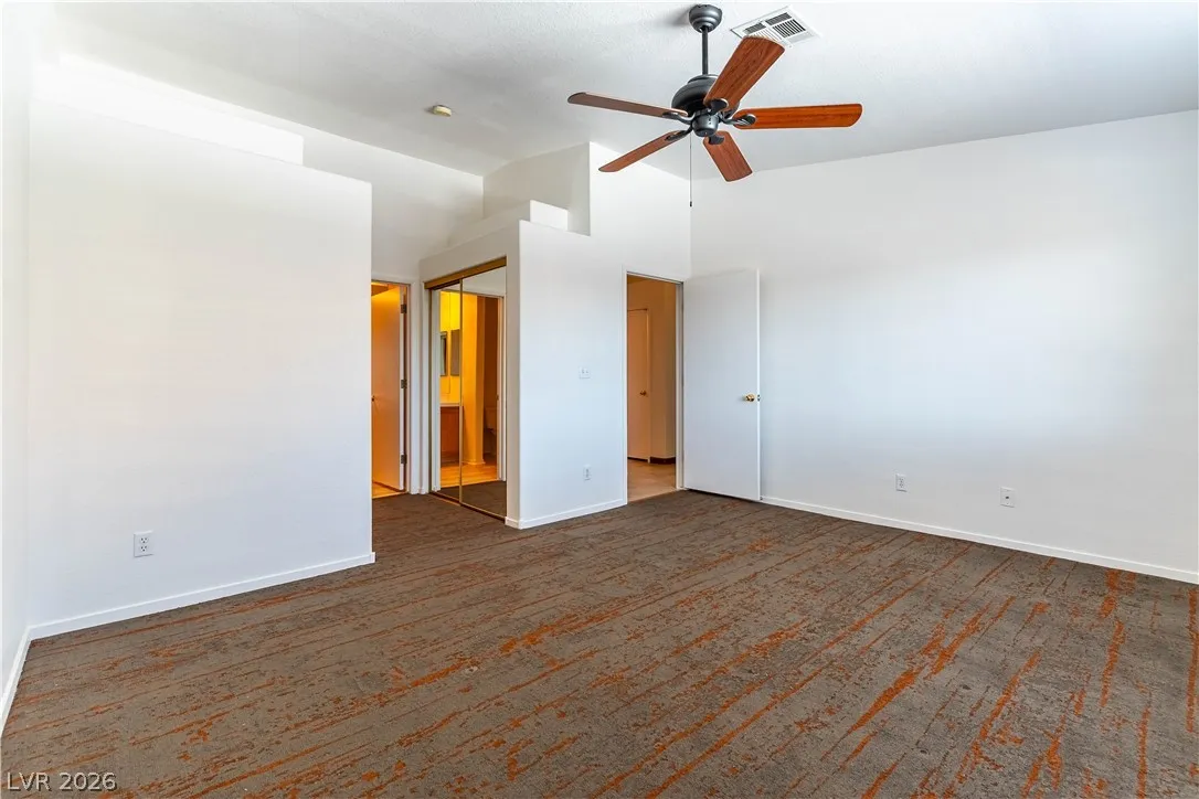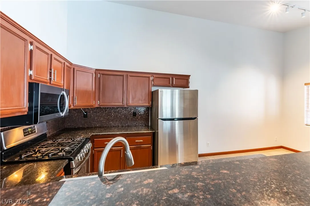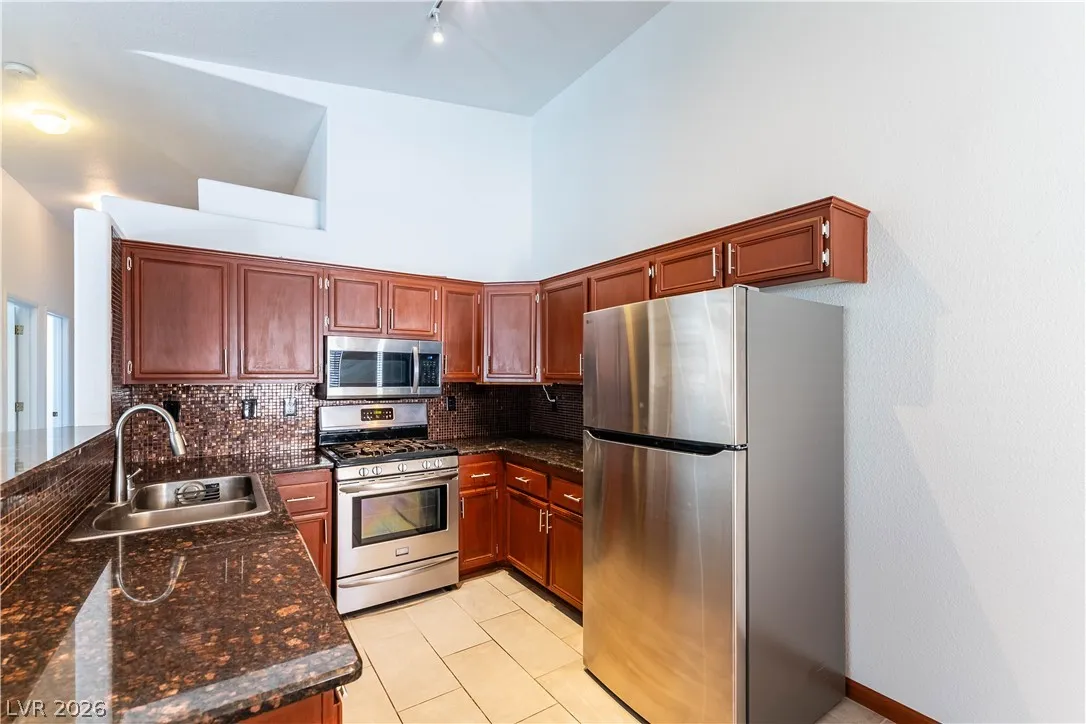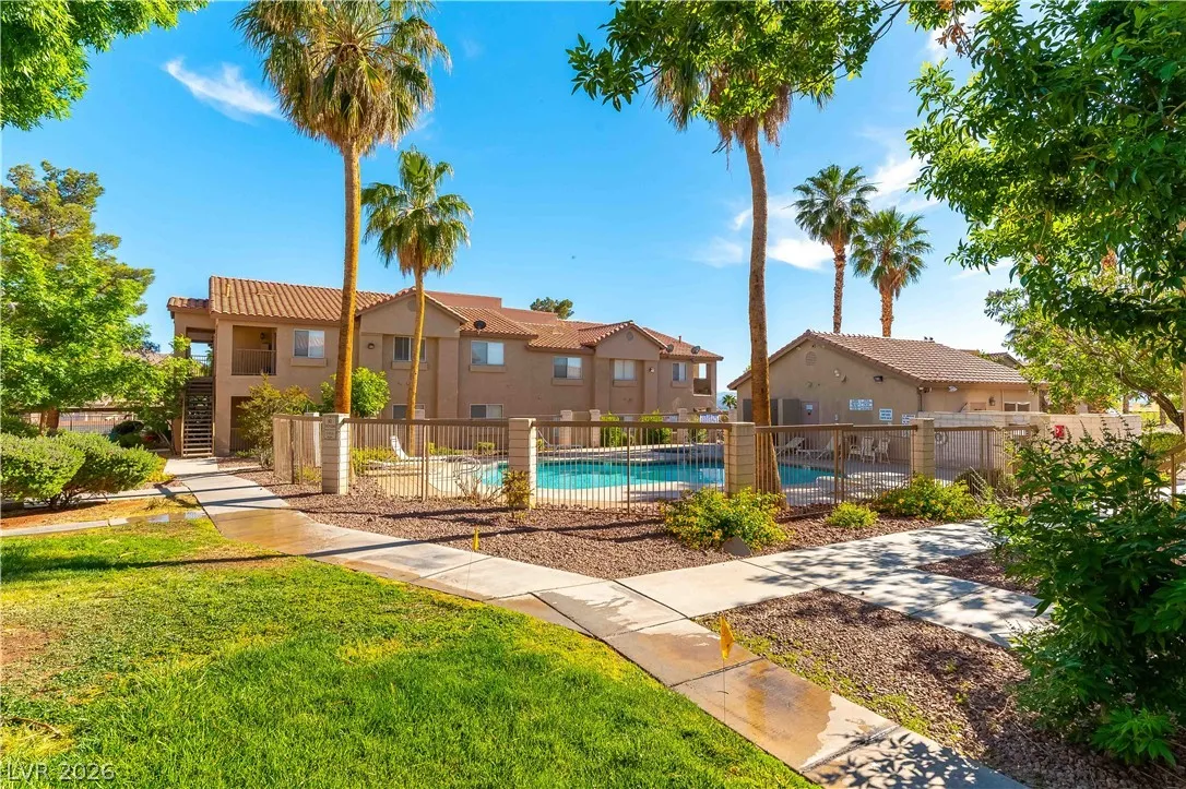 Welcome to this *SPOTLESS* move-in ready condo in Sunrise Bay, a hidden gem gated neighborhood w/ onsite RV parking! This spacious, highly upgraded 2 bed, 2 full bath upstairs unit with balcony is the largest floorplan available, with breathtaking mountain & strip views! *FHA & VA approved* Enter to a 2-way fireplace and large great room w/ vaulted ceiling, tile floors, wood blinds & baseboards. *Top end* kitchen features upgraded cabinets w/ hardware, deep stainless steel sink, all stainless steel appliances, granite countertops, full wall backsplash & breakfast bar. Brand new paint! Large primary bedroom w/ ceiling fan, walk in closet, dual sinks & upgraded faucets. Mirrored closet doors in both bedrooms. *All appliances included!* Newer water heater & newer garbage disposal. Multiple community pools & spa, BBQ & picnic table area. Low HOA dues & super low taxes. HOA pays water, trash & sewer! Gas appliances saves $ on electric bills vs most other condos. Schedule your tour today!