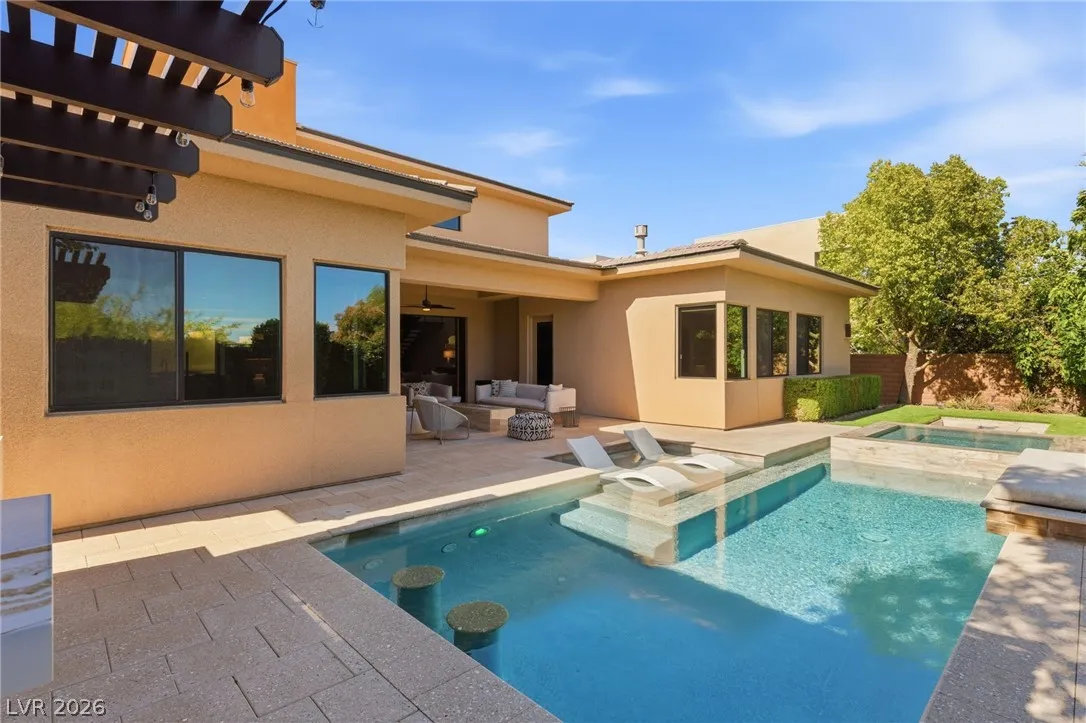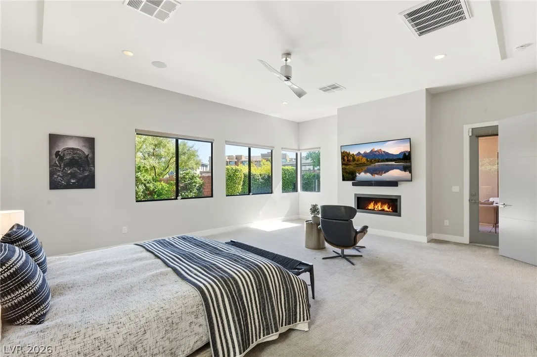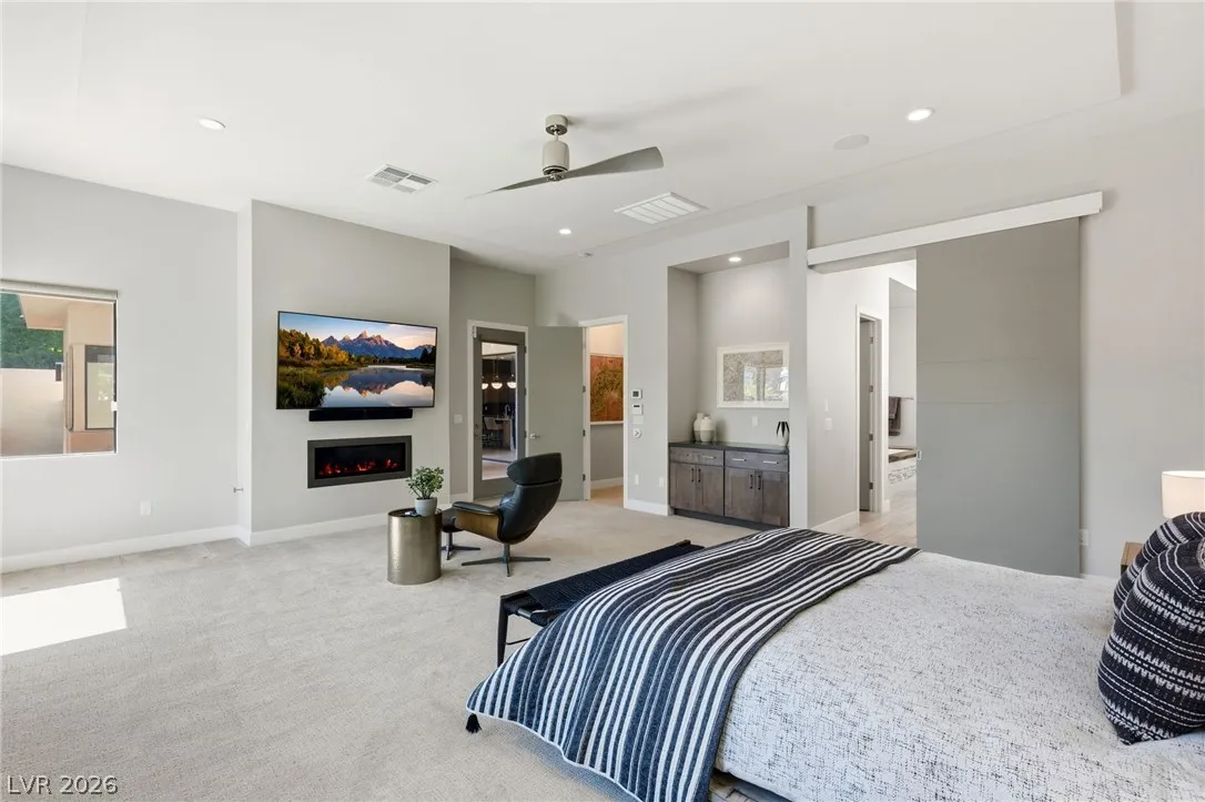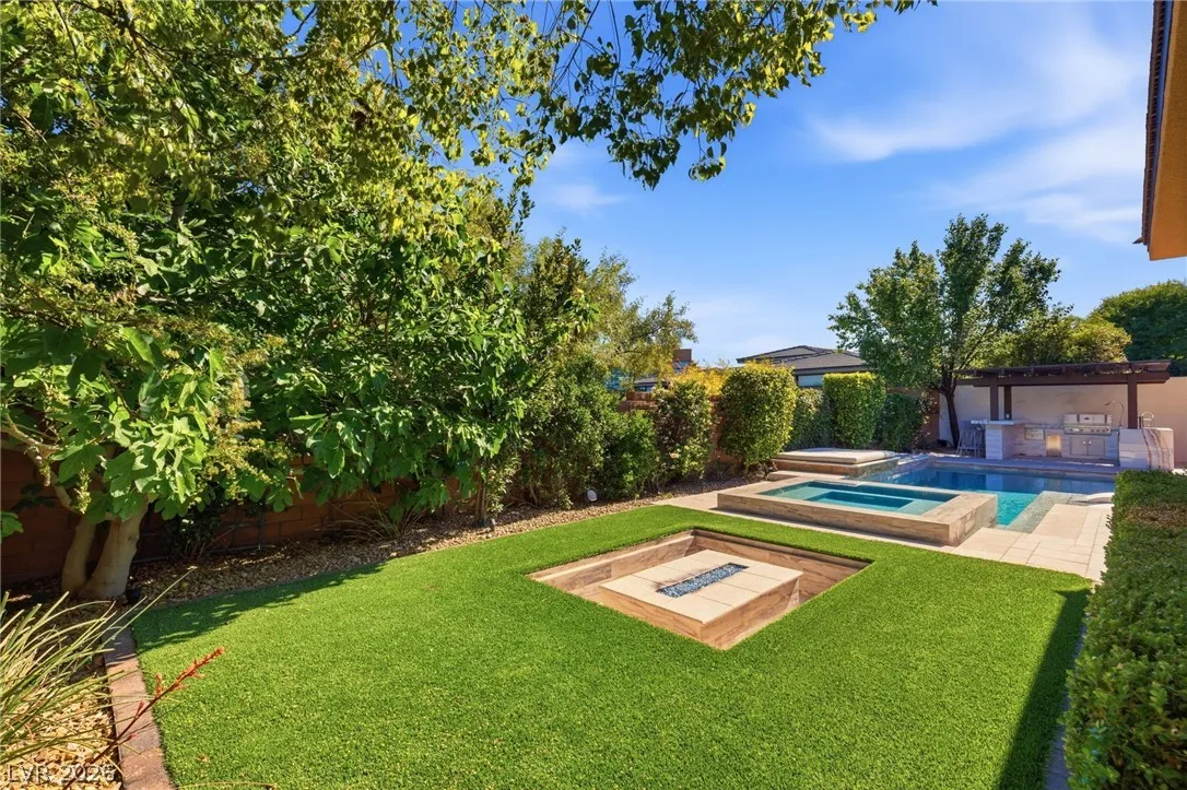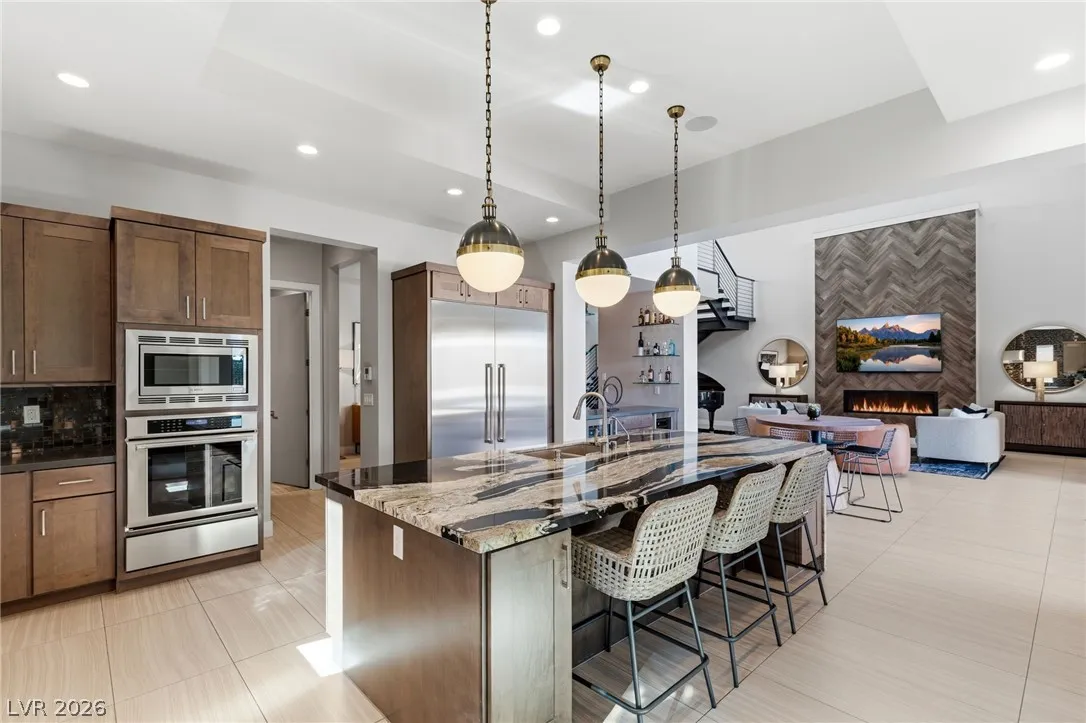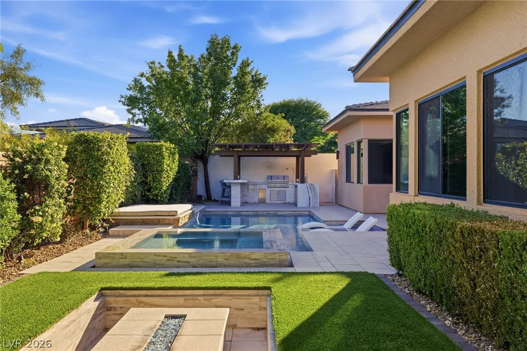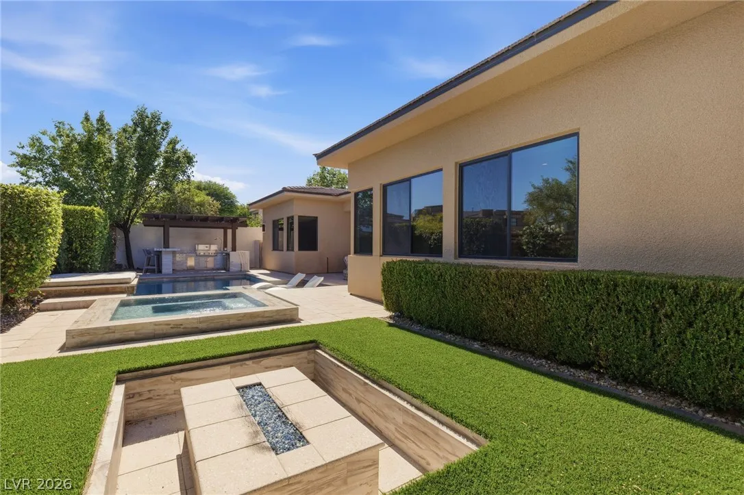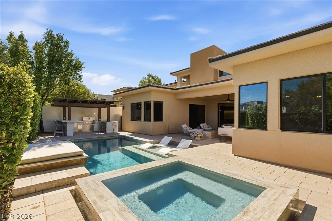Positioned within the guard-gated The Ridges, this Sterling Ridge home delivers a balance of clean architecture and elevated comfort. A statement pivot entry opens to an airy great room, where dramatic ceiling lines, a contemporary fireplace, and a full wall of pocketing glass create a seamless indoor-outdoor flow. The backyard offers a rare sense of privacy with no homes behind, designed as a true escape with a resort-style pool and spa, fire feature, and outdoor kitchen ideal for entertaining. On the main level, the primary suite is a private retreat with its own lounge area and fireplace, paired with a spa-like bath featuring dual vanities, soaking tub, oversized shower, and custom closet. A separate den provides flexible use. Upstairs, two ensuite bedrooms, a loft with bath and wet bar, and a private balcony complete the home.
