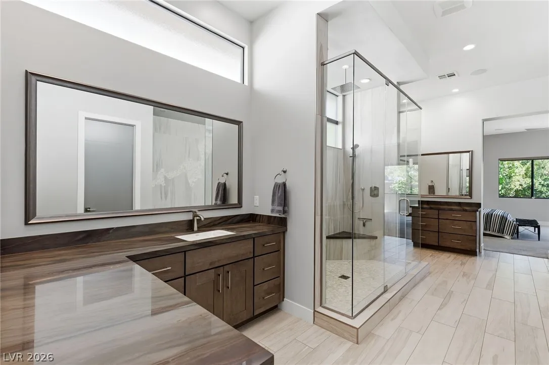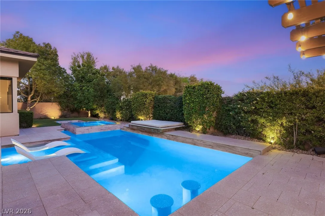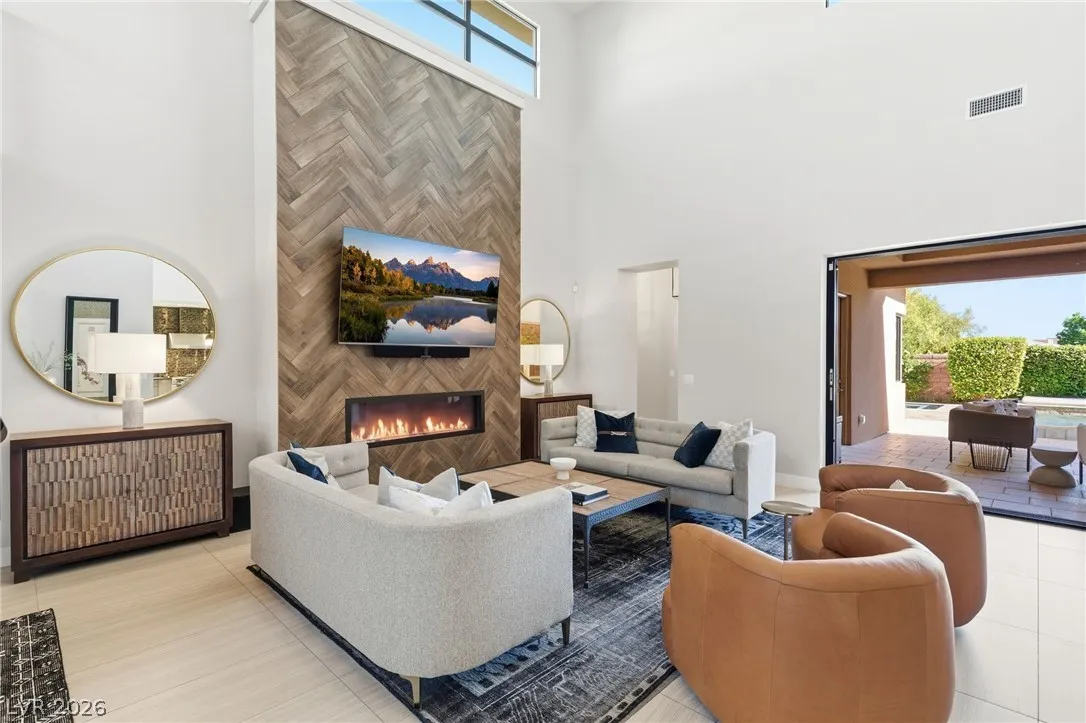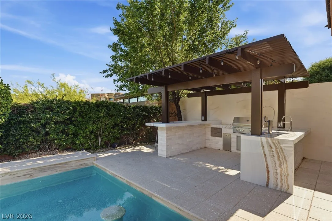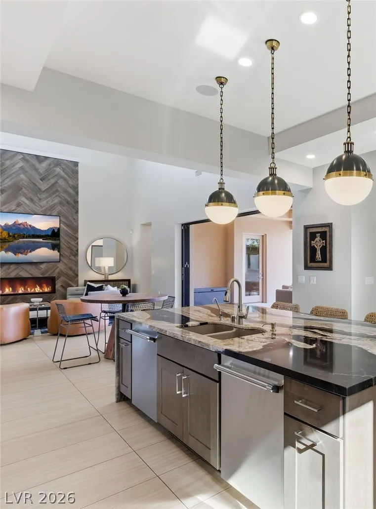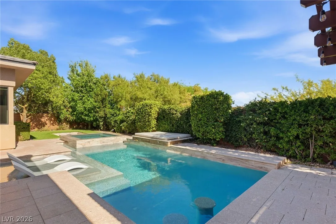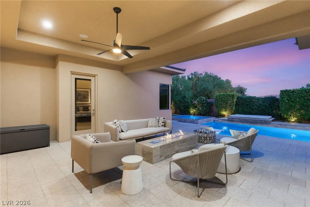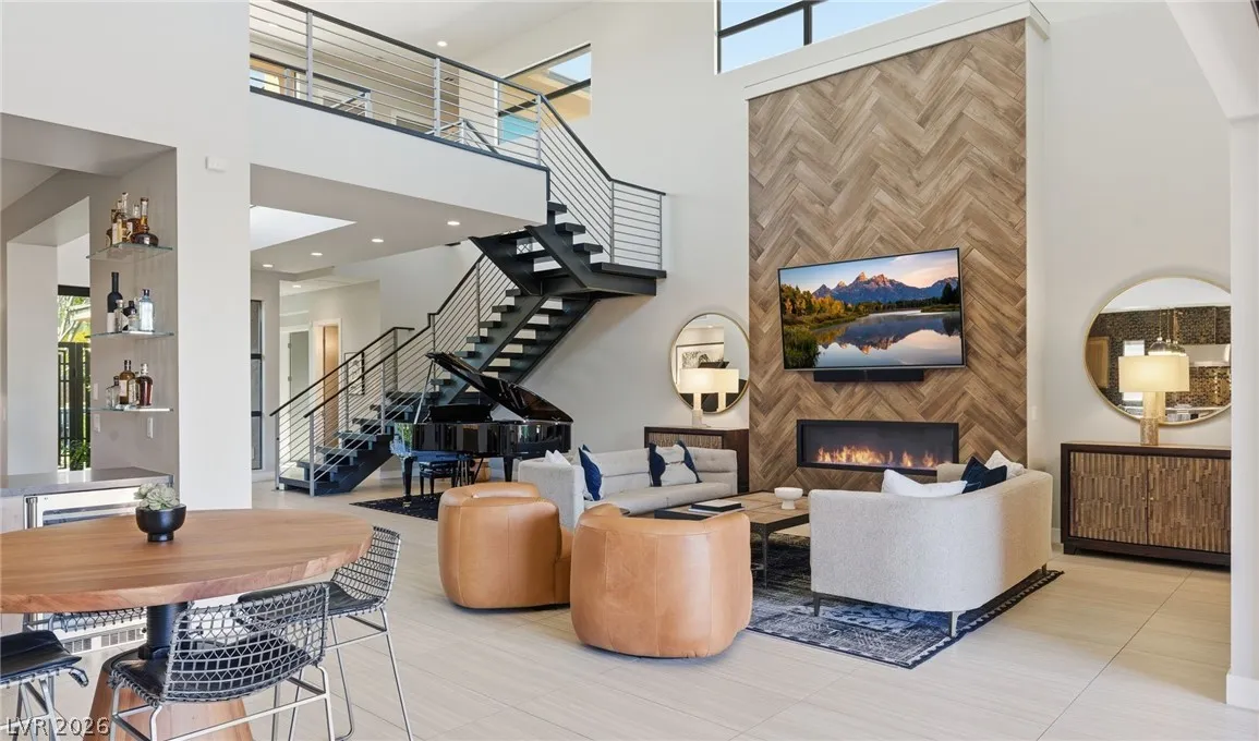Positioned within the guard-gated The Ridges, this Sterling Ridge home delivers a balance of clean architecture and elevated comfort. A statement pivot entry opens to an airy great room, where dramatic ceiling lines, a contemporary fireplace, and a full wall of pocketing glass create a seamless indoor-outdoor flow. The backyard offers a rare sense of privacy with no homes behind, designed as a true escape with a resort-style pool and spa, fire feature, and outdoor kitchen ideal for entertaining. On the main level, the primary suite is a private retreat with its own lounge area and fireplace, paired with a spa-like bath featuring dual vanities, soaking tub, oversized shower, and custom closet. A separate den provides flexible use. Upstairs, two ensuite bedrooms, a loft with bath and wet bar, and a private balcony complete the home.