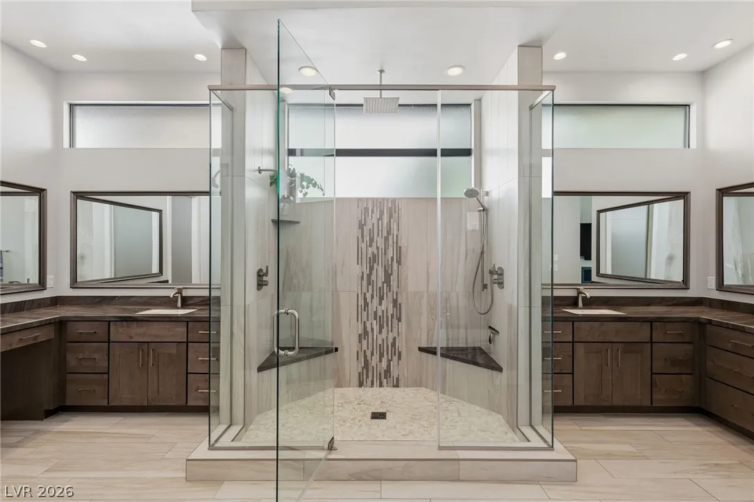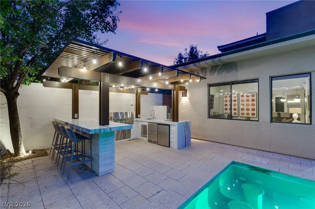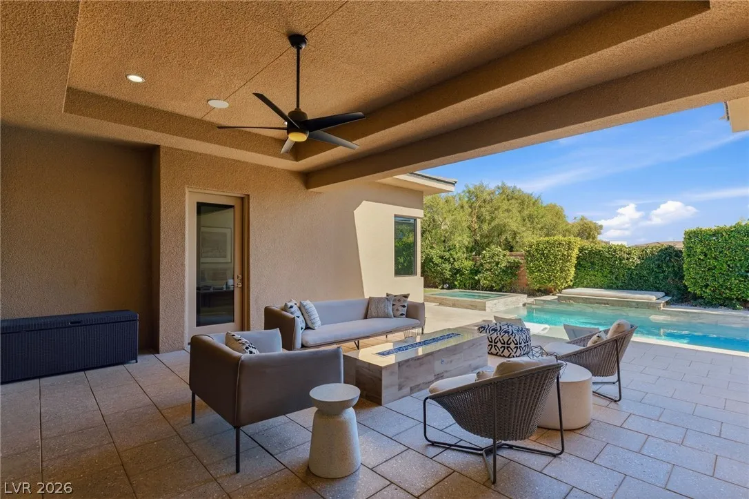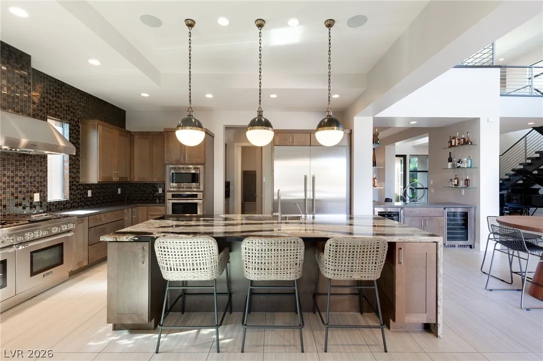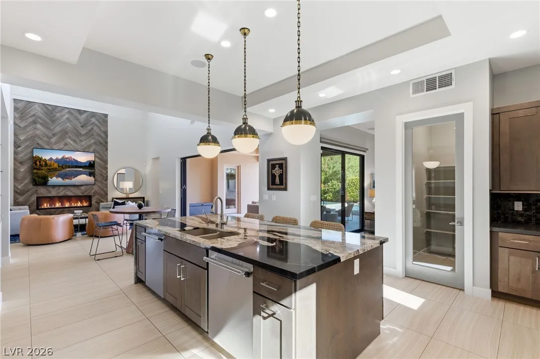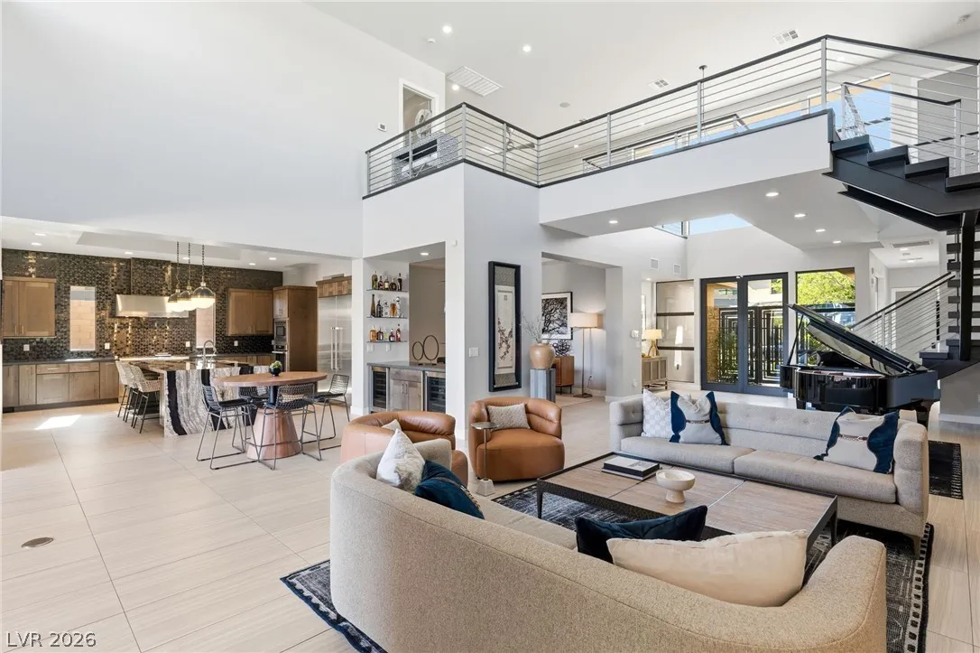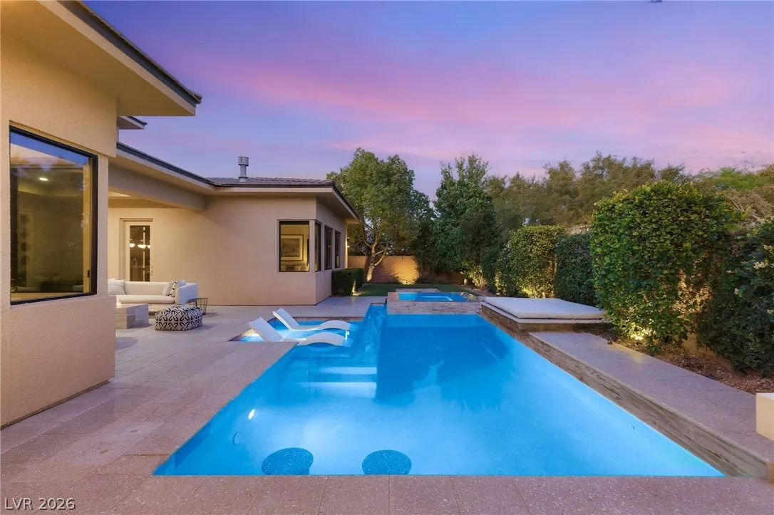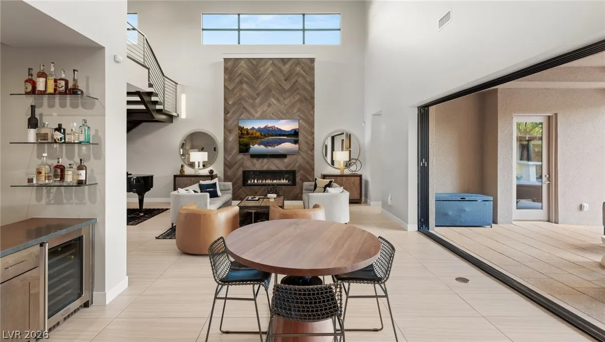 Positioned within the guard-gated The Ridges, this Sterling Ridge home delivers a balance of clean architecture and elevated comfort. A statement pivot entry opens to an airy great room, where dramatic ceiling lines, a contemporary fireplace, and a full wall of pocketing glass create a seamless indoor-outdoor flow. The backyard offers a rare sense of privacy with no homes behind, designed as a true escape with a resort-style pool and spa, fire feature, and outdoor kitchen ideal for entertaining. On the main level, the primary suite is a private retreat with its own lounge area and fireplace, paired with a spa-like bath featuring dual vanities, soaking tub, oversized shower, and custom closet. A separate den provides flexible use. Upstairs, two ensuite bedrooms, a loft with bath and wet bar, and a private balcony complete the home.