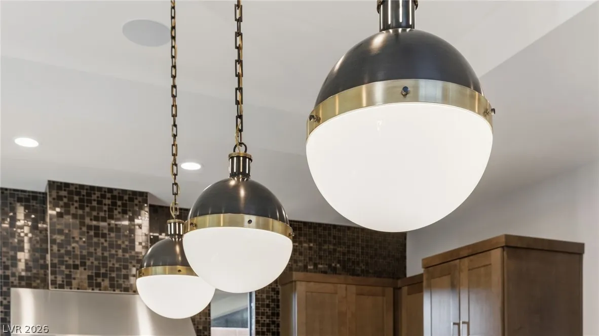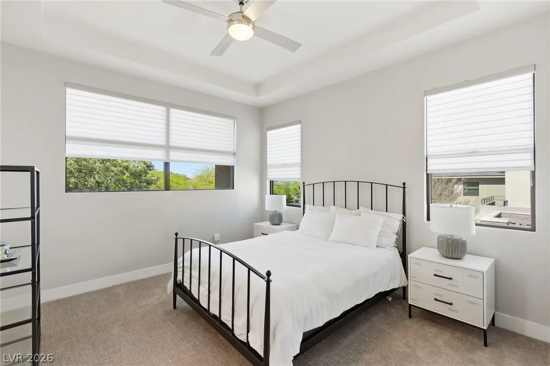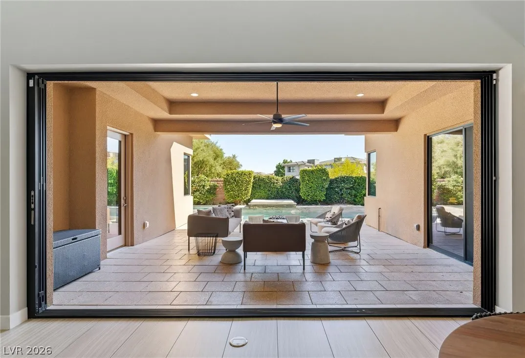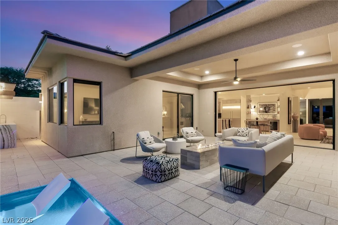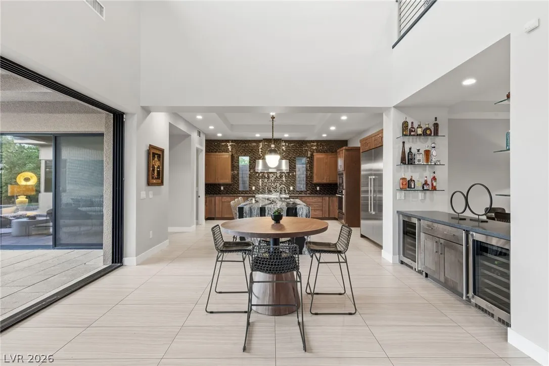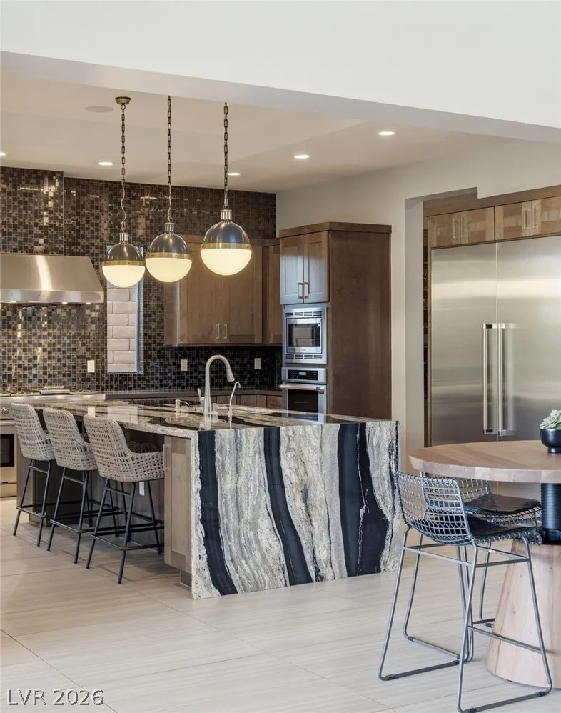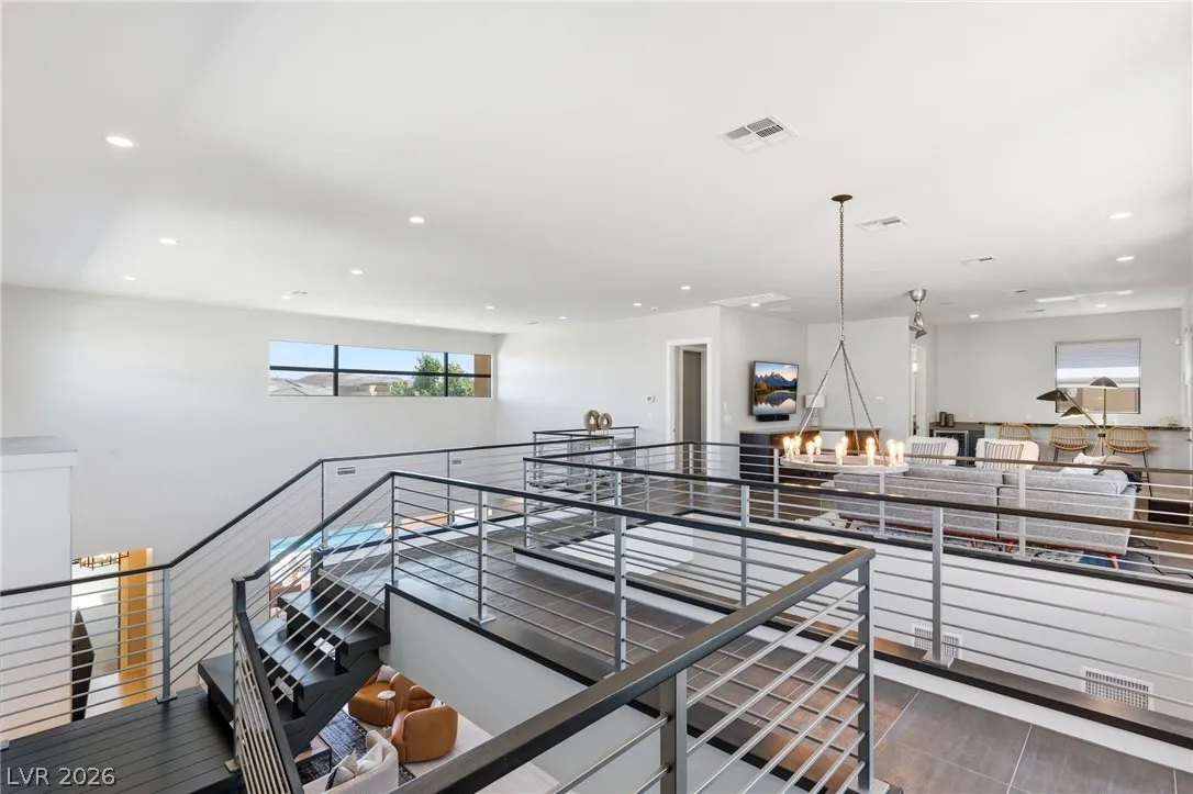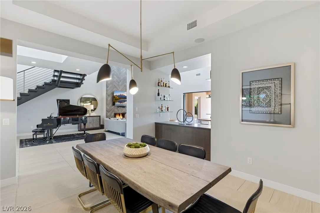 Positioned within the guard-gated The Ridges, this Sterling Ridge home delivers a balance of clean architecture and elevated comfort. A statement pivot entry opens to an airy great room, where dramatic ceiling lines, a contemporary fireplace, and a full wall of pocketing glass create a seamless indoor-outdoor flow. The backyard offers a rare sense of privacy with no homes behind, designed as a true escape with a resort-style pool and spa, fire feature, and outdoor kitchen ideal for entertaining. On the main level, the primary suite is a private retreat with its own lounge area and fireplace, paired with a spa-like bath featuring dual vanities, soaking tub, oversized shower, and custom closet. A separate den provides flexible use. Upstairs, two ensuite bedrooms, a loft with bath and wet bar, and a private balcony complete the home.