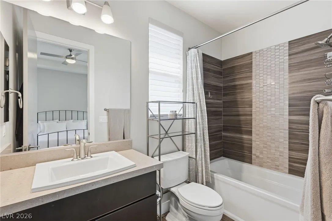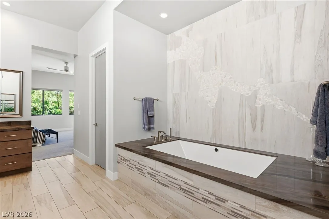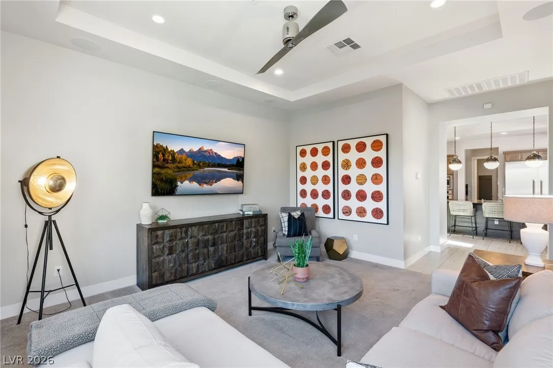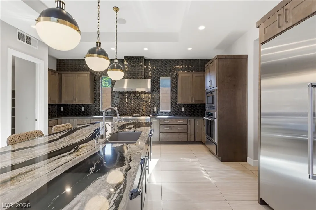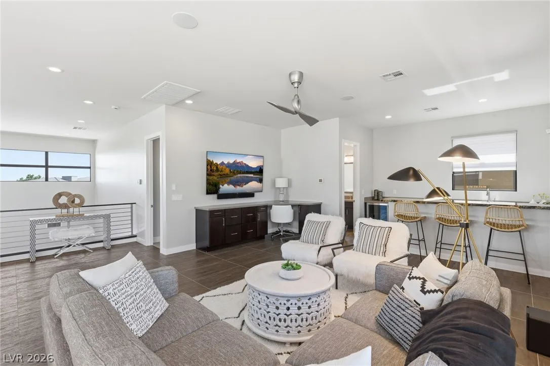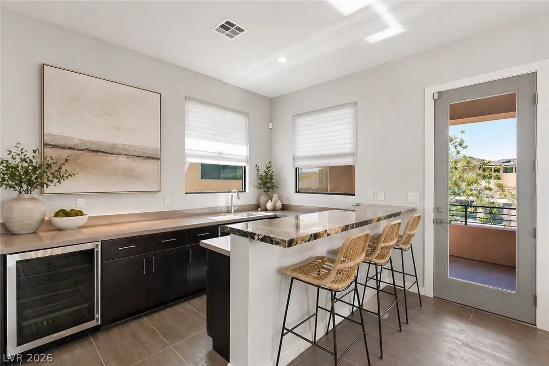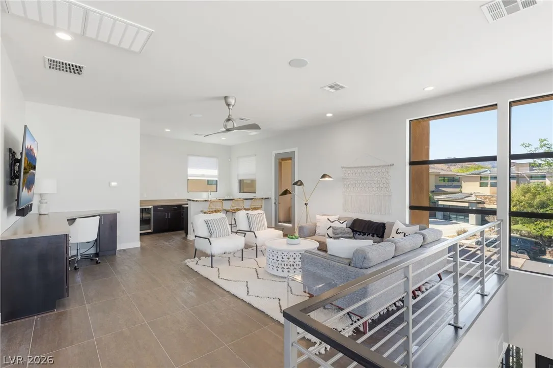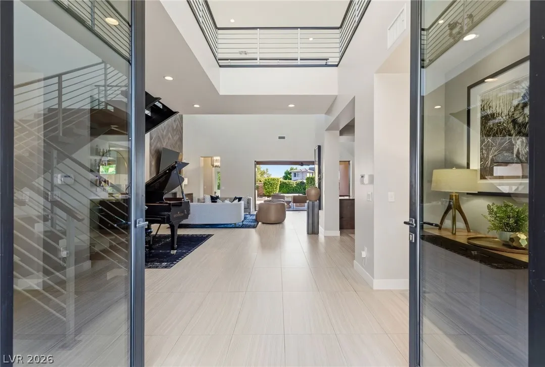 Positioned within the guard-gated The Ridges, this Sterling Ridge home delivers a balance of clean architecture and elevated comfort. A statement pivot entry opens to an airy great room, where dramatic ceiling lines, a contemporary fireplace, and a full wall of pocketing glass create a seamless indoor-outdoor flow. The backyard offers a rare sense of privacy with no homes behind, designed as a true escape with a resort-style pool and spa, fire feature, and outdoor kitchen ideal for entertaining. On the main level, the primary suite is a private retreat with its own lounge area and fireplace, paired with a spa-like bath featuring dual vanities, soaking tub, oversized shower, and custom closet. A separate den provides flexible use. Upstairs, two ensuite bedrooms, a loft with bath and wet bar, and a private balcony complete the home.
