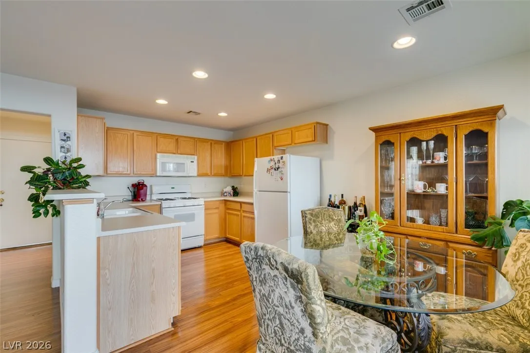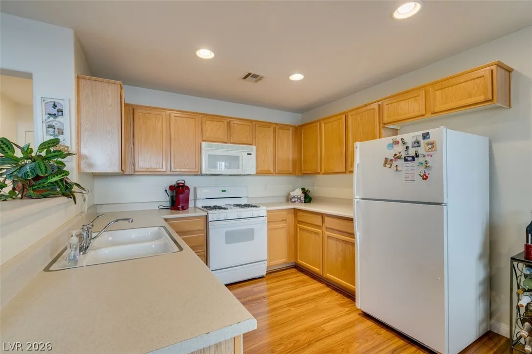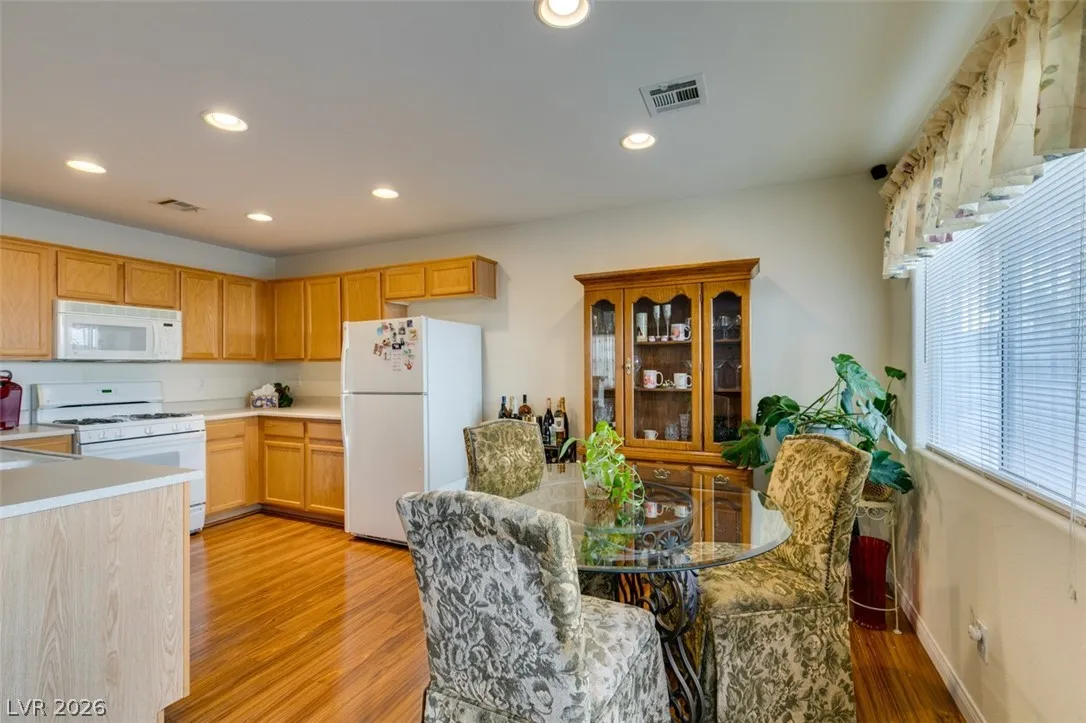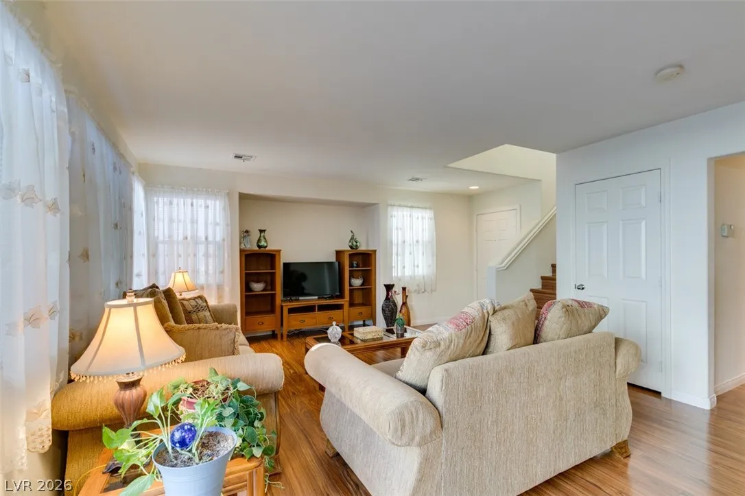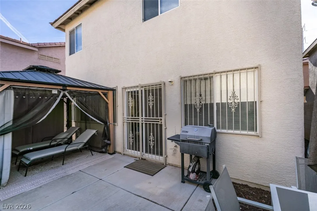 Beautifully updated and well maintained 4 bed, 3 bath, 2 story home located in the gated Silverado Courtyards community of Silverado Ranch. Upgraded wood-like laminate flooring throughout both levels and all 4 bedrooms. Primary bath features a custom shower with iridescent tile walls. The spacious primary bedroom has plenty of windows for natural light and comes complete with a walk-in closet. All four bedrooms have a ceiling fan with light. Separate laundry room conveniently located upstairs. The open concept downstairs connects a large living room to the dining area and kitchen. Low maintenance backyard featuring a gazebo for added shade and relaxation. All appliances convey with the sale. Convenient location near dozens of West Henderson amenities including restaurants, shopping, Costco, Chicken n Pickle and the future state of the art West Henderson Recreational Center.